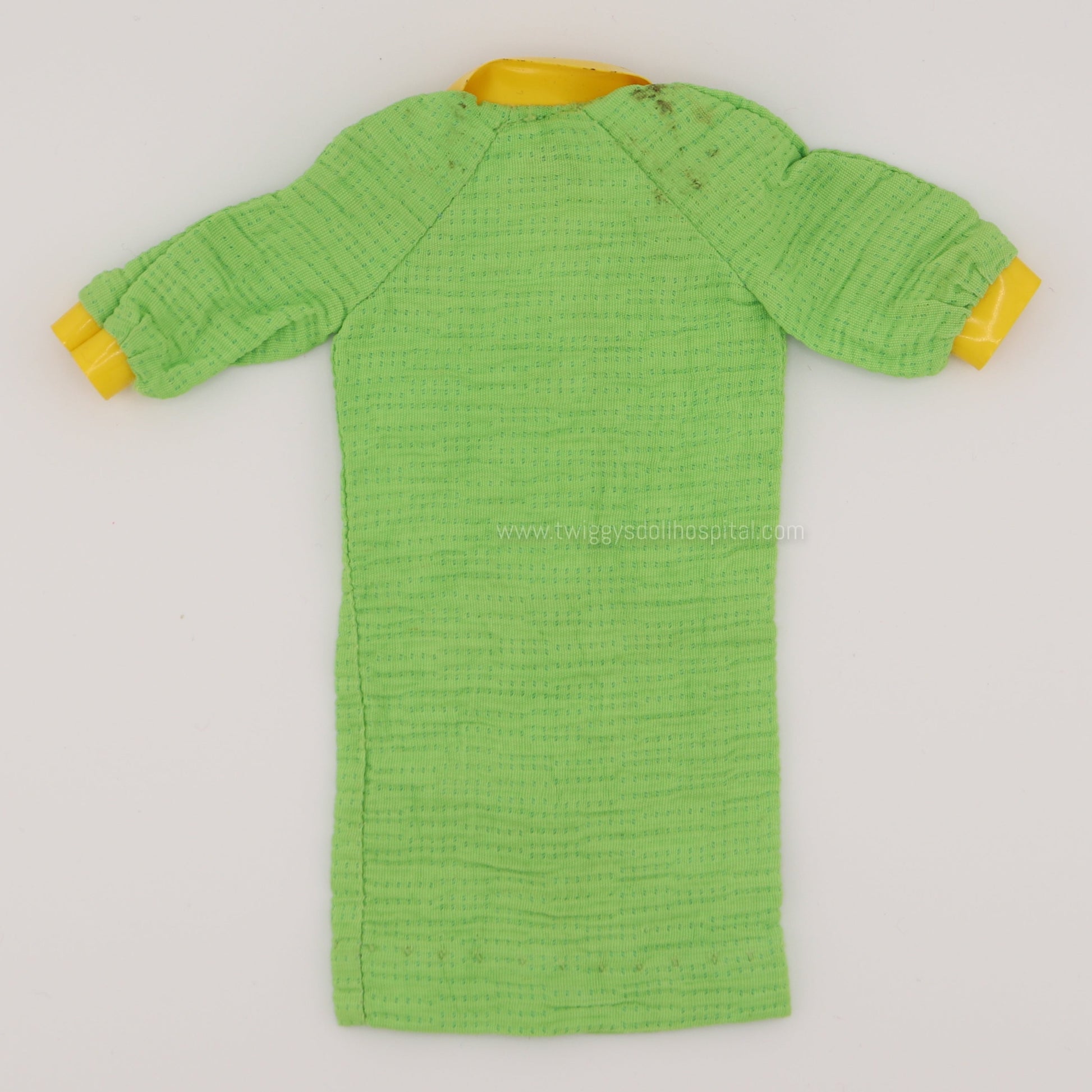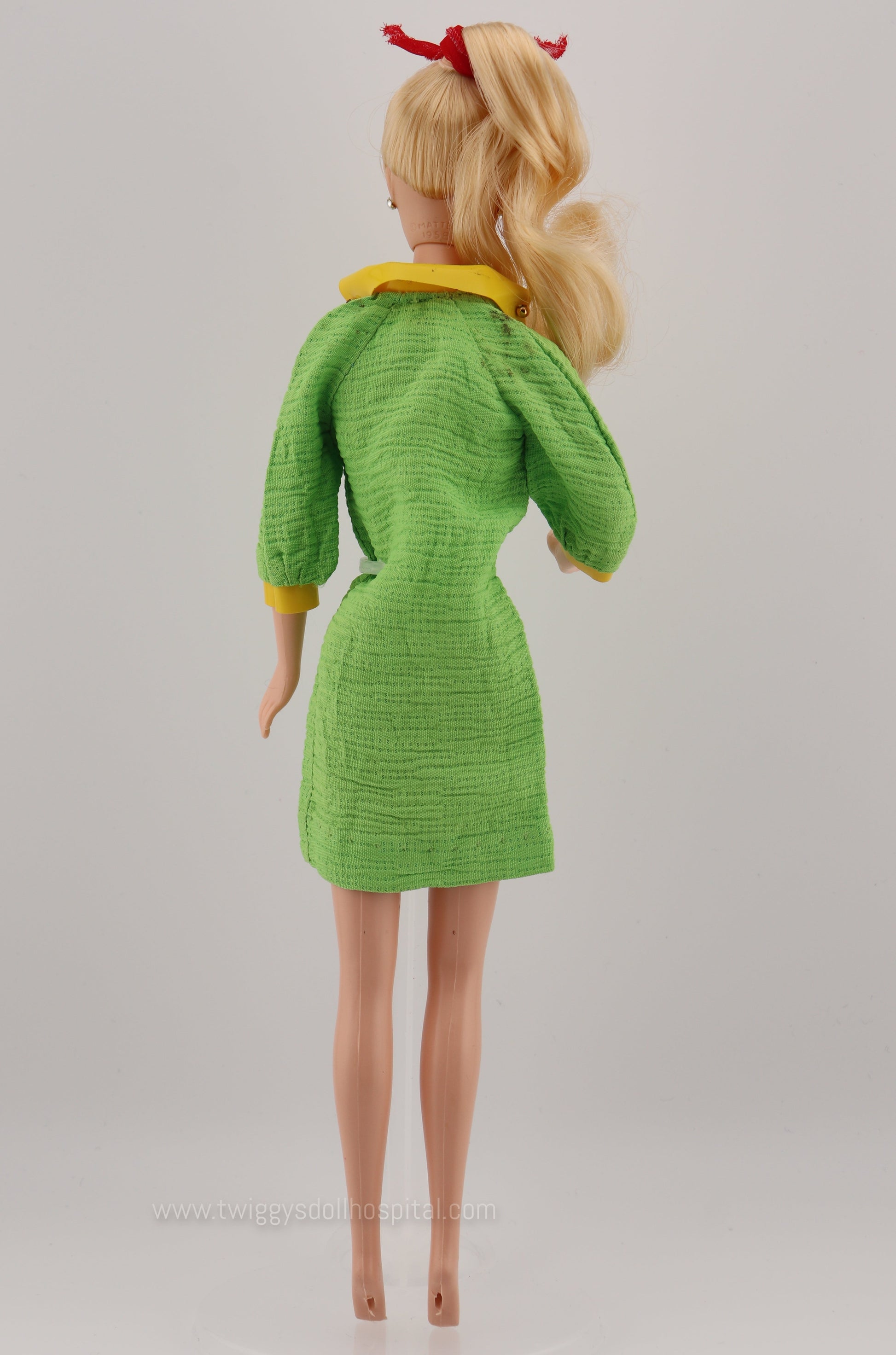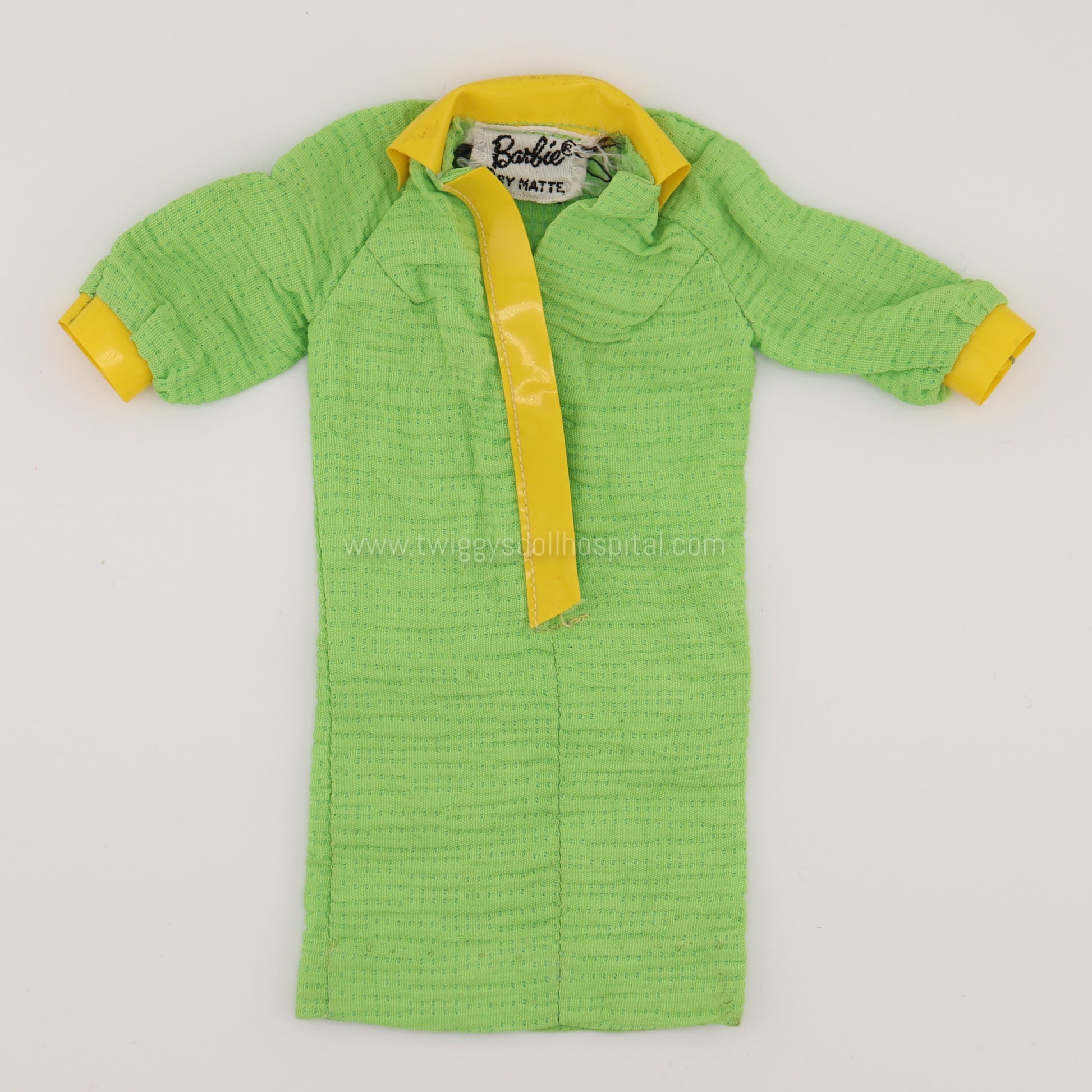 This dress is from 1968 and is such a fun piece to add to any vintage collection. The green and bright yellow give such a fun mod vibe to this shirt dress. This dress does have some clear imperfections and is sold as is. This listing is for the outfit only. Doll not included.