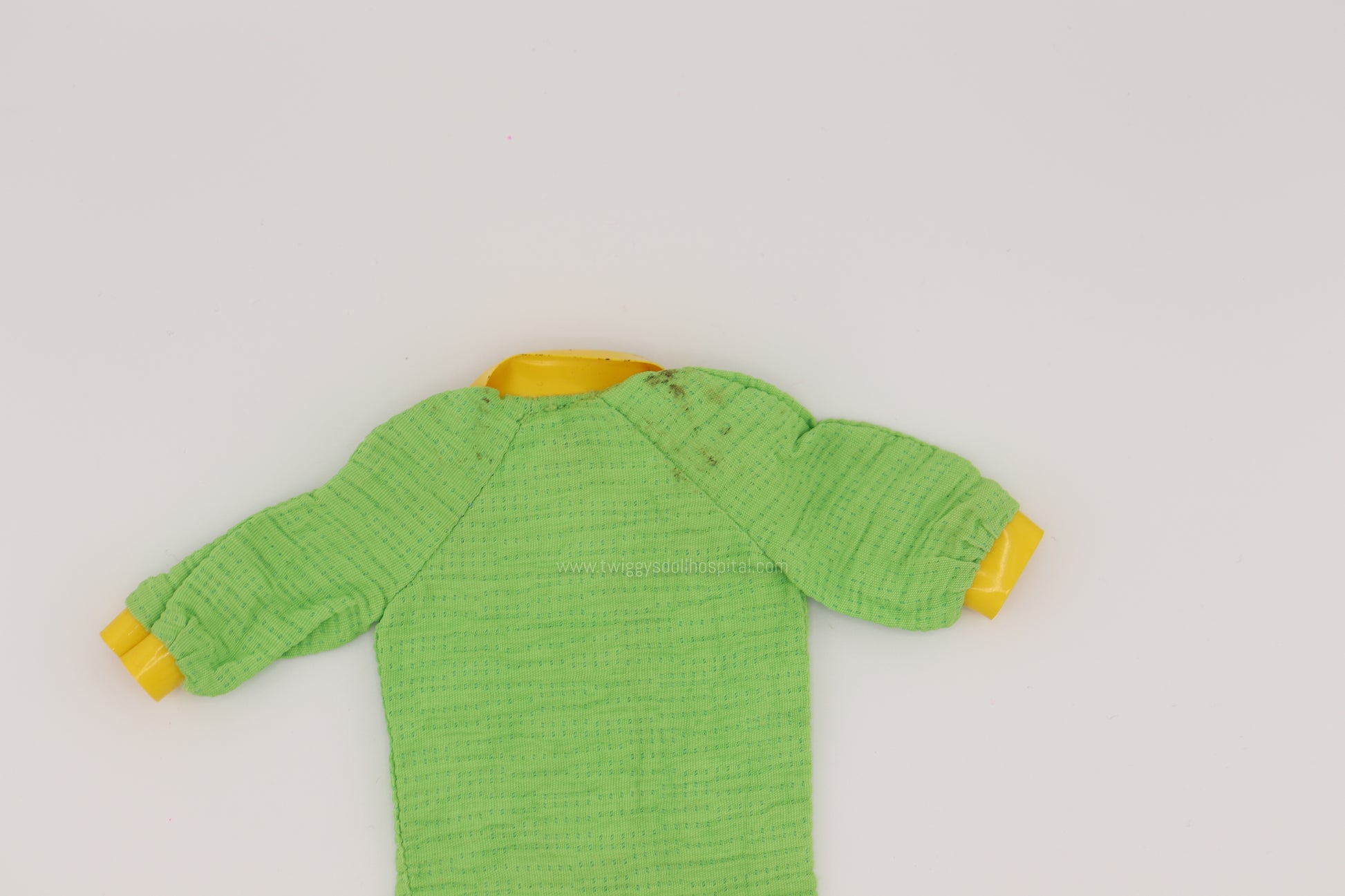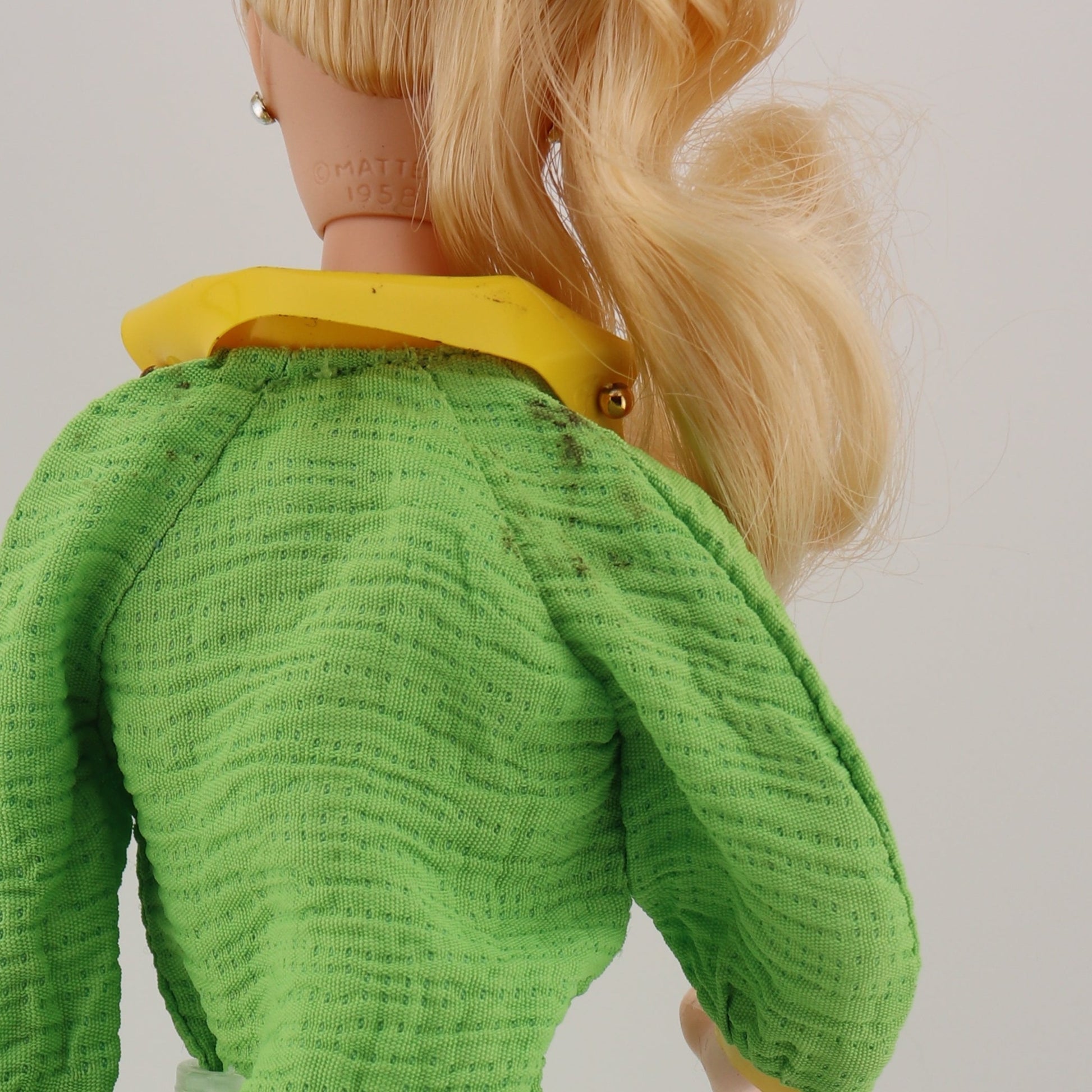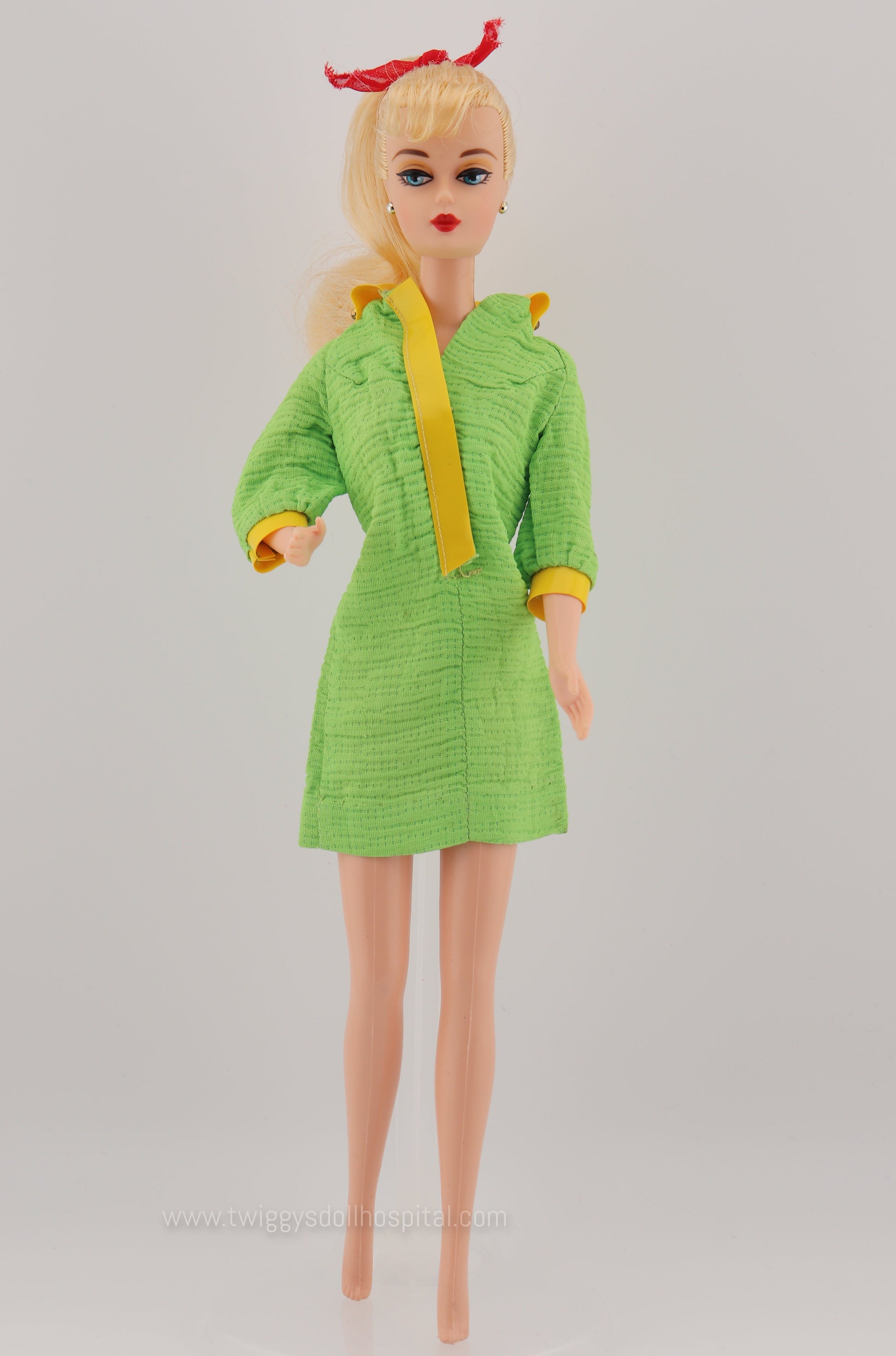 This dress is from 1968 and is such a fun piece to add to any vintage collection. The green and bright yellow give such a fun mod vibe to this shirt dress. This dress does have some clear imperfections and is sold as is. This listing is for the outfit only. Doll not included.