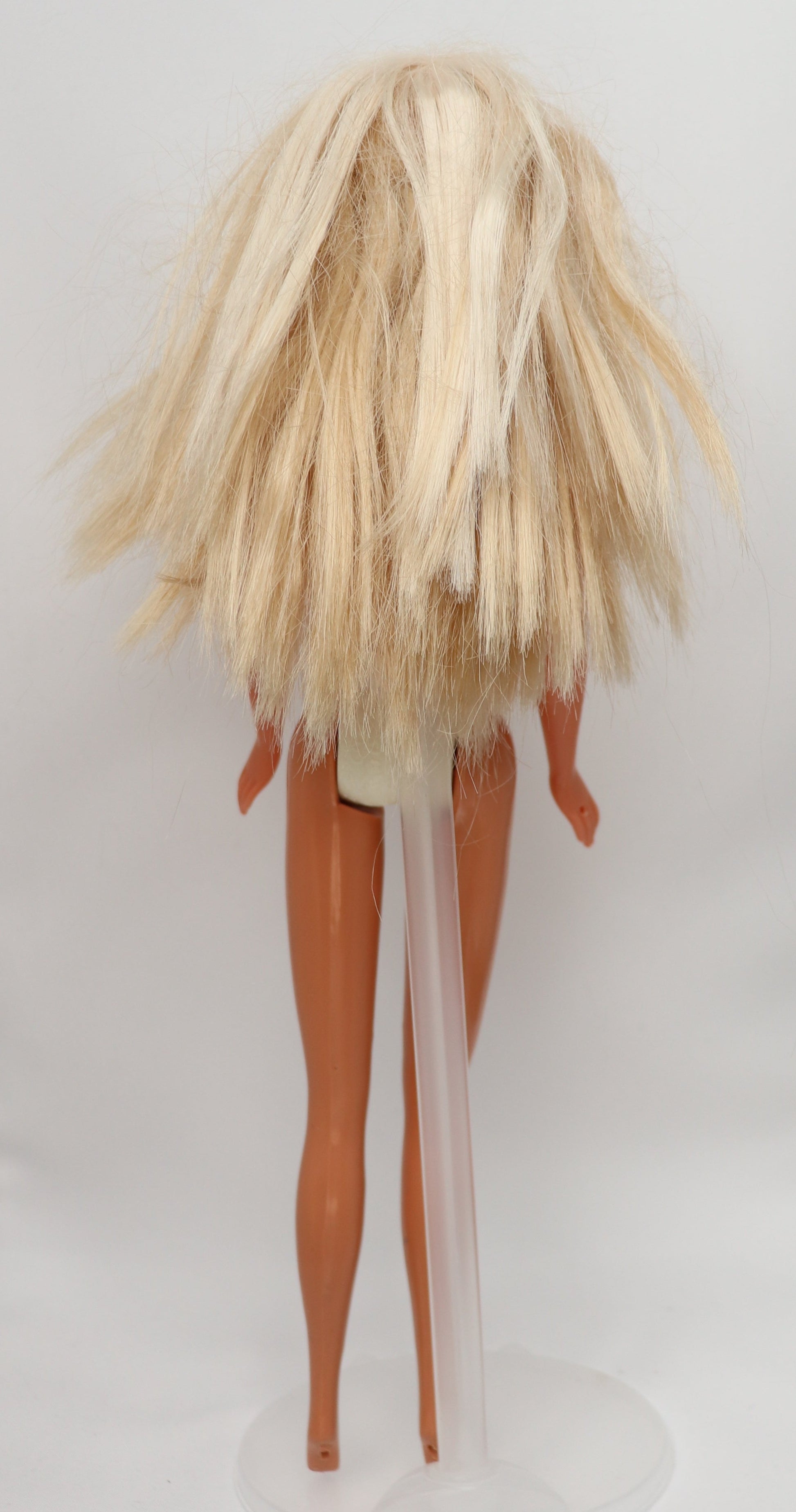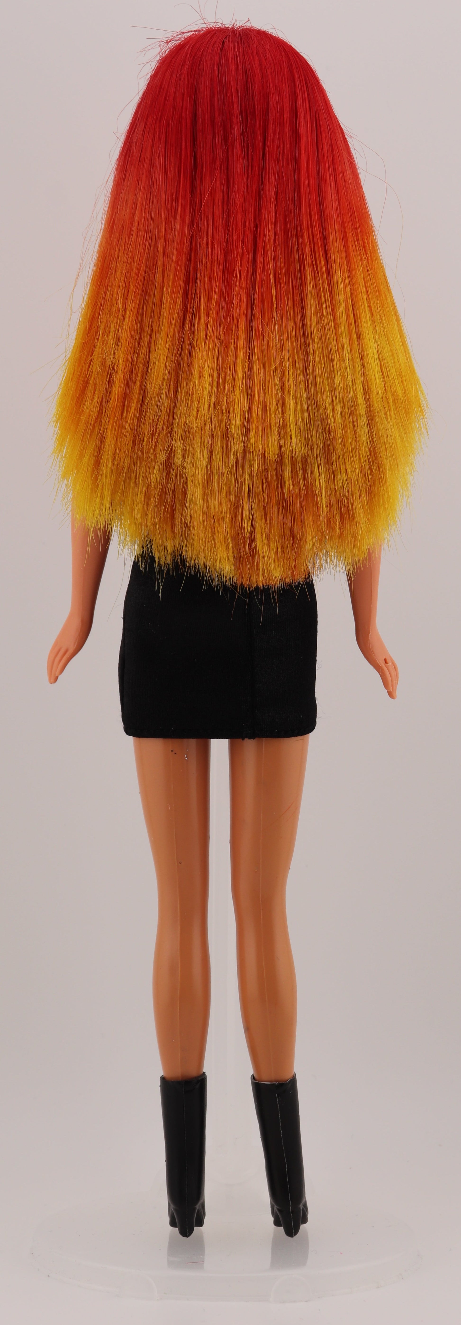 This Barbie is from somewhere between the late 90s-early 00s. Wearing genuine Barbie fashions. She's a cosmetology student currently and working on her specialty in coloring. Her hair has been hand dyed with permanent pigments and is subject to color transfer/fading when in contact with heat or water. To avoid color transfer between her any other dolls, please store accordingly.