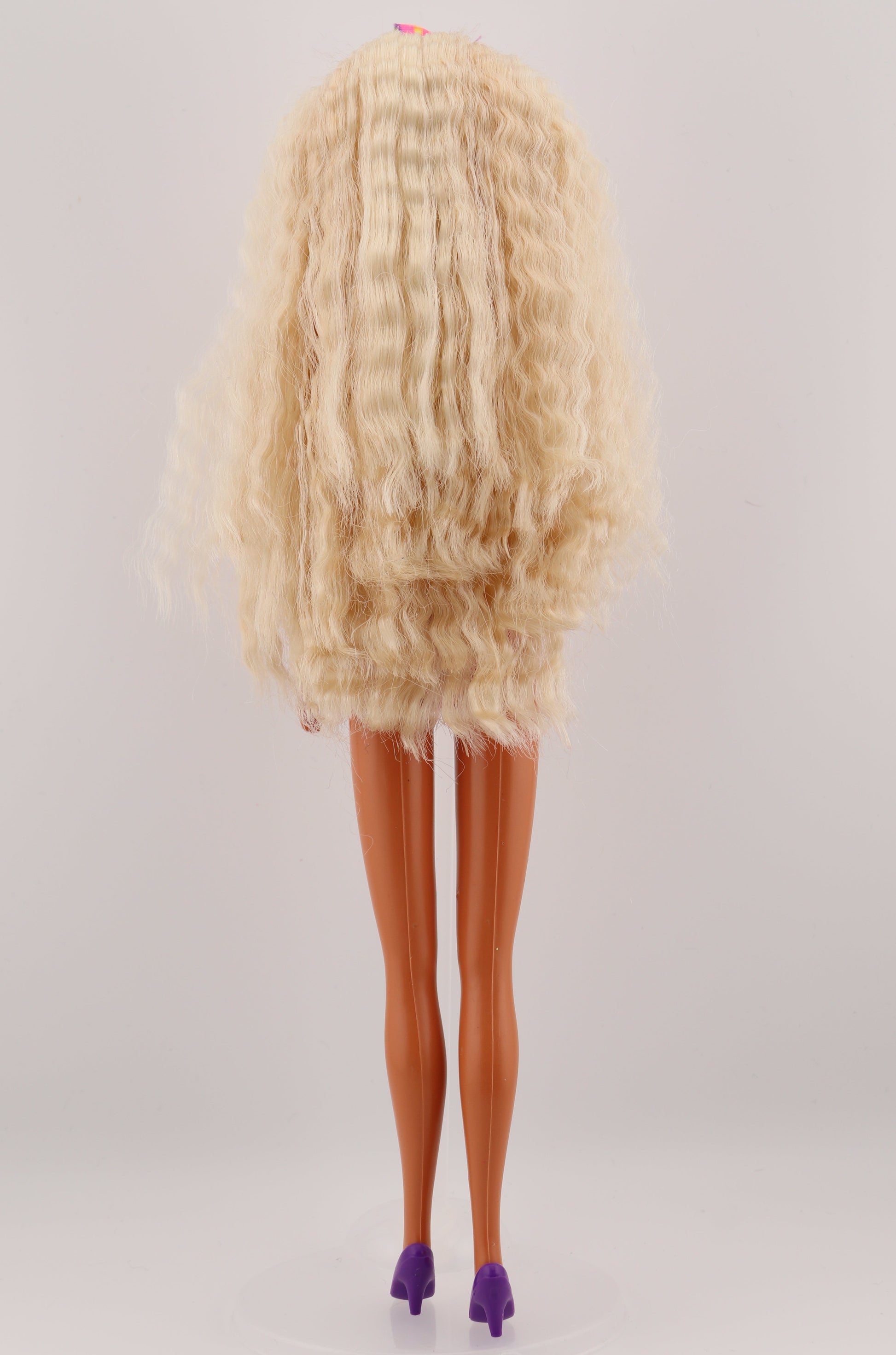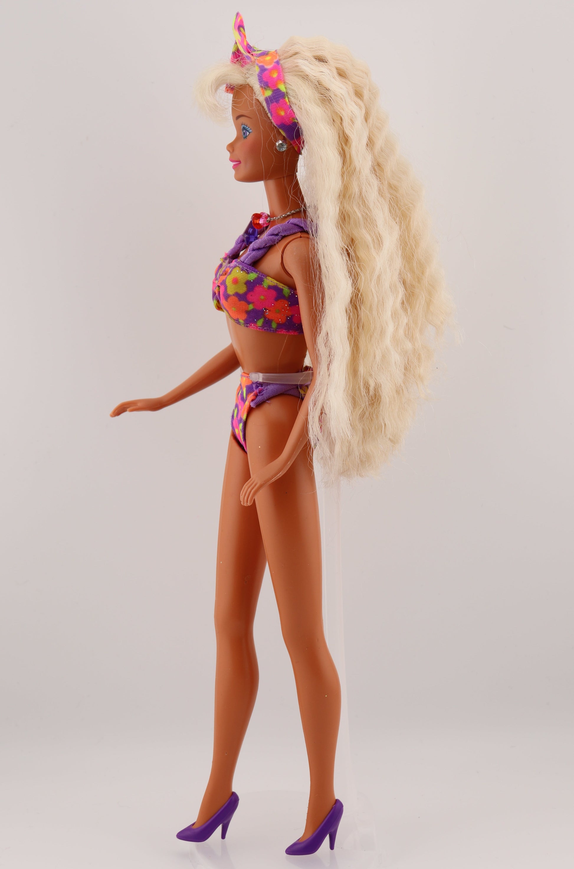 It's Glitter Beach Barbie. Straight out of 1992, my birth year, barbie is sporting a lavender and purple glitter bikini. The bikini is adorned with neon yellow and fuchsia flowers and glitter! She loves to beach with all of her gal pals. Hair is freshly crimped so she's ready to hit the beach.