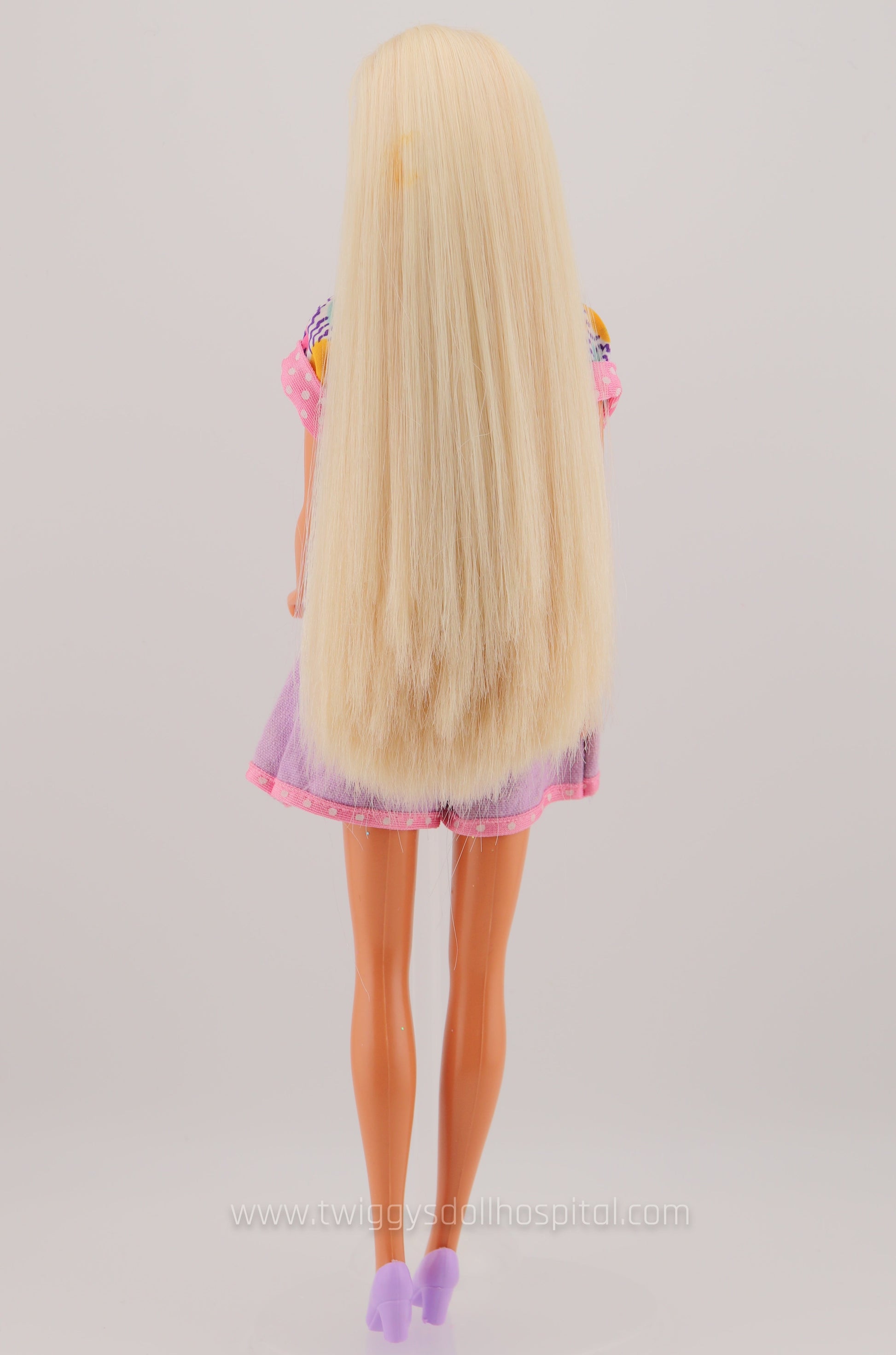 This is a 1992 Sparkle Beach Barbie who has ditched her bikini for this adorable, authentic Barbie, lavender outfit from the 80s/90s. Her makeup is perfect for any pastel moment you can possibly imagine. She's also wearing her original necklace!
