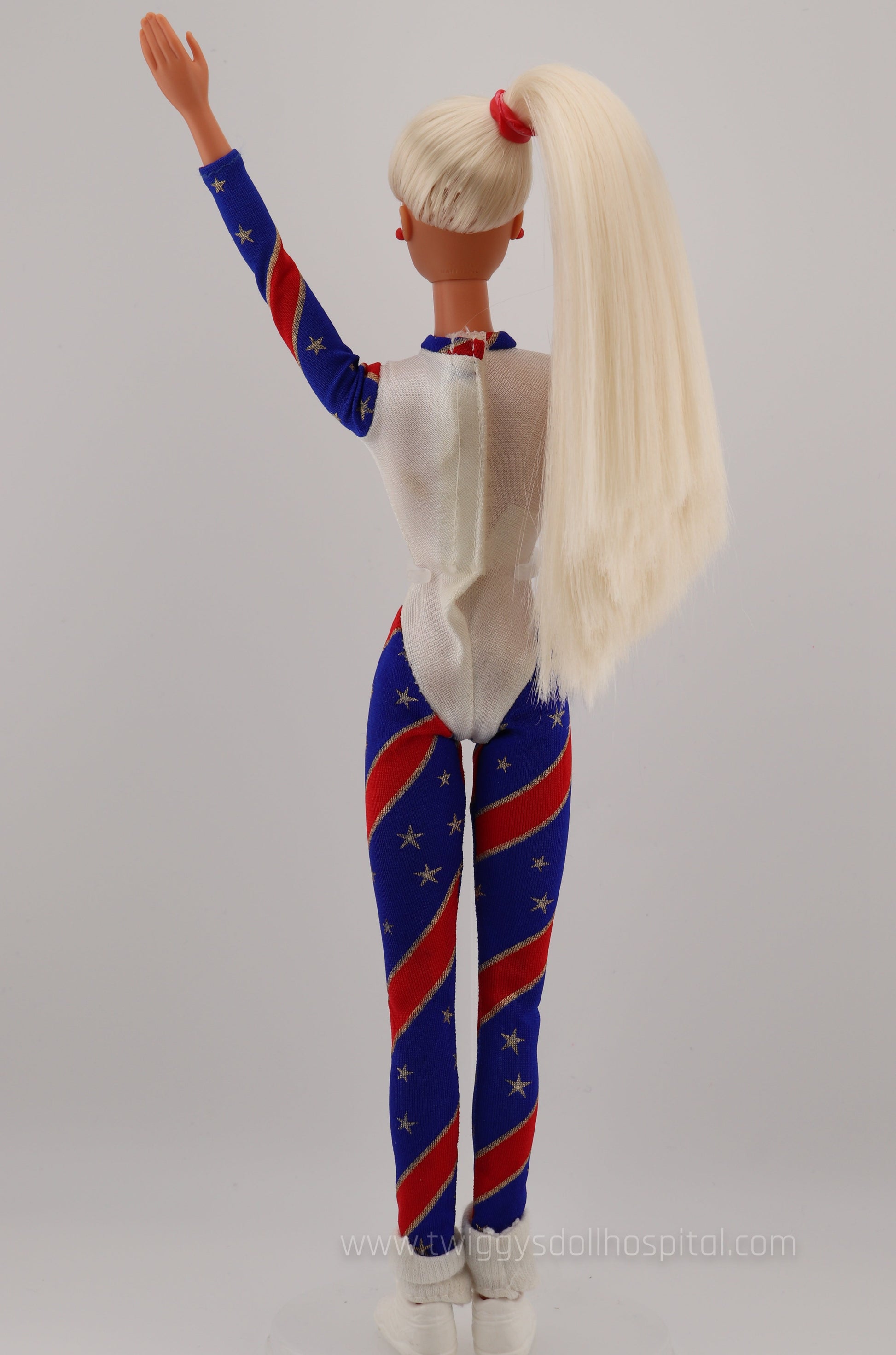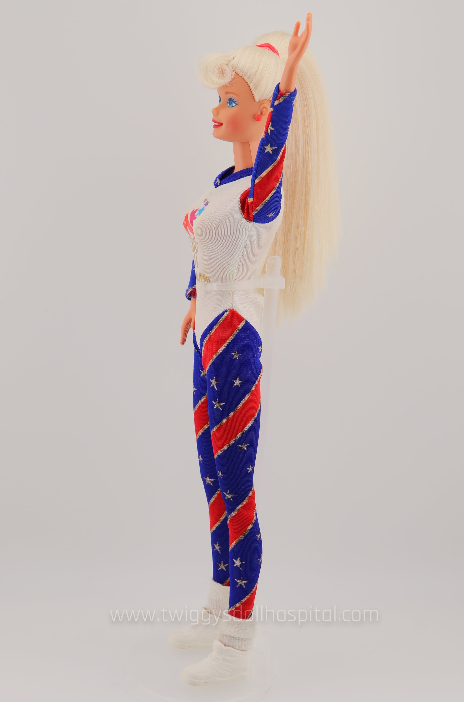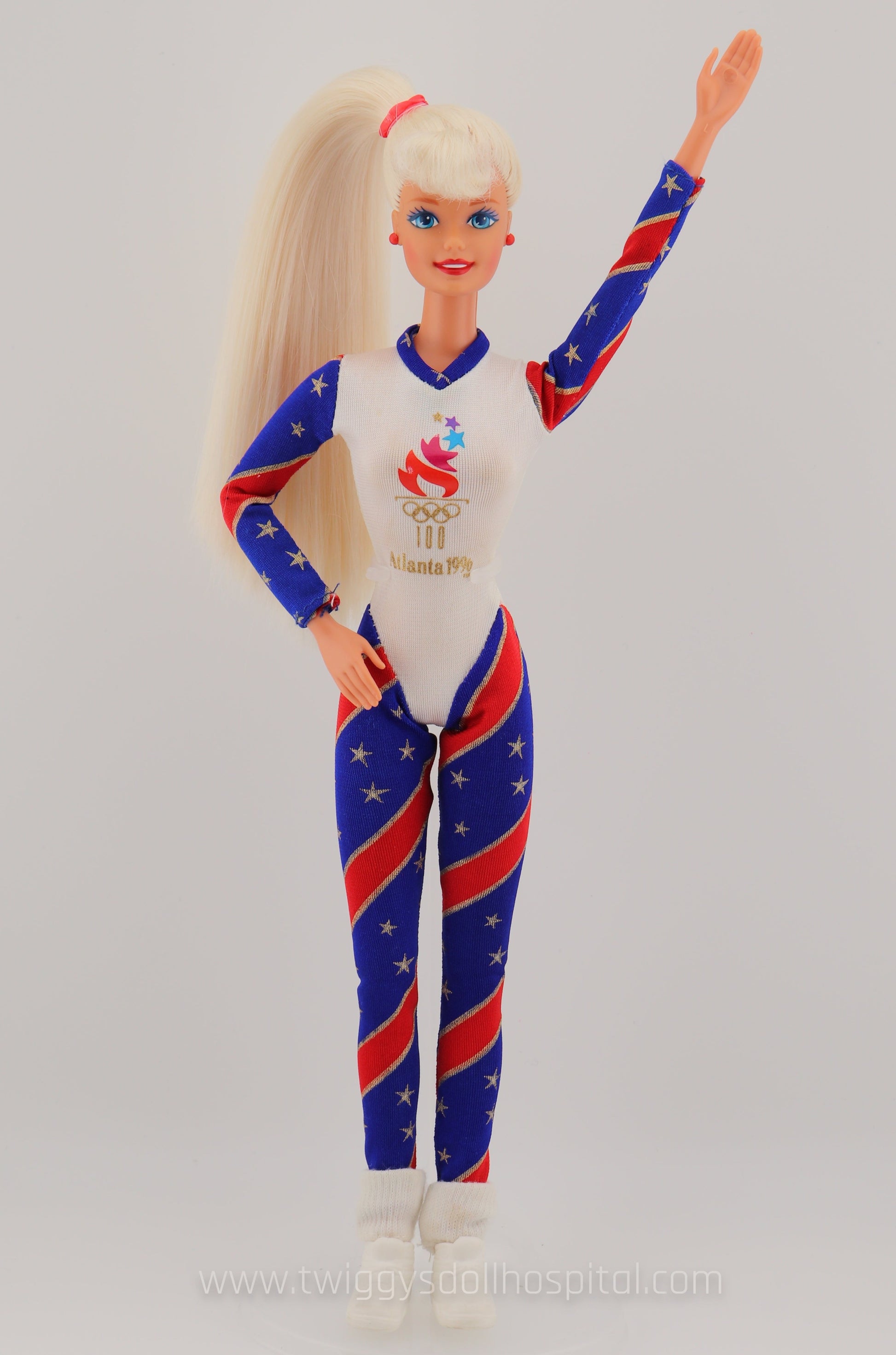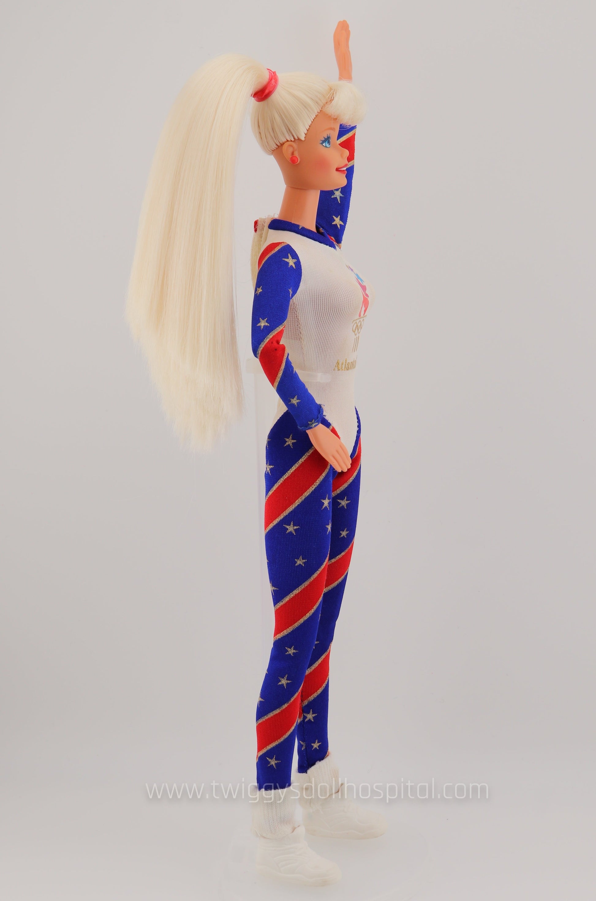 This beautiful barbie adorned in red, white, and blue will take you back to a simpler time where we held our heads high going into the 1996 Olympics hosted in Atlanta. This barbie is special because she's articulated at her knees and elbows. What does that mean? She's very poseable! Great for your imagination to run wild. Her hair is swept up in a side pony and is impressively soft.