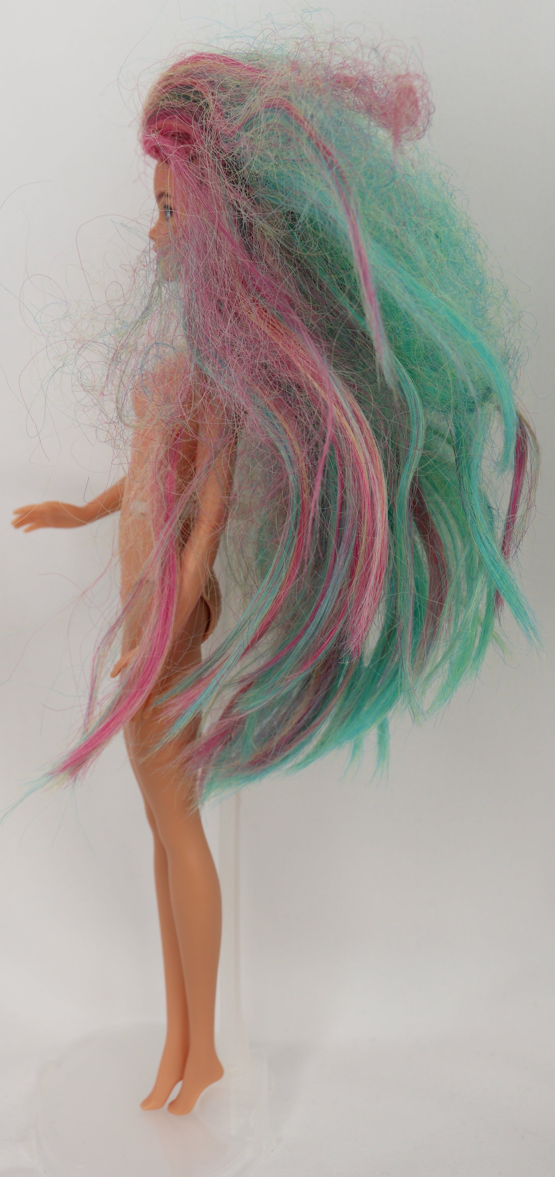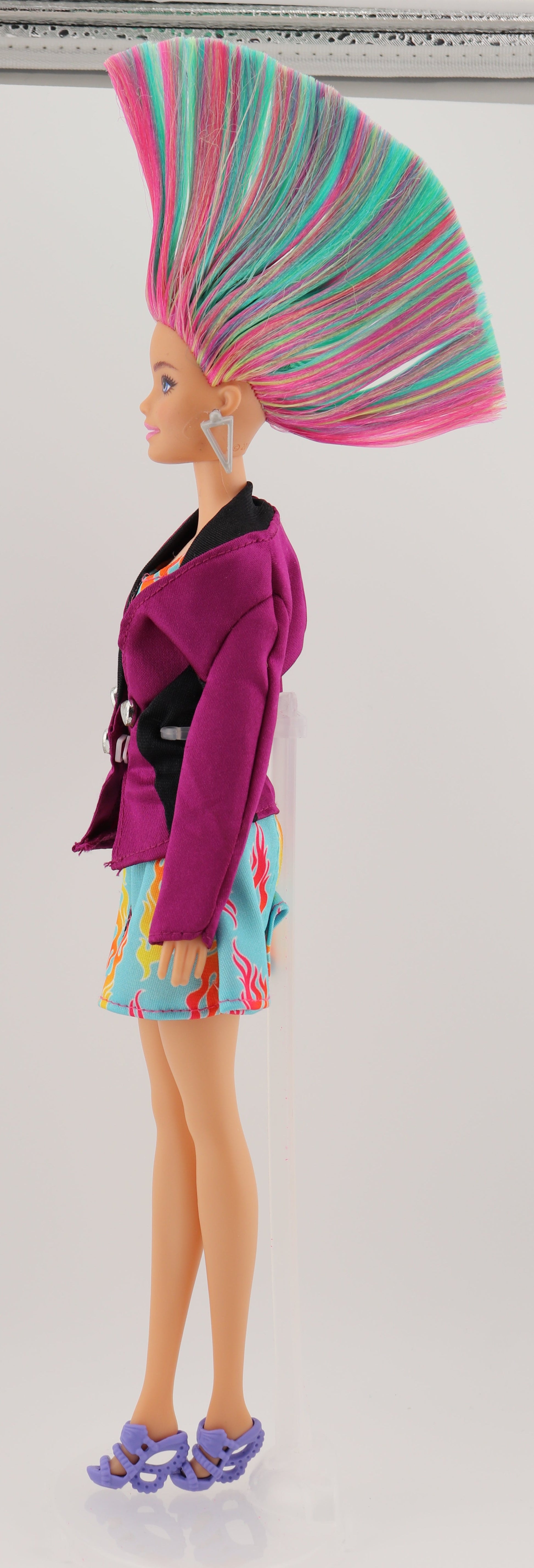This barbie was inspired by my late friend Niece who was a dear friend and inspiration to me in so many ways. One day she showed up to school with her hair spiked two feet tall into a huge mohawk. She was promptly sent home for the day but it was a legendary thing the whole school got a laugh out of. I'll always remember her beauty and humility. Redressed wearing genuine barbie fashions. Her legs are not bendable.
