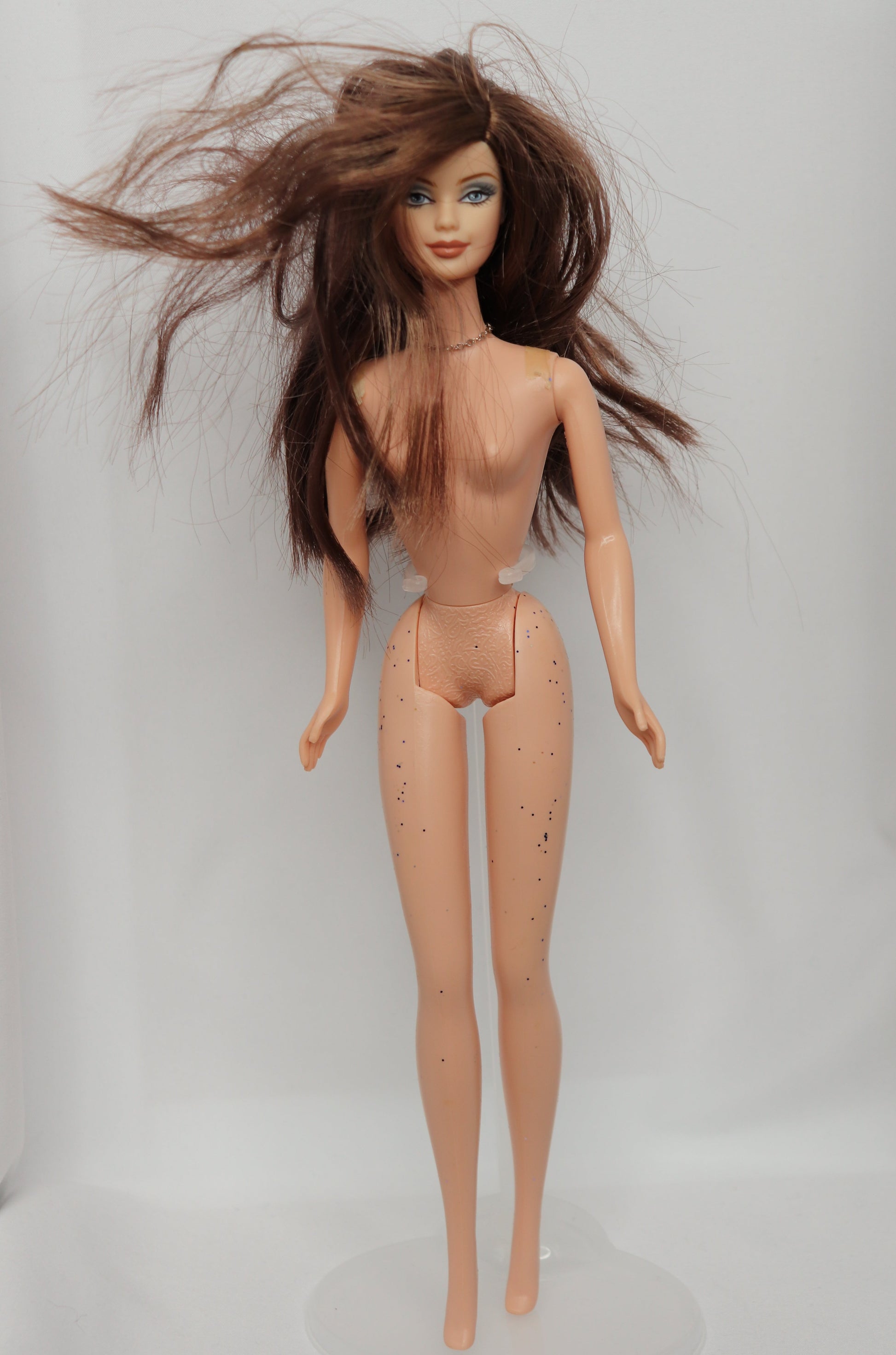 This is a beautiful Barbie from 2002 representing the September birthday's by adorning a faux Sapphire necklace. She may look ready for a ball now, sure, but she's had quite a rough lot in life to get to the doll hospital. Tales from her travels will dazzle you all night as will her blue dress. If you're lucky, she might even tell you how she got that orange blush on her cheek.