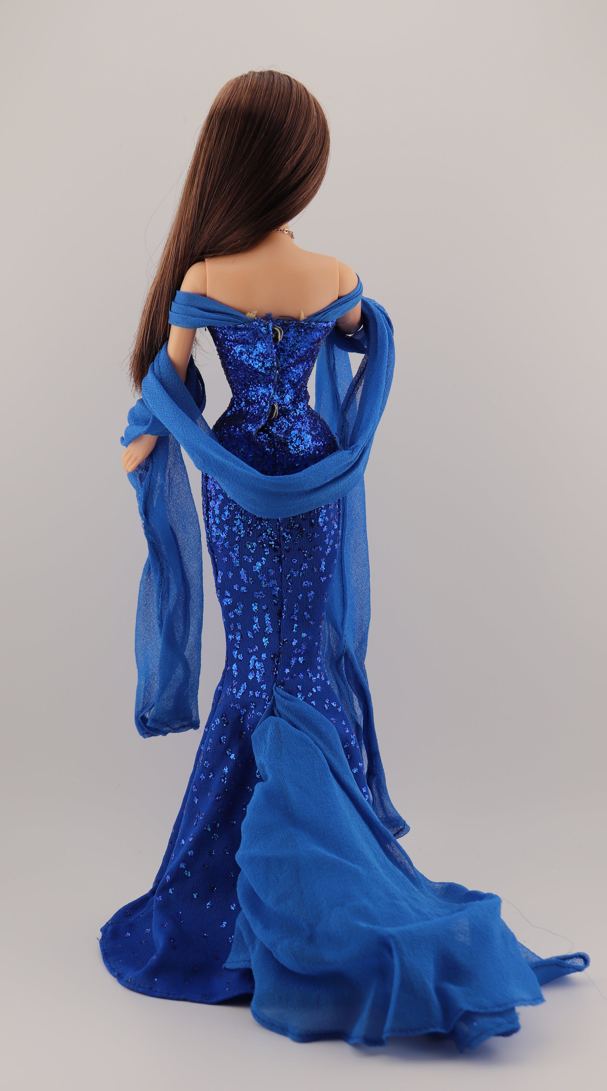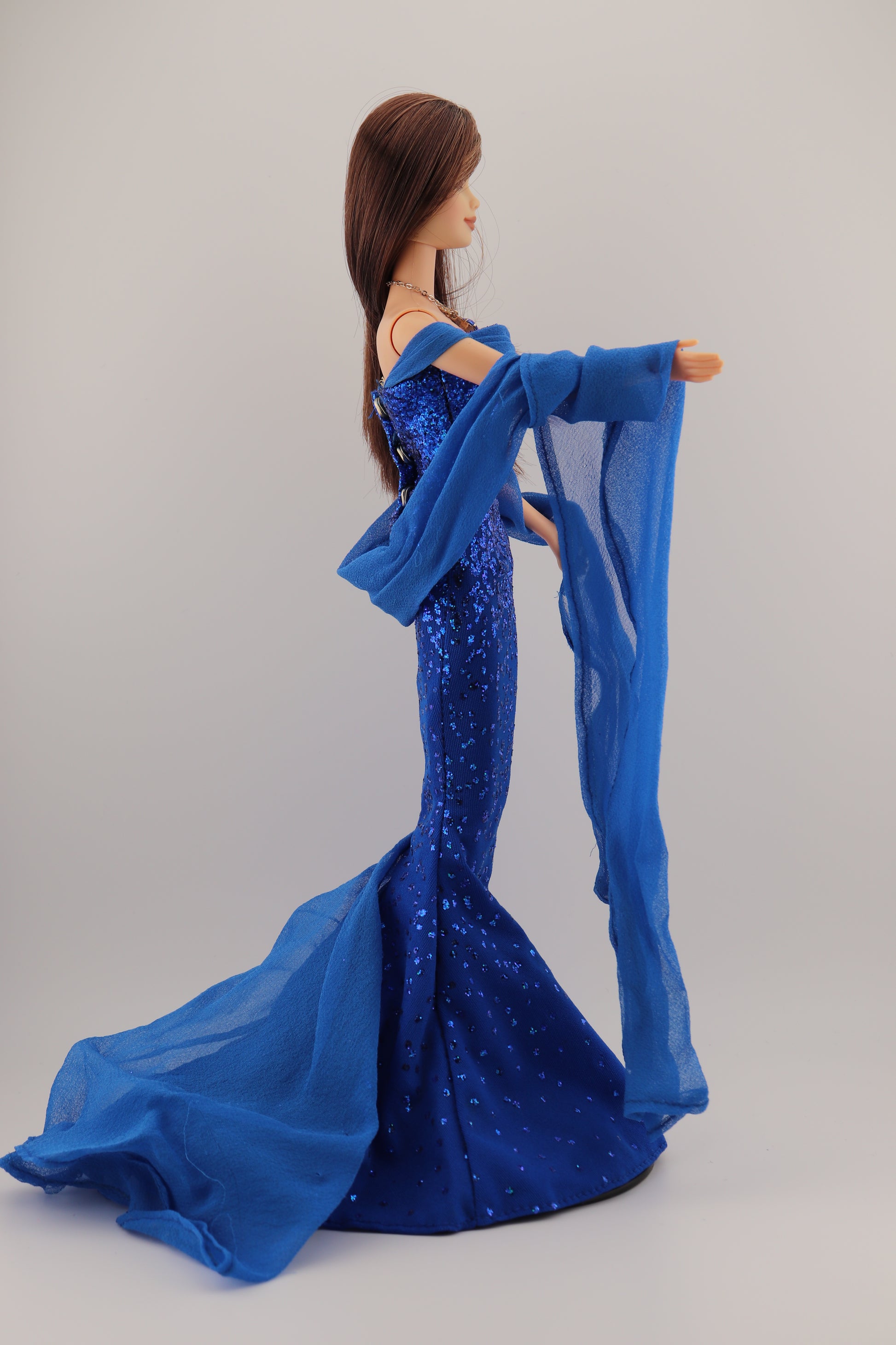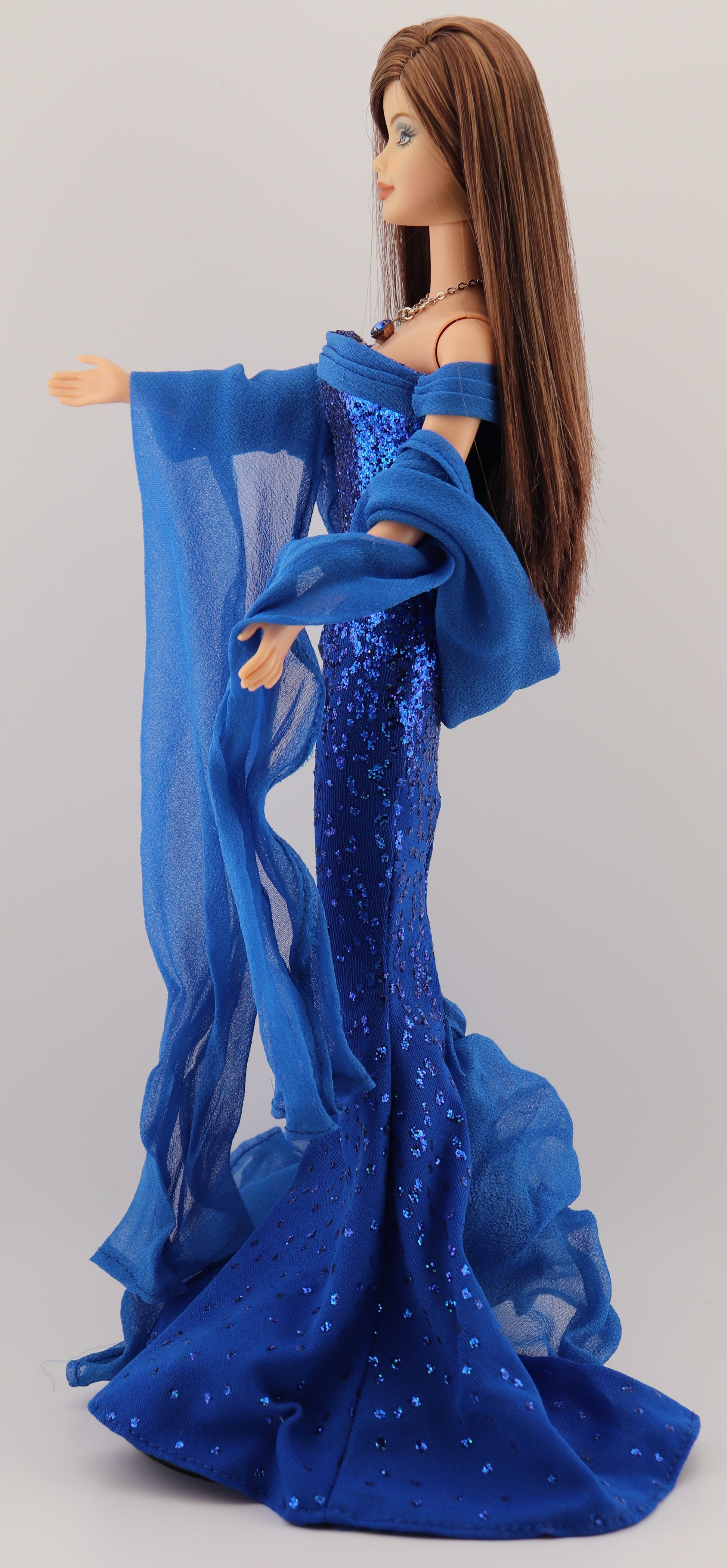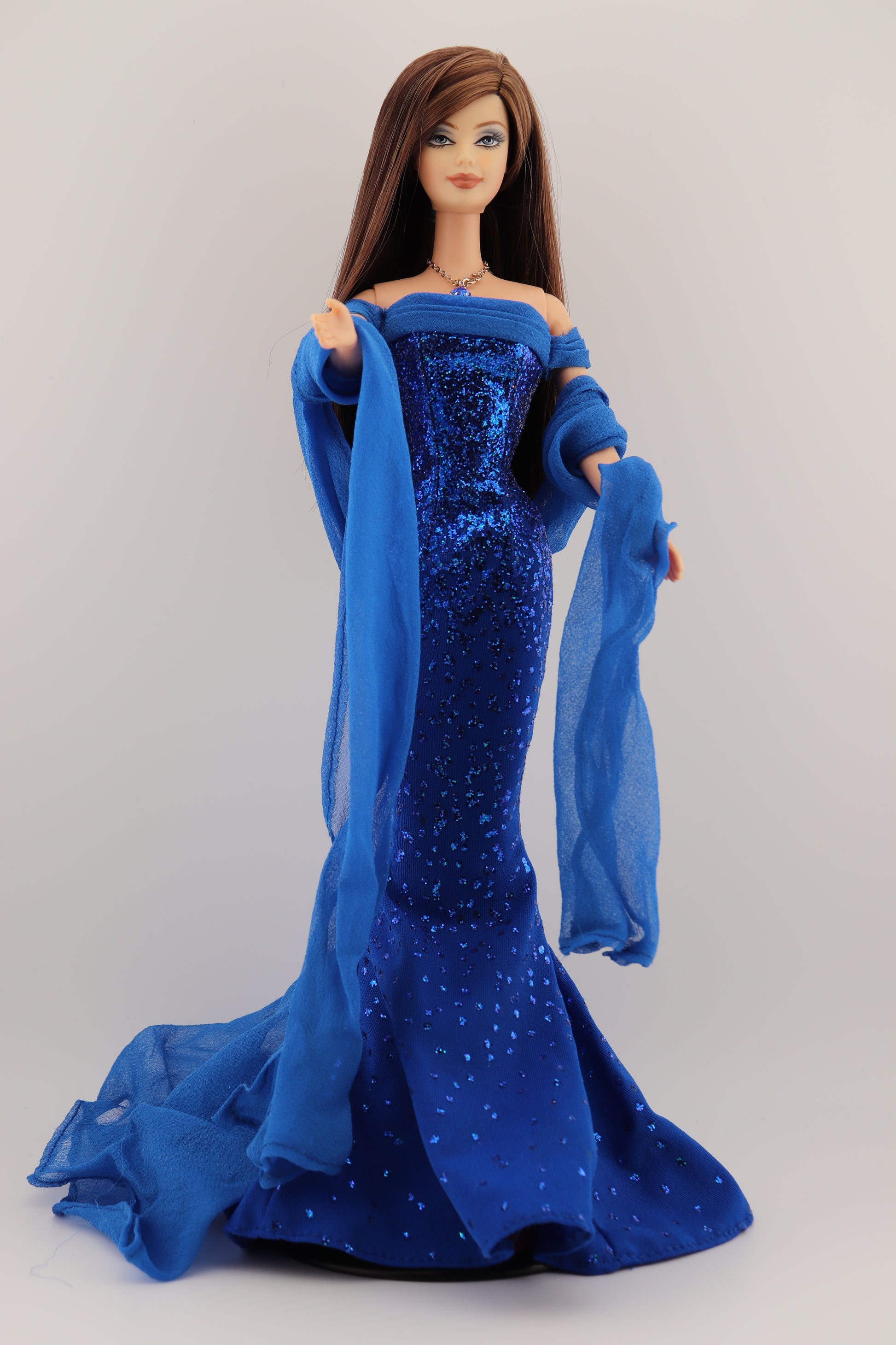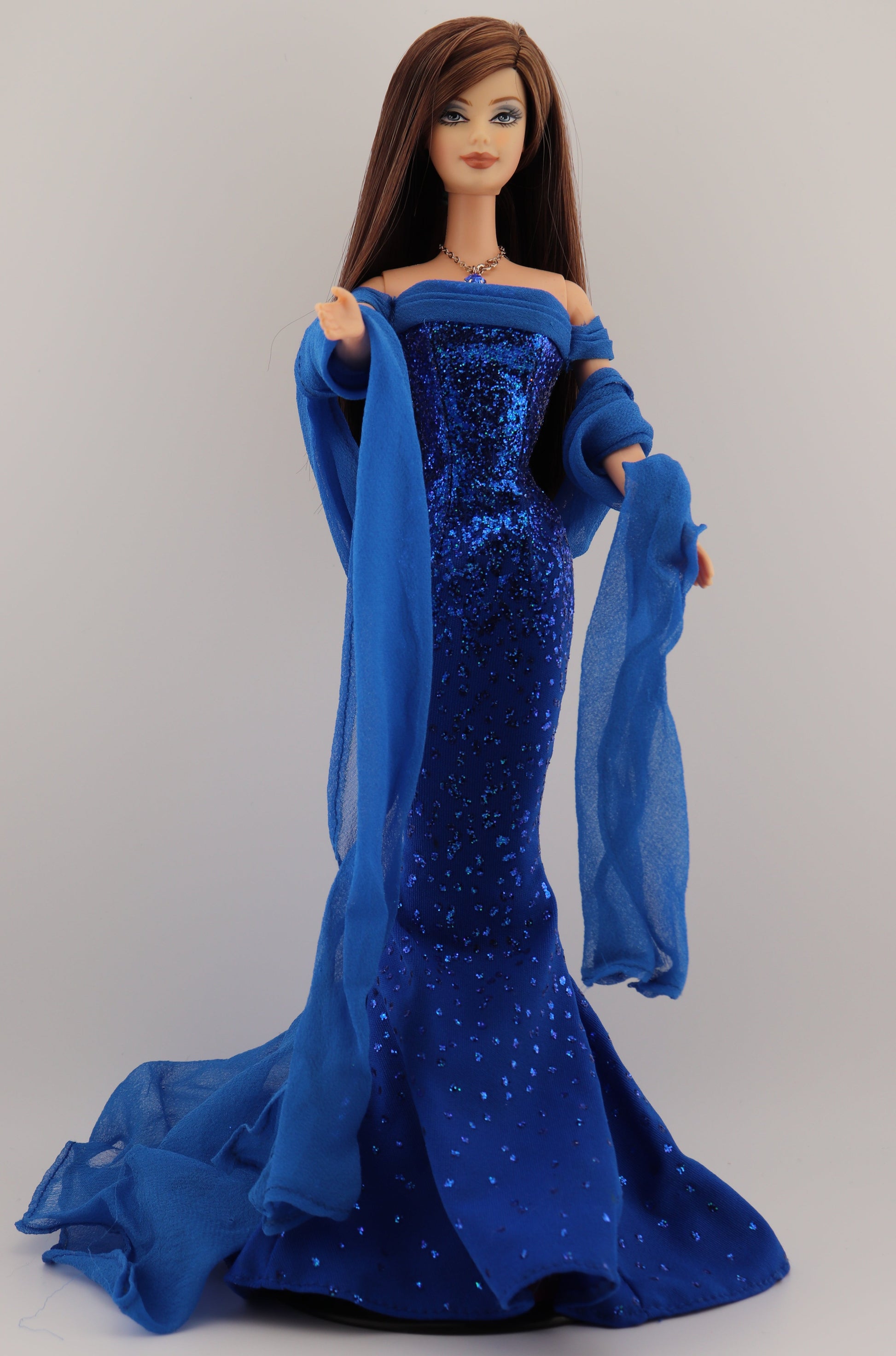 This barbie is wearing her original dress, sash, and necklace. New blue high heels from a Barbie Fashion Avenue pack.