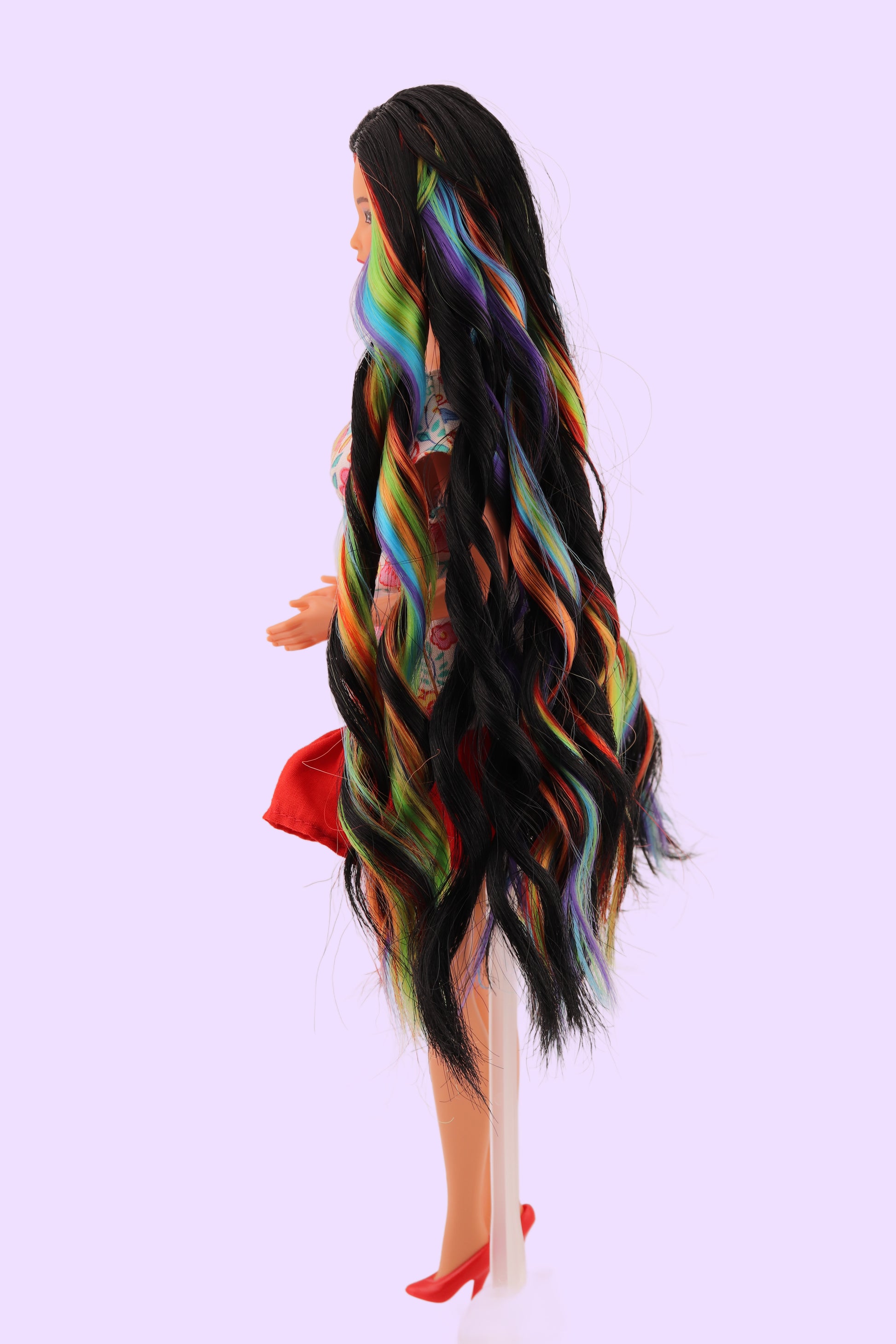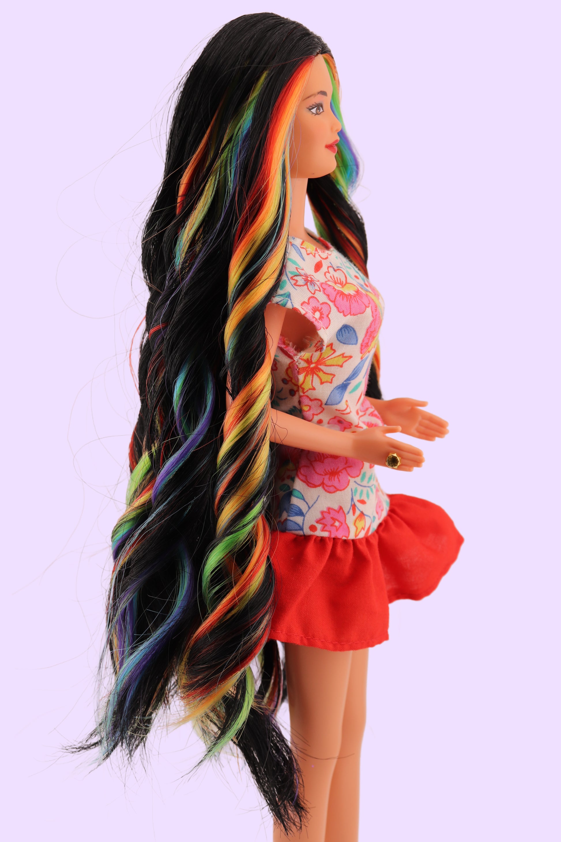 This gorgeous barbie was a brand new Thai Barbie sold in 1997. She needed a makeover and got one at Twiggy's Doll Hospital with a brand new head of 100% Nylon hair that is so insanely silky smooth and soft to the touch. Curls will stay as long as you preserve them but hair can be easily restyled with boiling water.