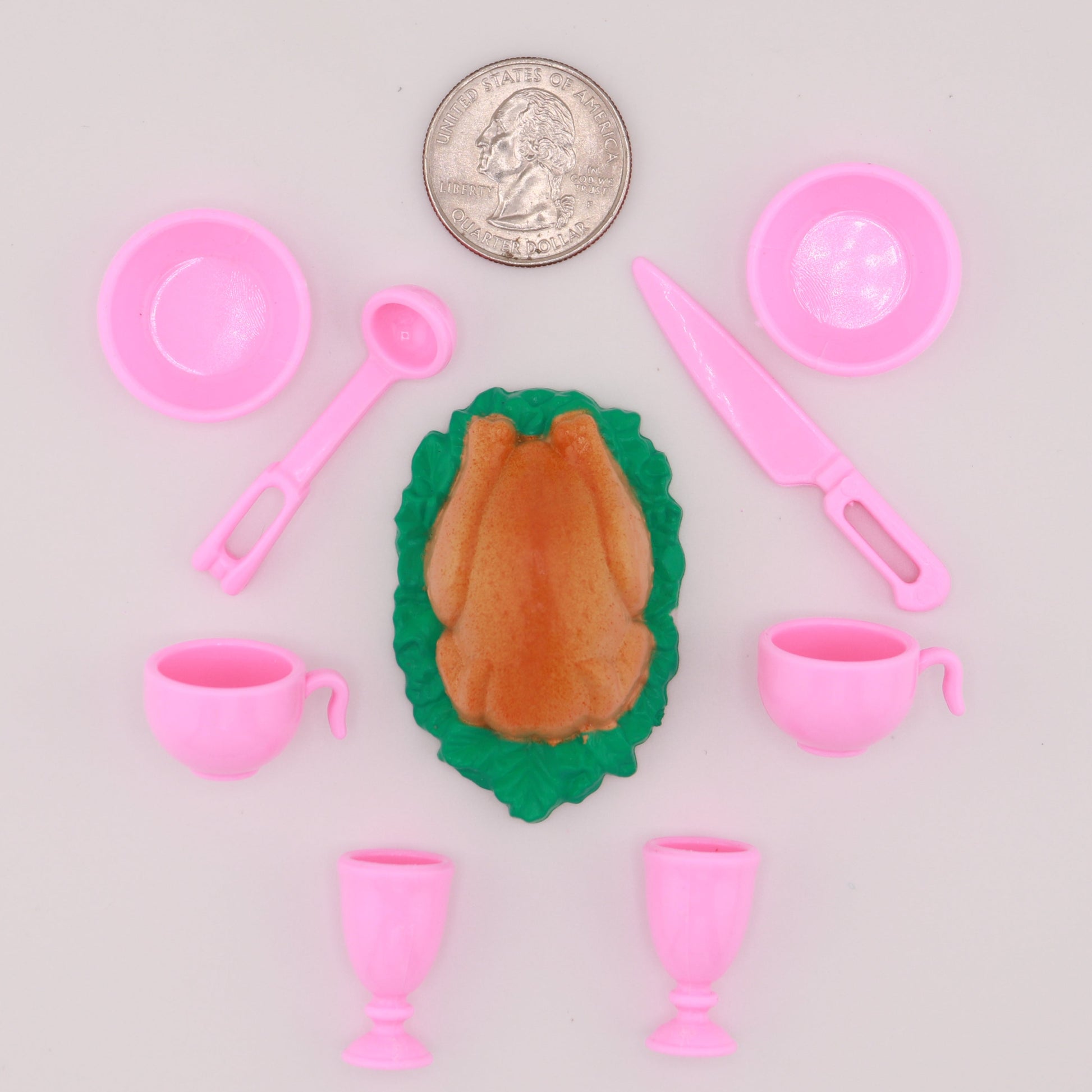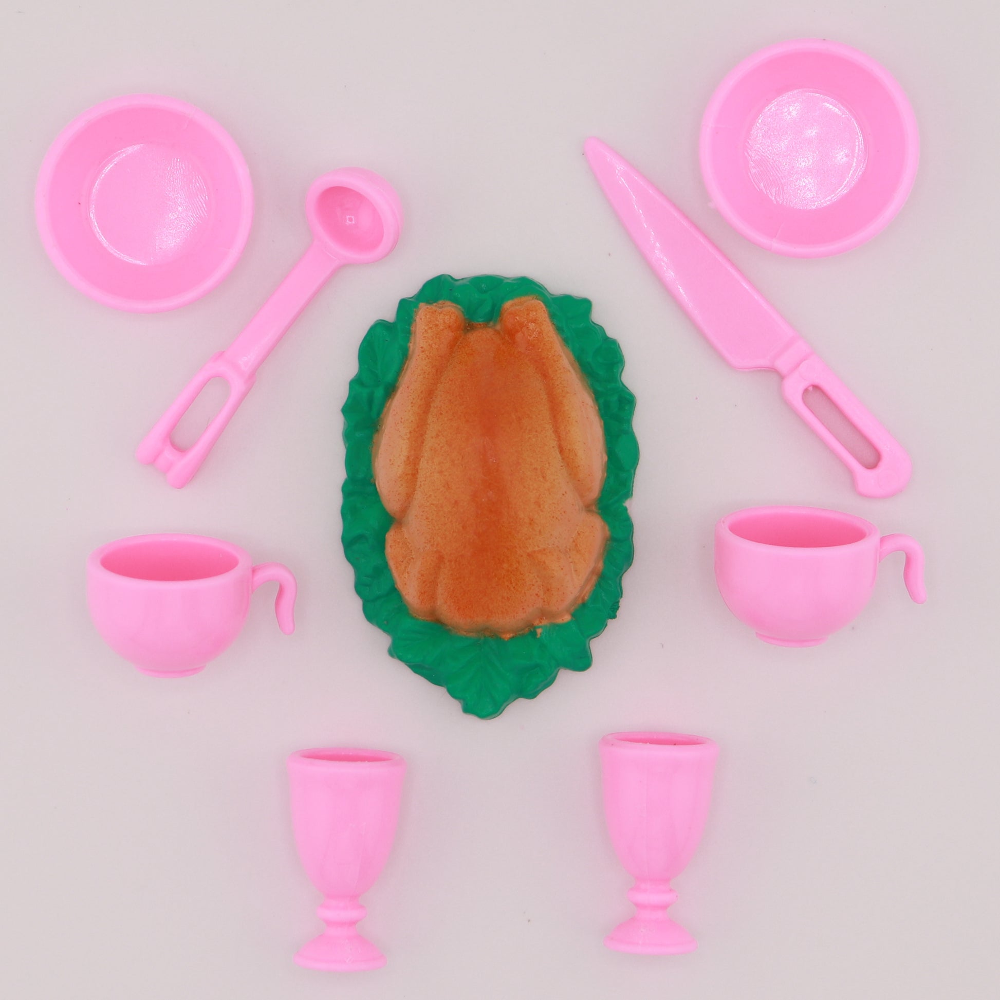 Barbie holiday dinner set includes two plates, two cups, two chalets, one knife, one serving spoon and one holiday turkey.
