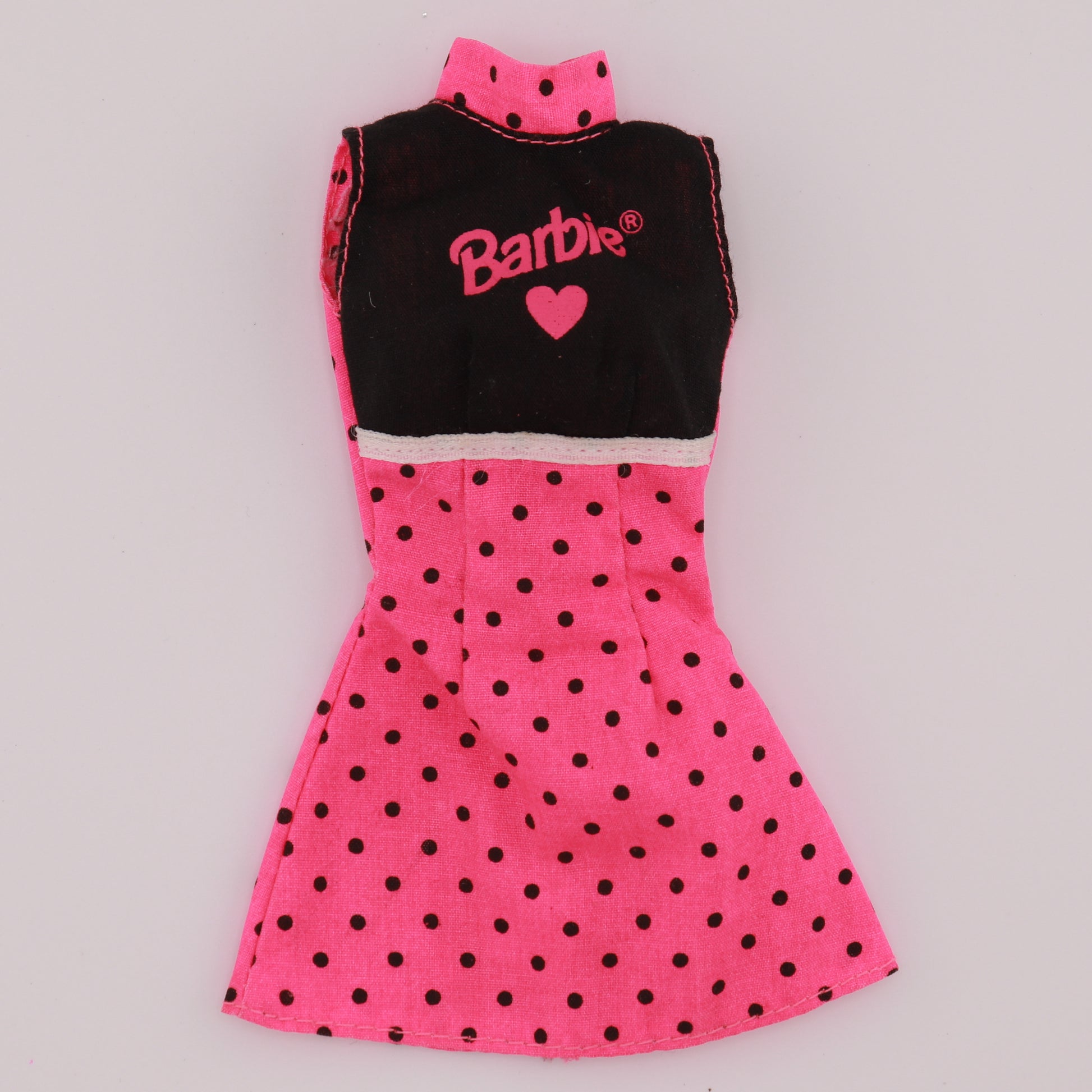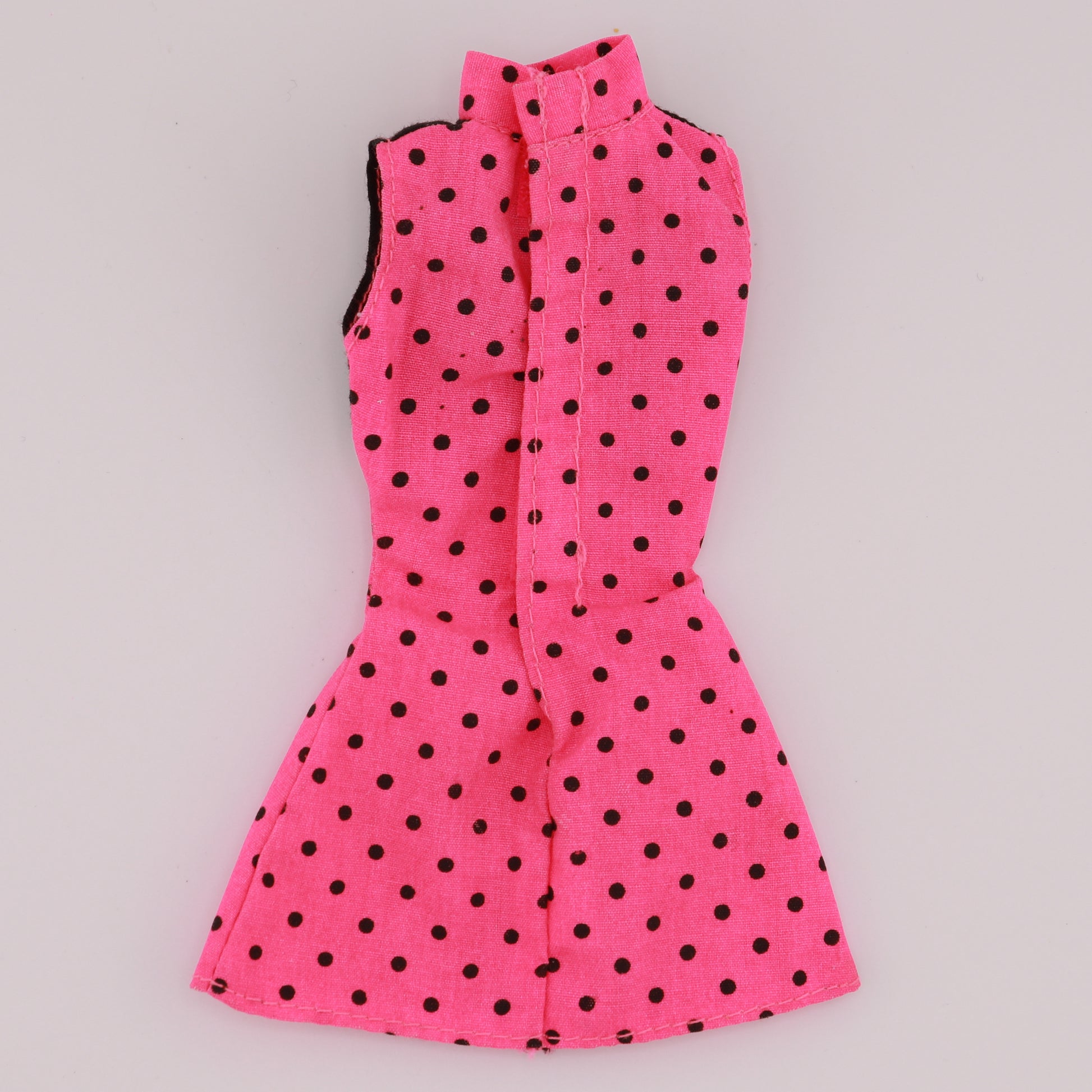 Pink high neck dress with a black top and black polka dots.