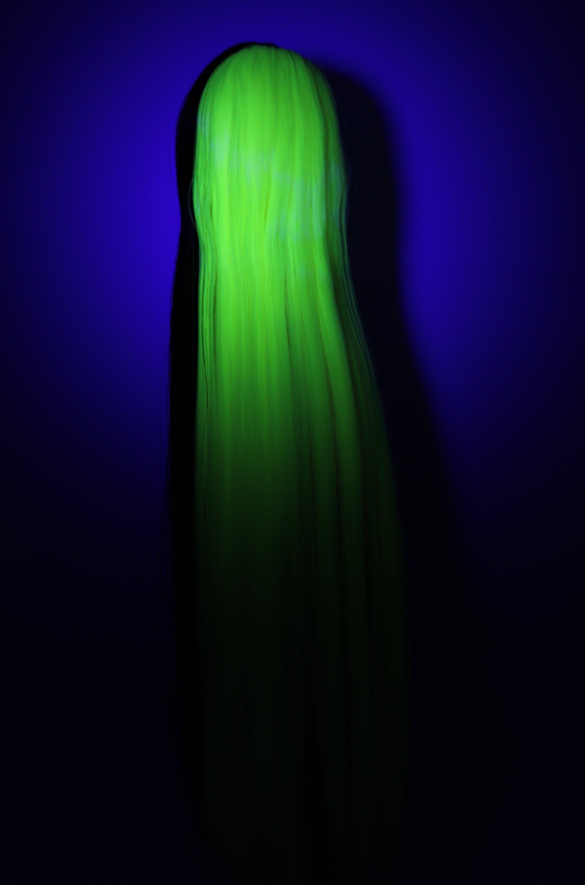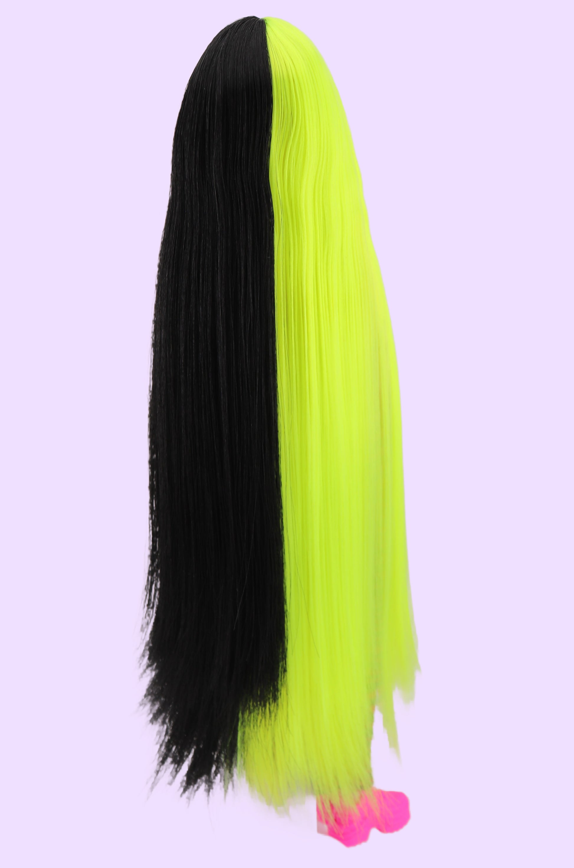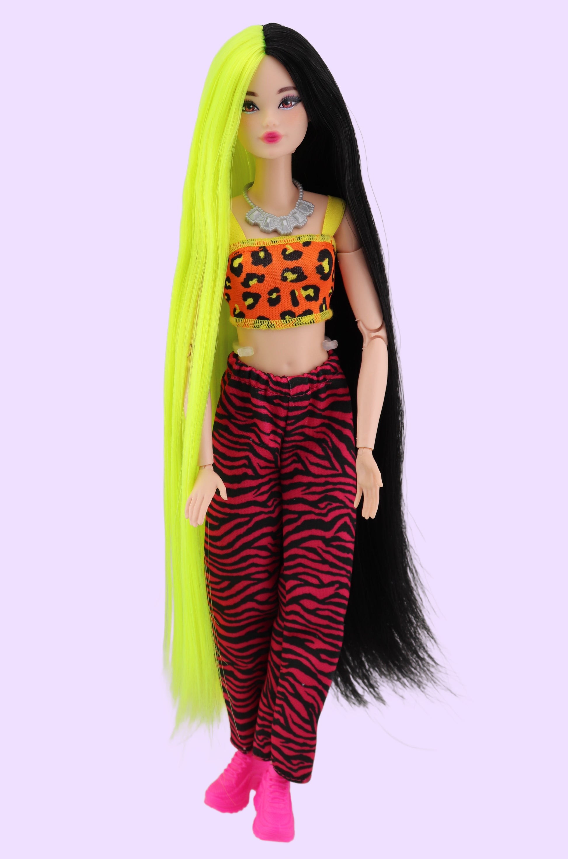 This Barbie is cooler than I am. She's always on to the newest trend and keeping up with fashion. She loves a throwback and anything streetwear. She is a true one of a kind custom doll made from the Odile Dreamtopia Mermaid with lavender hair and a Made to Move tennis player body, ensuring she's capable of posing in any way you can think of. Her hair is a perfect 50/50 split of black and highlighter yellow-green. It's insanely bright under a black light as well. She has a ton of hair that is 100% nylon. I know a ton isn't an exact measurement but I would guess there's at least 2.5 grams of hair plugged into her. Can be cut or trimmed upon request/purchase. What do you see her getting up to?