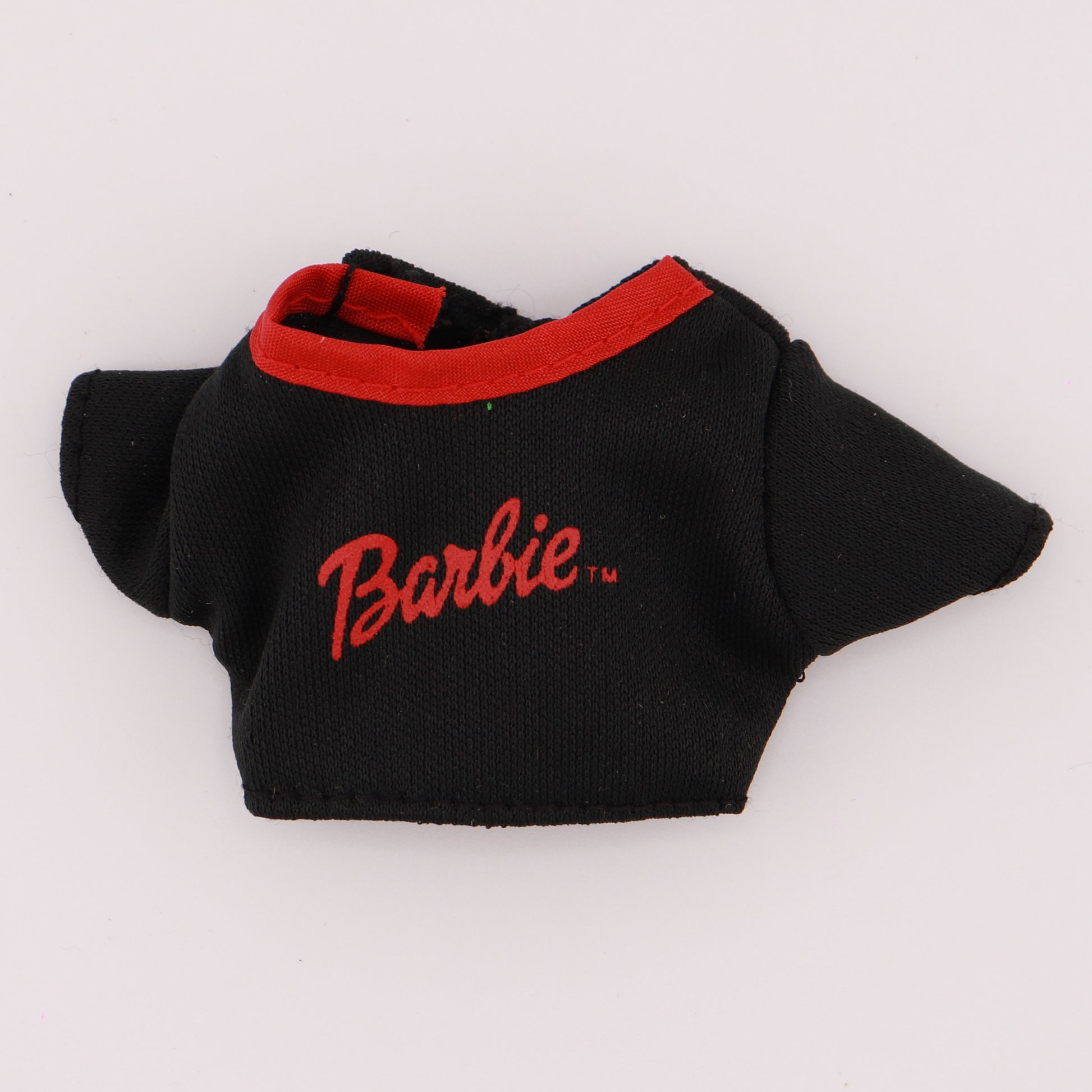 Black scoop neck crop top that has the Barbie logo in red.