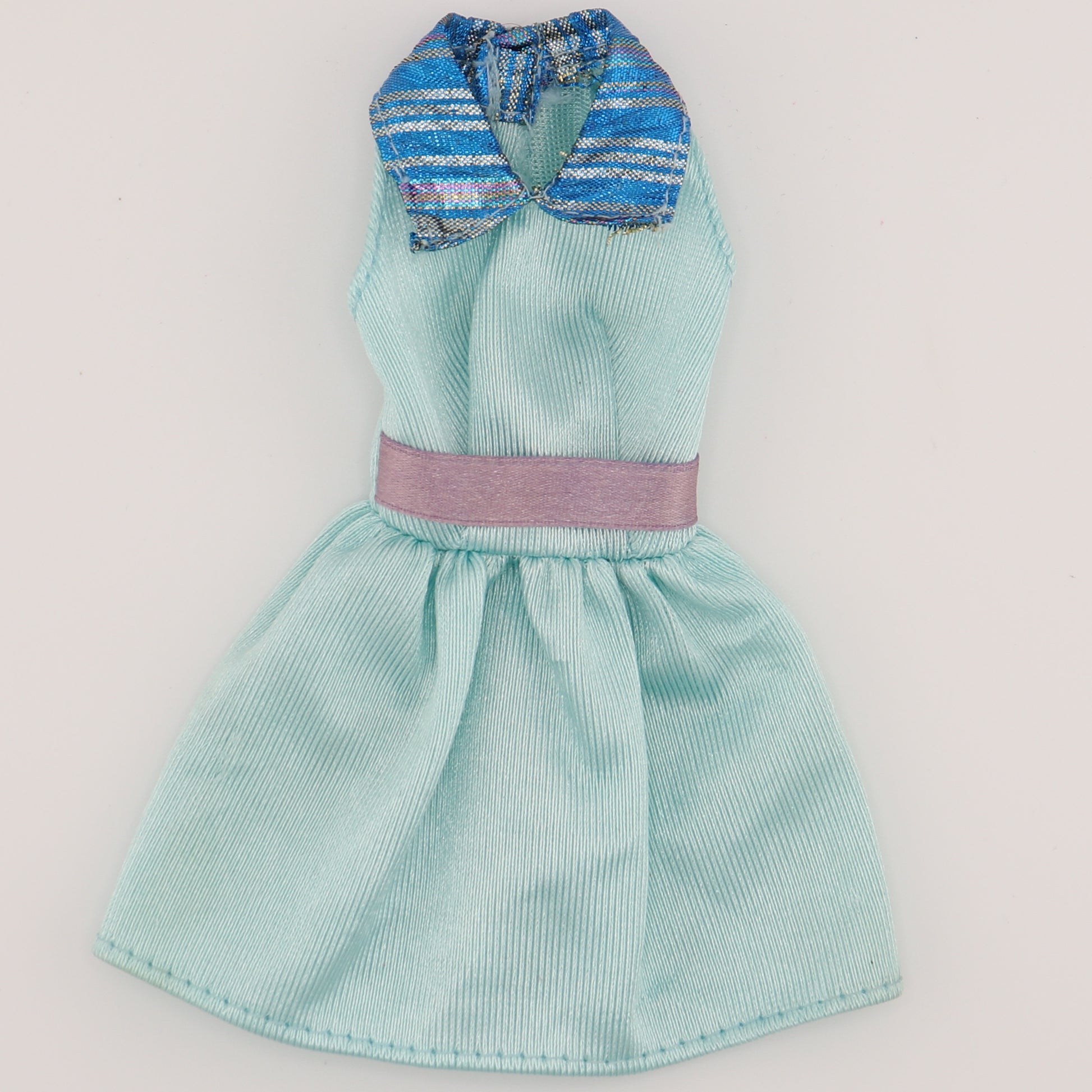 This is a collared light blue faux satin dress with silver details. It was originally sold in a fashion pack sold in 1996. Best fit for Twist N Turn Barbies.