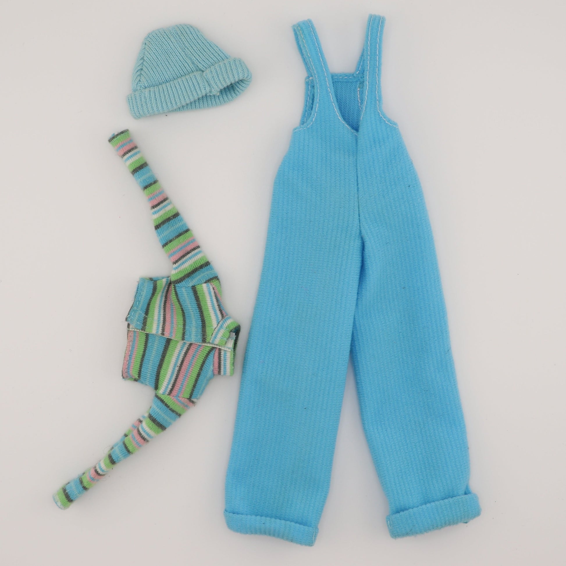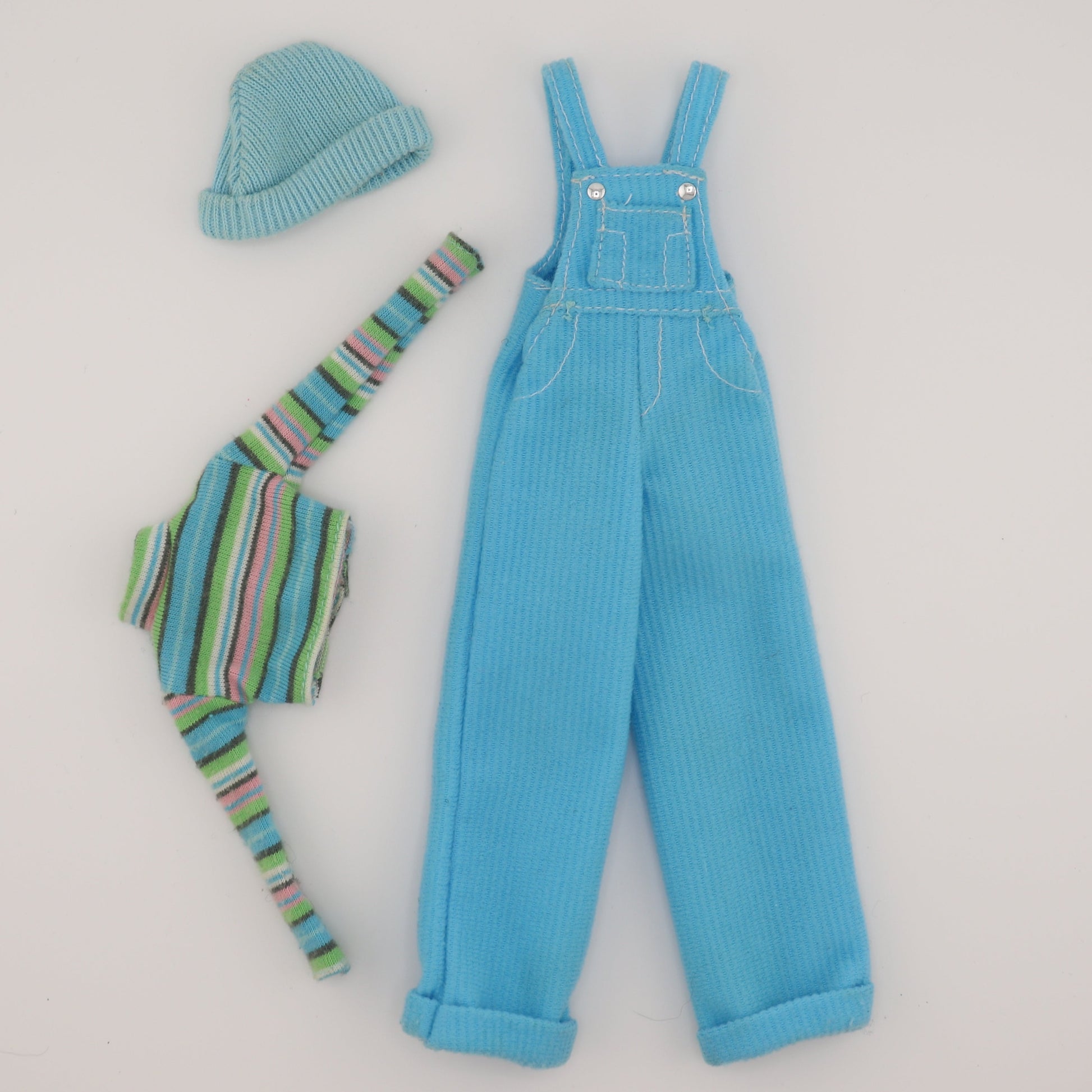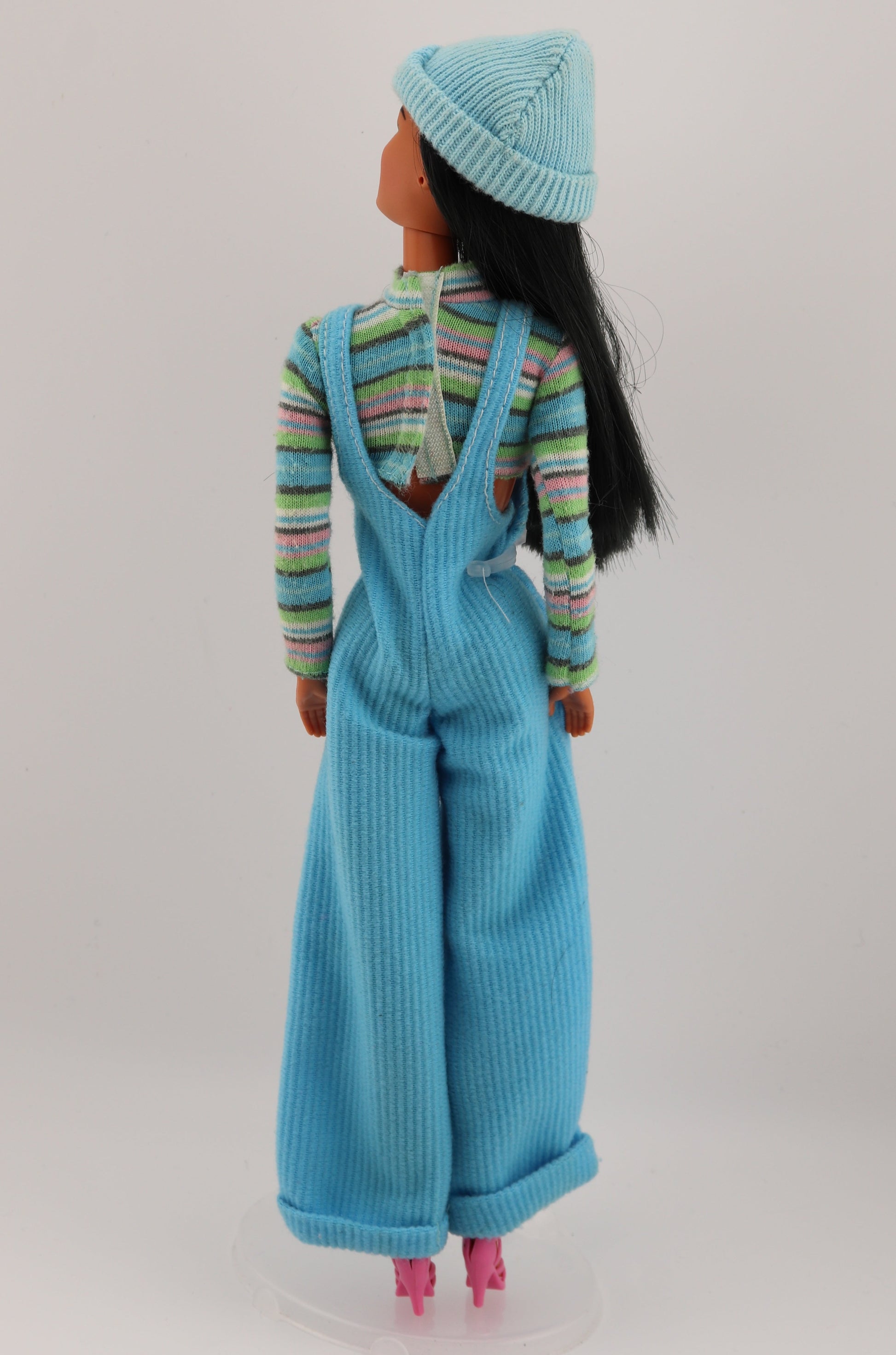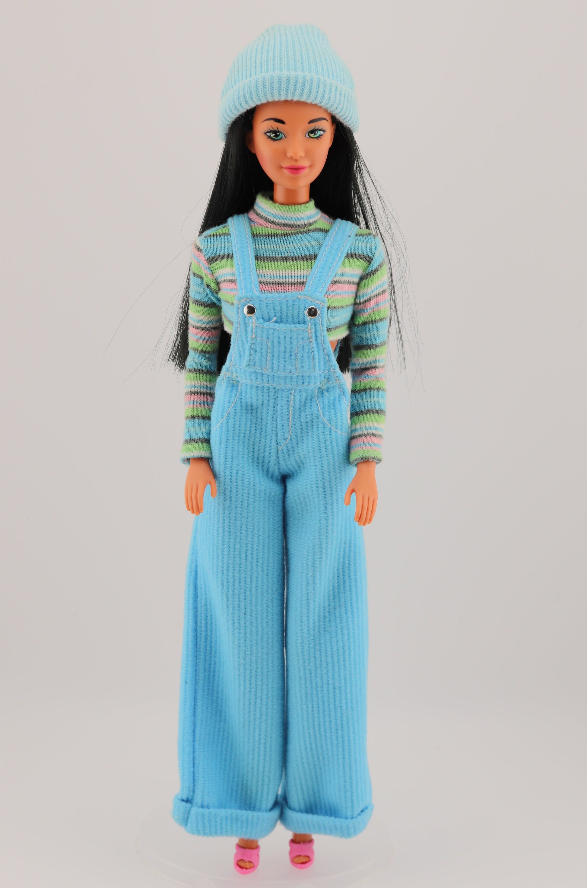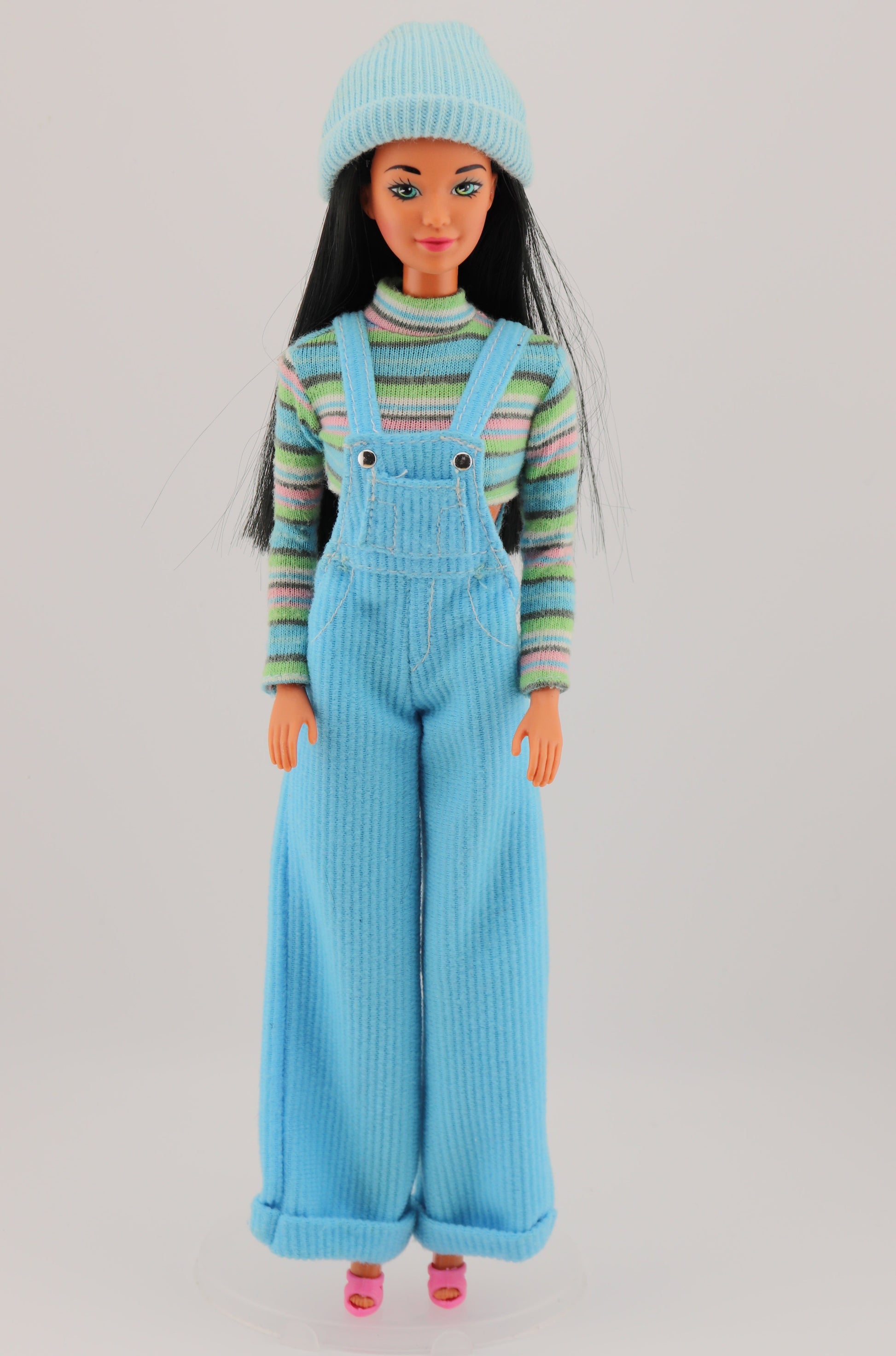 This outfit makes everyone whos in it look a little cooler. It's cool blue Barbie's outfit from 1997! Adorable corduroy overalls and a striped shirt. Best Fit for Twist N Turn Barbie body types.