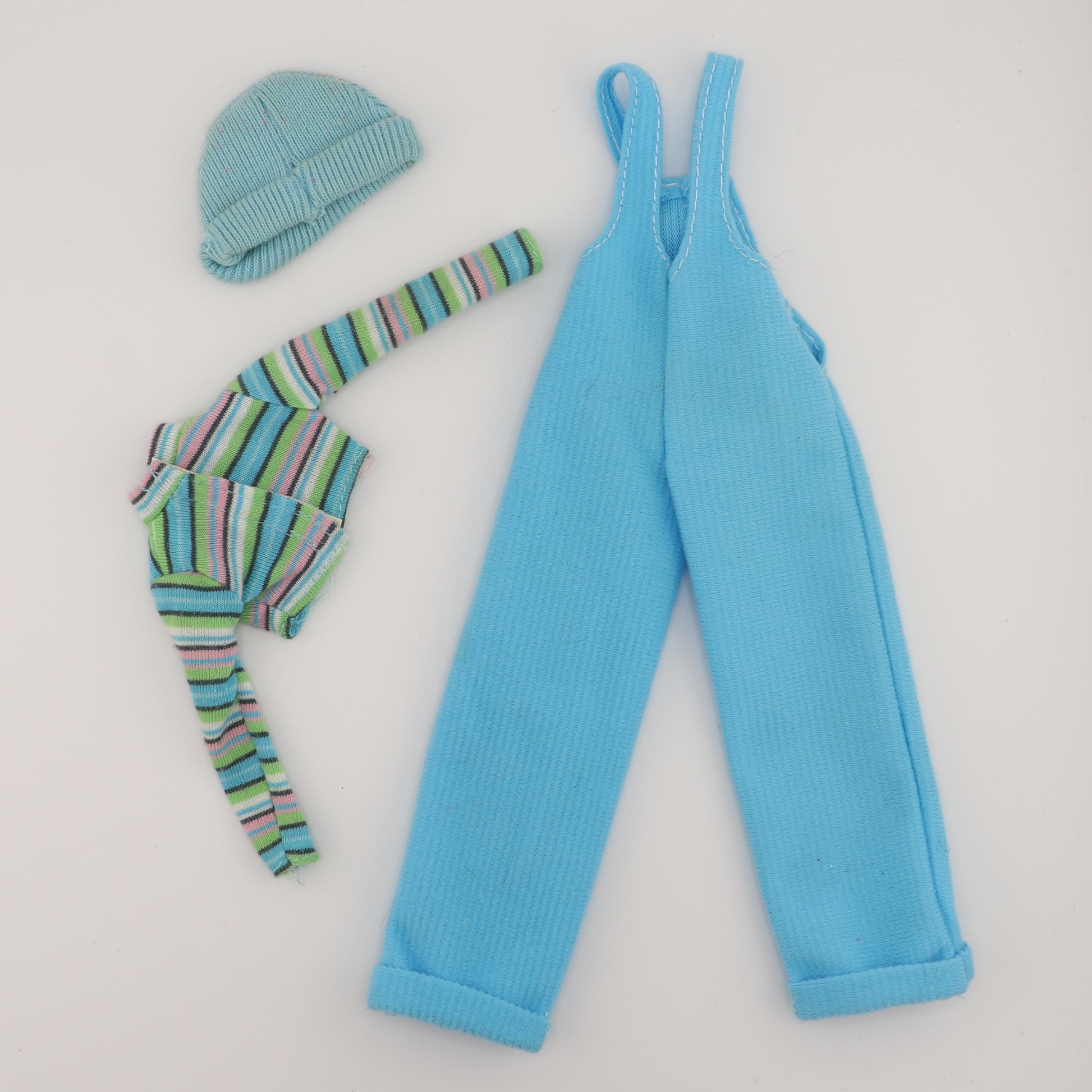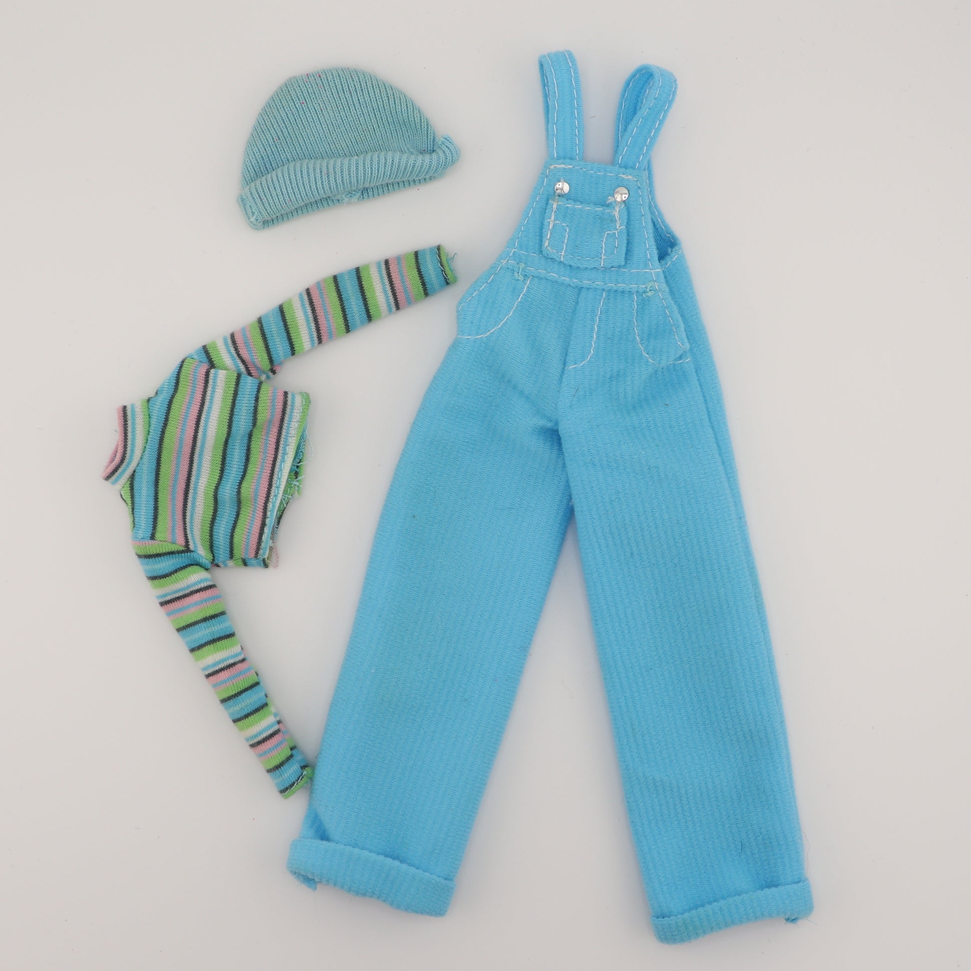 This outfit makes everyone whos in it look a little cooler. It's cool blue Barbie's outfit from 1997! Adorable corduroy overalls and a striped shirt. Best Fit for Twist N Turn Barbie body types.