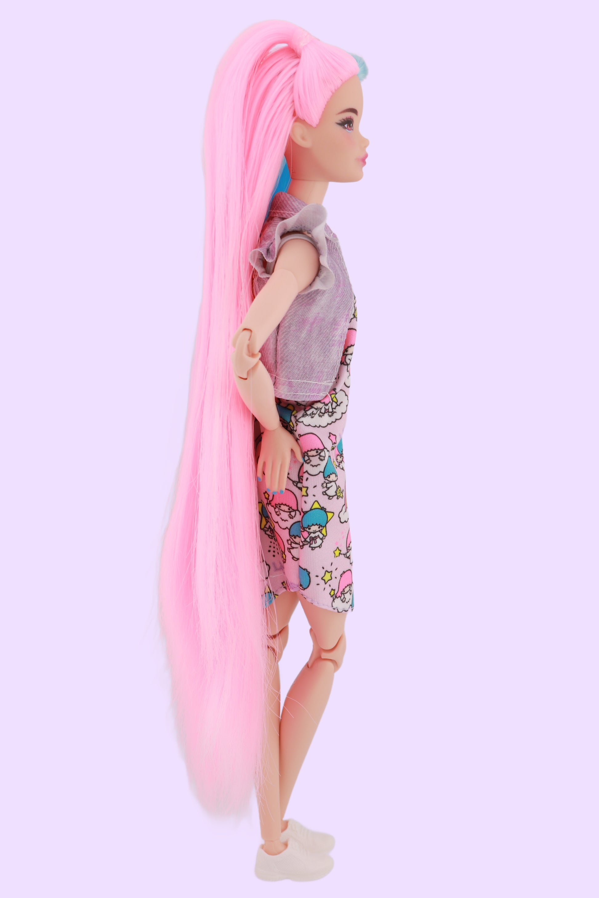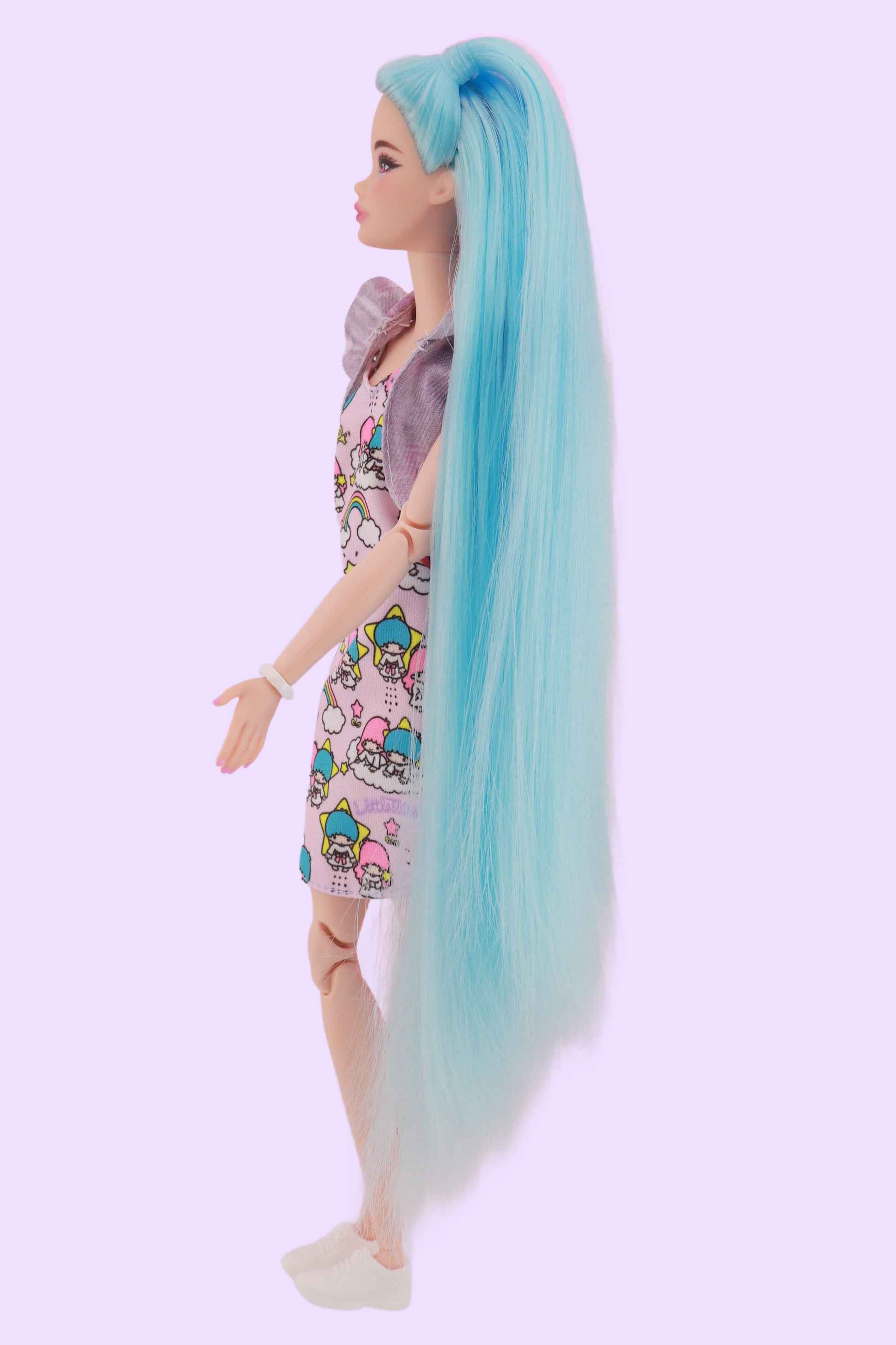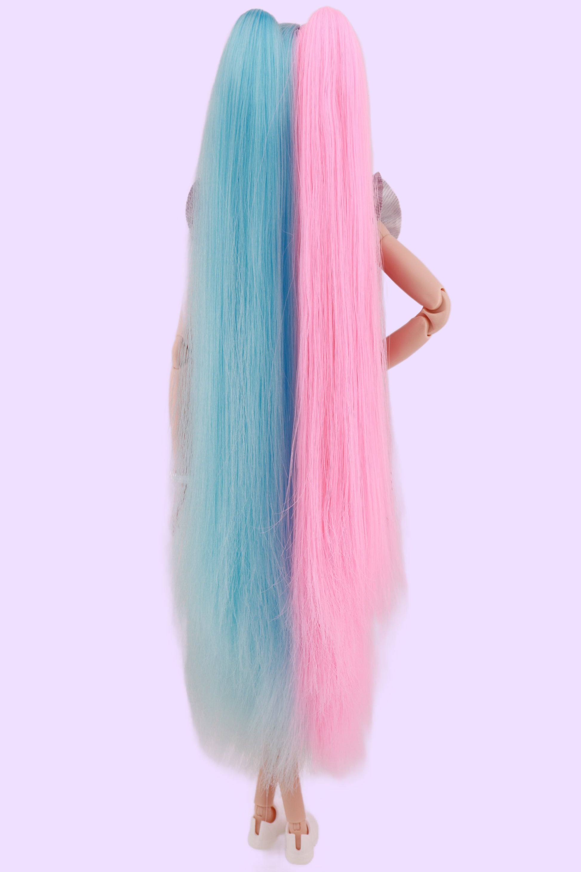This Odile was inspired by none other than Sanrio's Little Twin Stars! Odile has cotton candy split hair to reflect the sweet colors of Kiki and Lala. (Unicorno's not included!) Rerooted with 100% nylon hair that is the softest you've ever felt. Nails have been painted with acrylic and sealed.