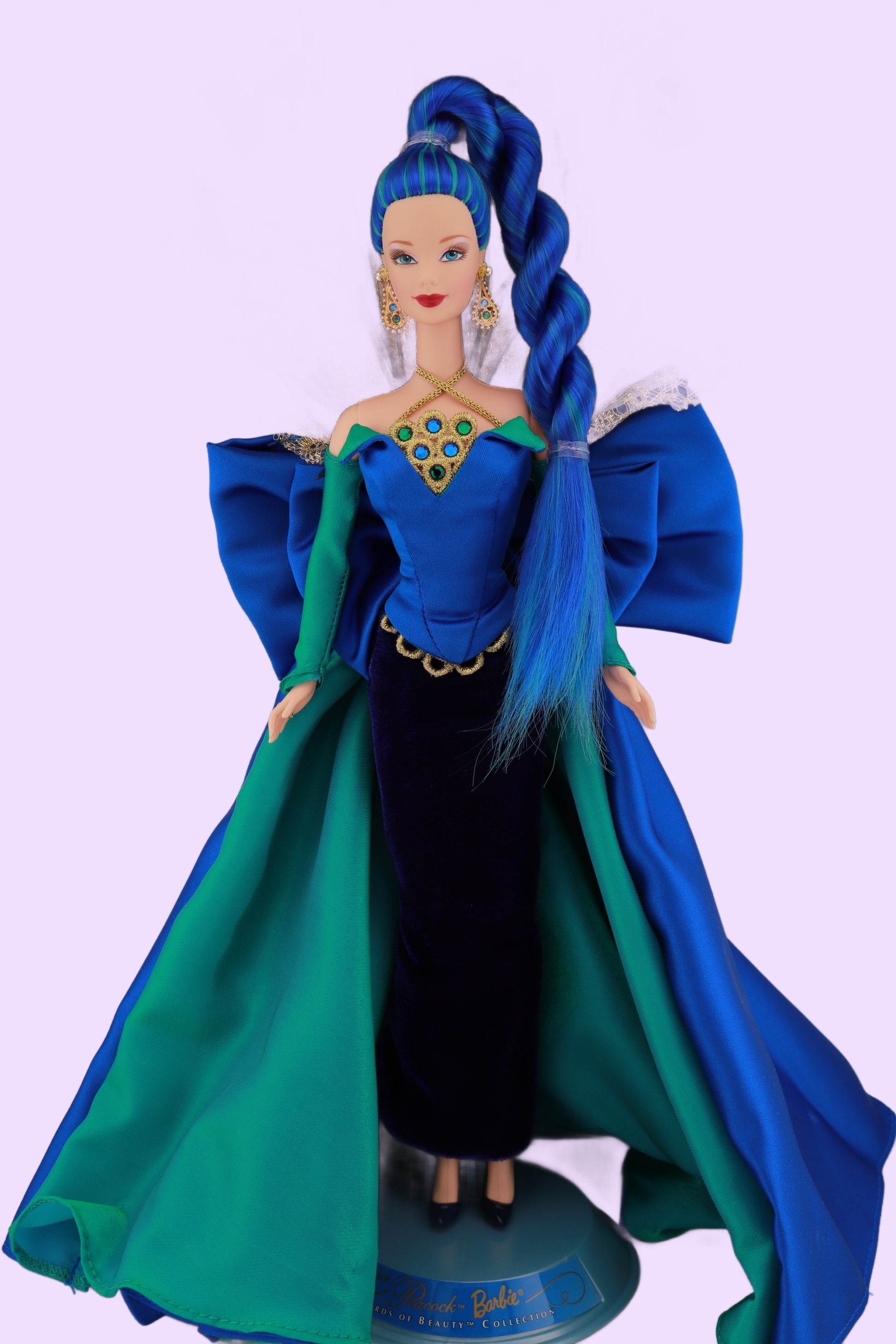 This beautiful doll is so hard to capture on photos. She is glamorous and so beautiful. I knew when I saw her I had to give her peacock hair to match her beautiful dress. She's been rerooted with 100% nylon hair. Stand is included.