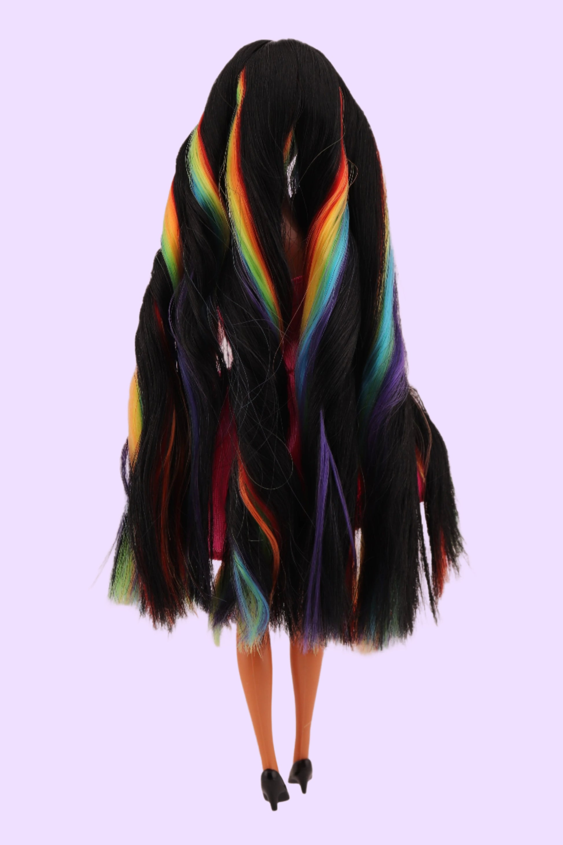 This beautiful Kira doll has been 100% rerooted with nylon hair that is crazy soft. Almost impossible to tangle. The silkiest black is her base color with a fun rainbow that goes all the way around her head! On a 90s Twist N Turn body type, perfect for most clothes in our store! No one else will have this doll as it is a custom one of a kind.