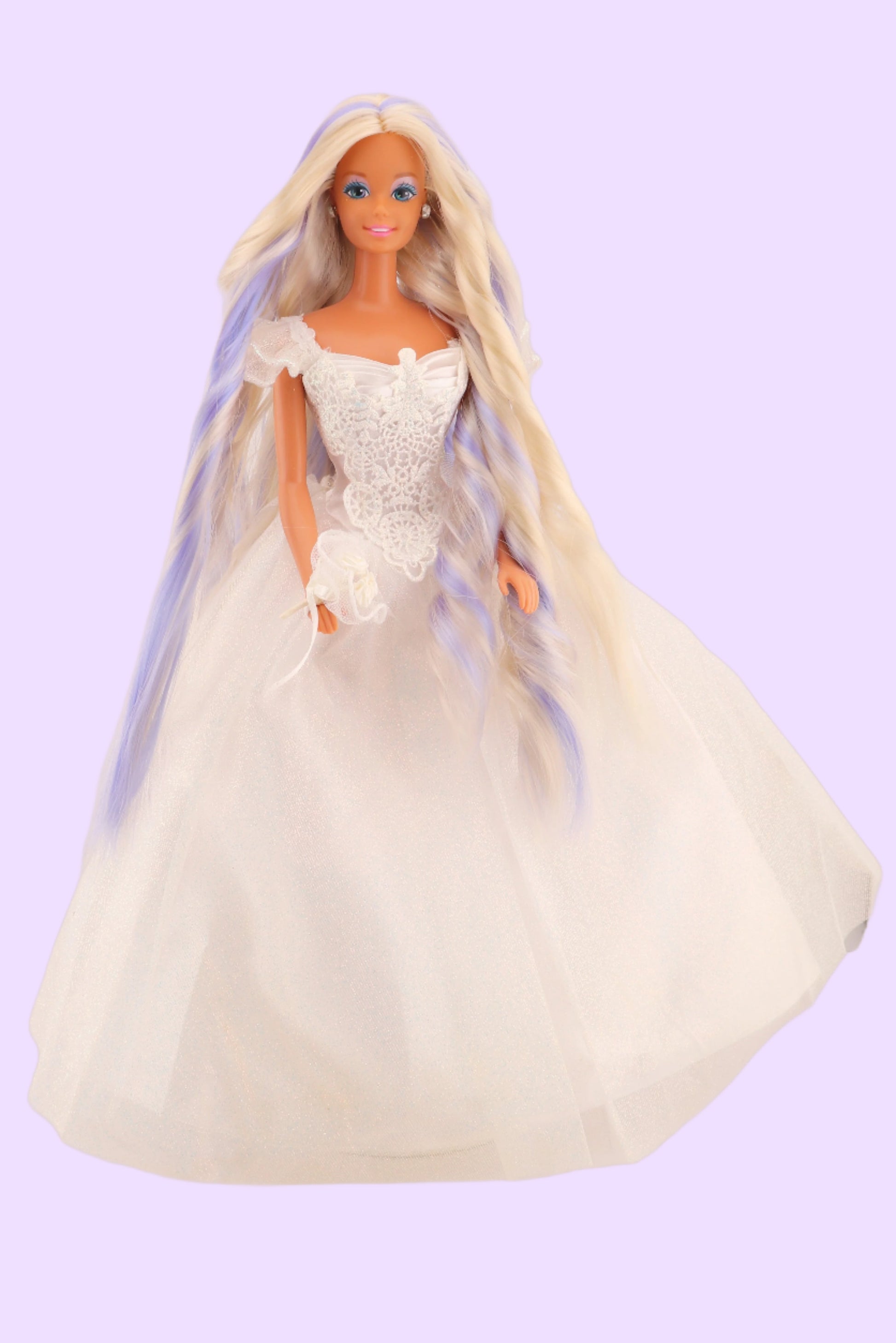 This is a one of a kind custom Barbie doll that has been rerooted with 100% nylon hair that is the softest you've ever felt on a doll. She's dreaming of a wedding full of glitter, fairies, and anything else you can dream up. Classic 90s Barbie is on a Twist N Turn style body that looks fantastic in any of our clothes. I am obsessed with her lavender makeup and the way it compliments her hair perfectly. She truly looks like an angel.
