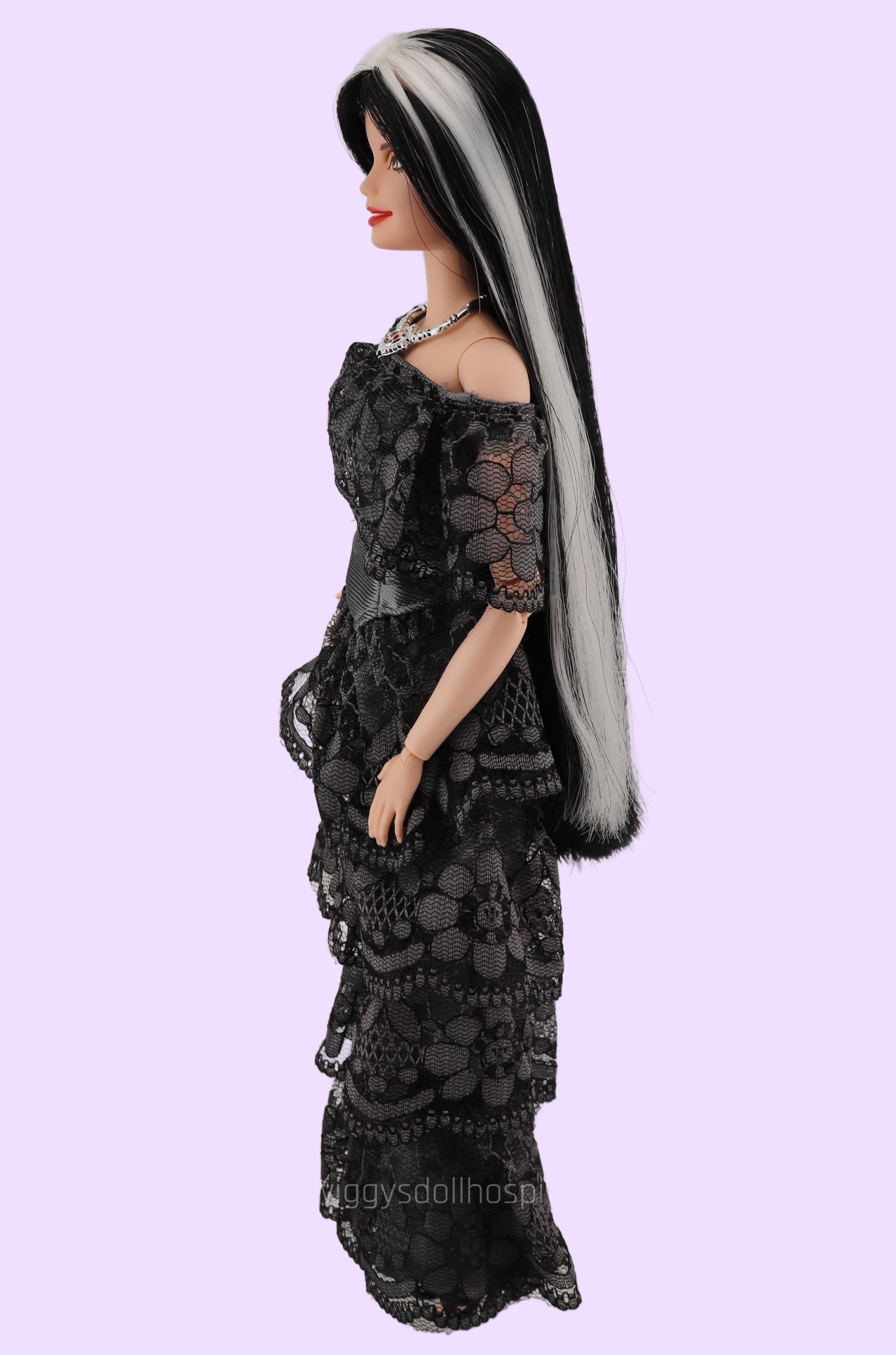 Inspired by the gothic subculture, I decided to make a goth barbie. This barbie used to be the Princess of the Portuguese Empire! She found that castle life didn't suite her so she left the tower in pursuit of a life more reflective of her truest self. She's been rerooted with 100% Nylon hair in black and white. She's got a brand new made to move body that makes her fully posable. Her necklace is the only thing she decided to keep from her life as a princess. She's a powerful force to be around and absolutely one of a kind. Her dress is a genuine Barbie dress that has been dyed black.