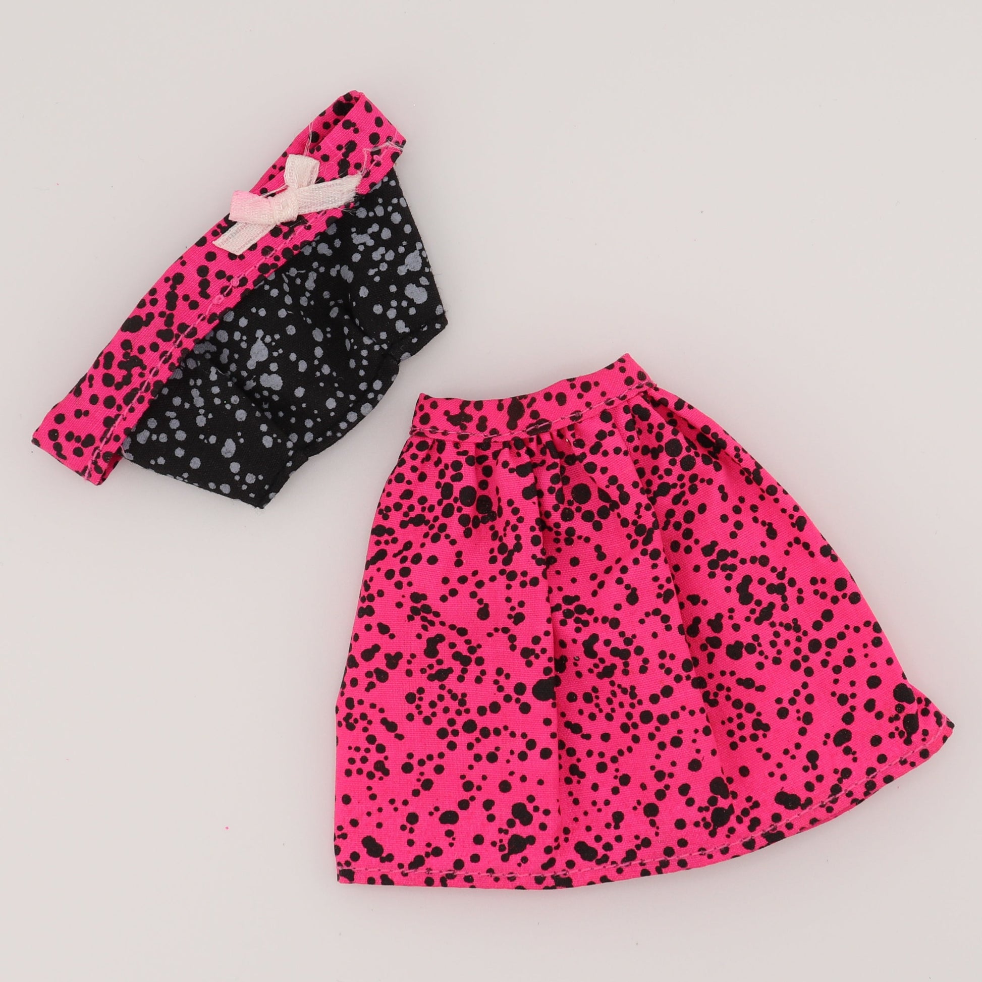 This is an adorable outfit with a hot pink background and black spots on the skirt and crop top. Sweet little bow on the top. Originally sold in a fashion pack from the 90s. Best fit for Twist N Turn Barbie body type.