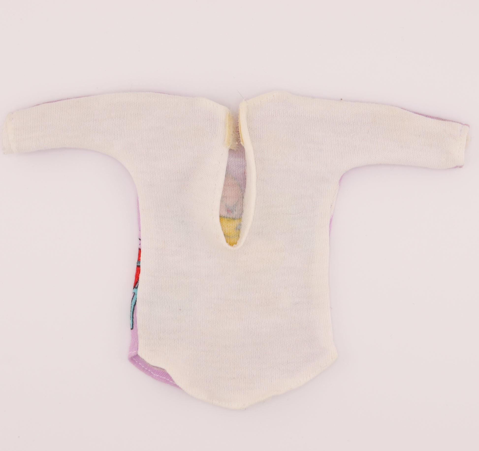 This is an adorable lavender, long-sleeve shirt that has Minnie Mouse on the front singing some karaoke. Small staining on the camera left arm.