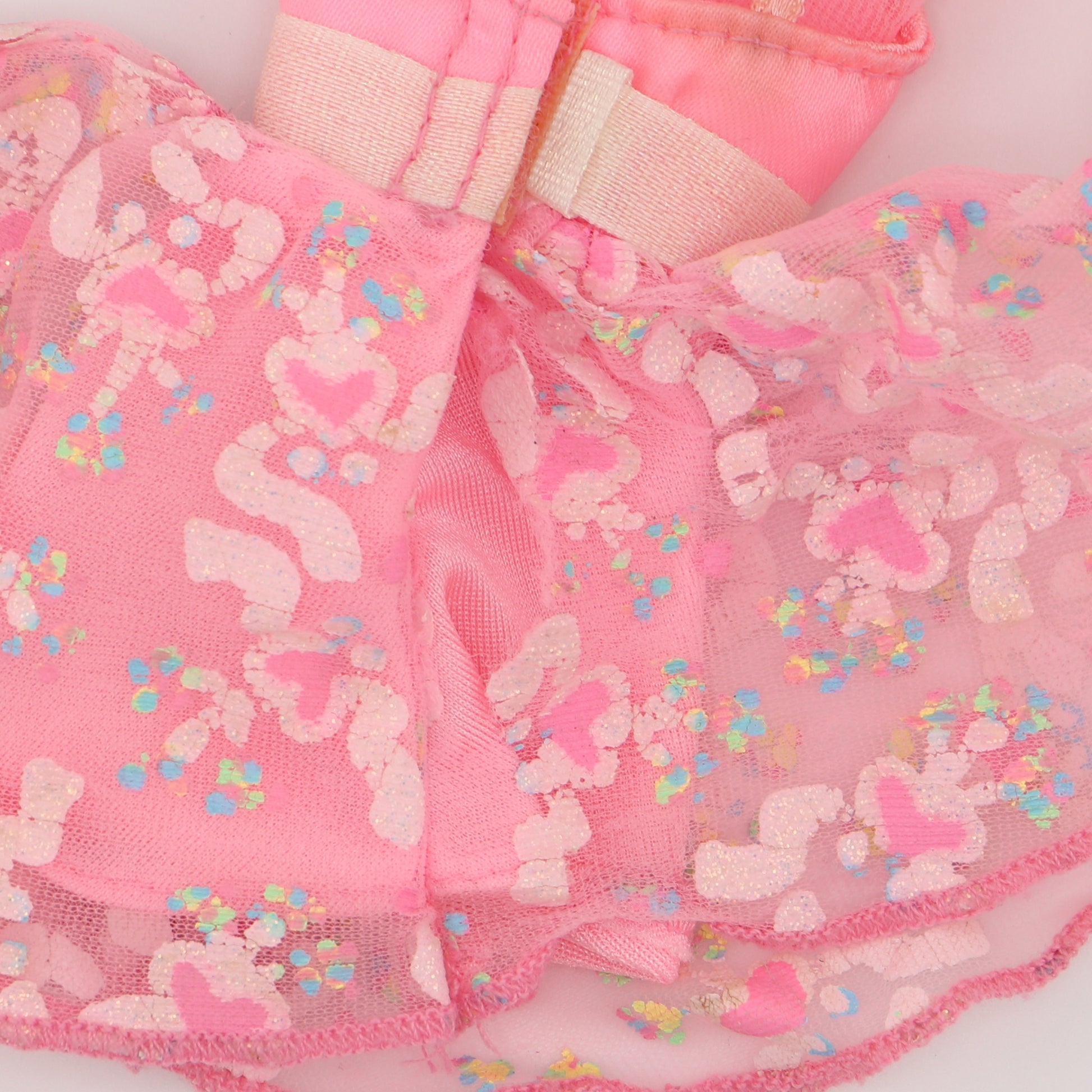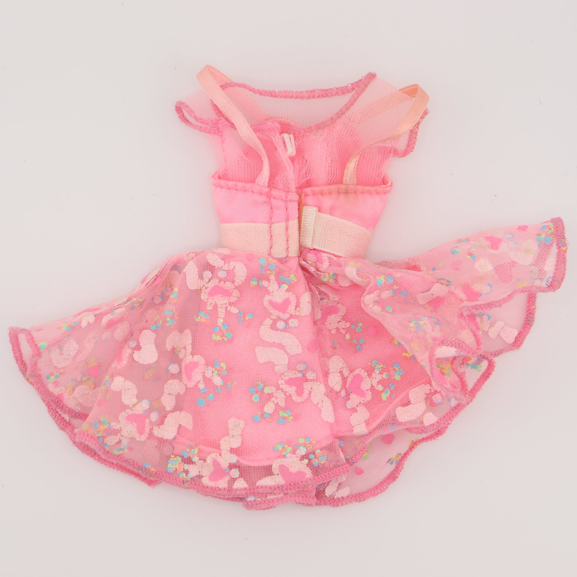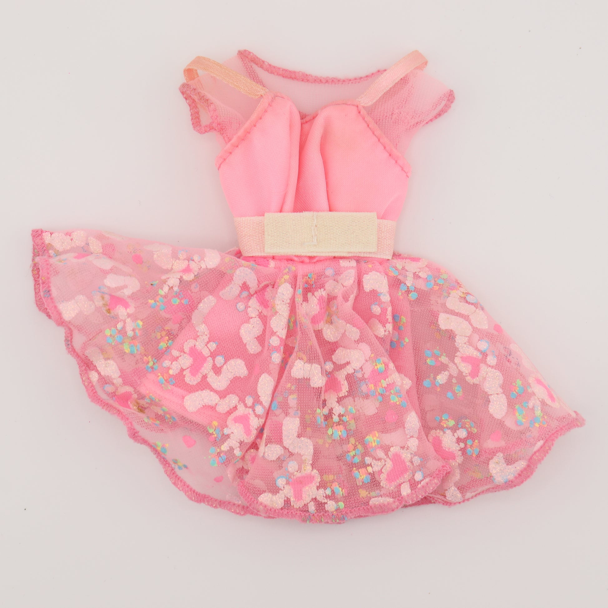 This is the original dress from the 1995 My First Tea Party Barbie. It does have a tear in the back worth mentioning. I tried to take a photo of it. It's invisible from the from and the tear is just along where the fabric meets the velcro. There's also a small hole in the lace. Its in the last photo. Can you find it? This dress is too cute for me to not put up. Best Fit for Twist N Turn Barbie body types.