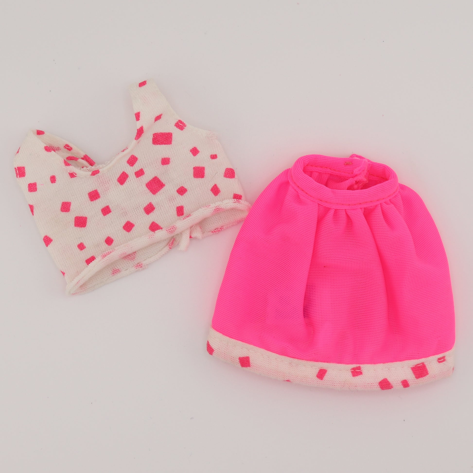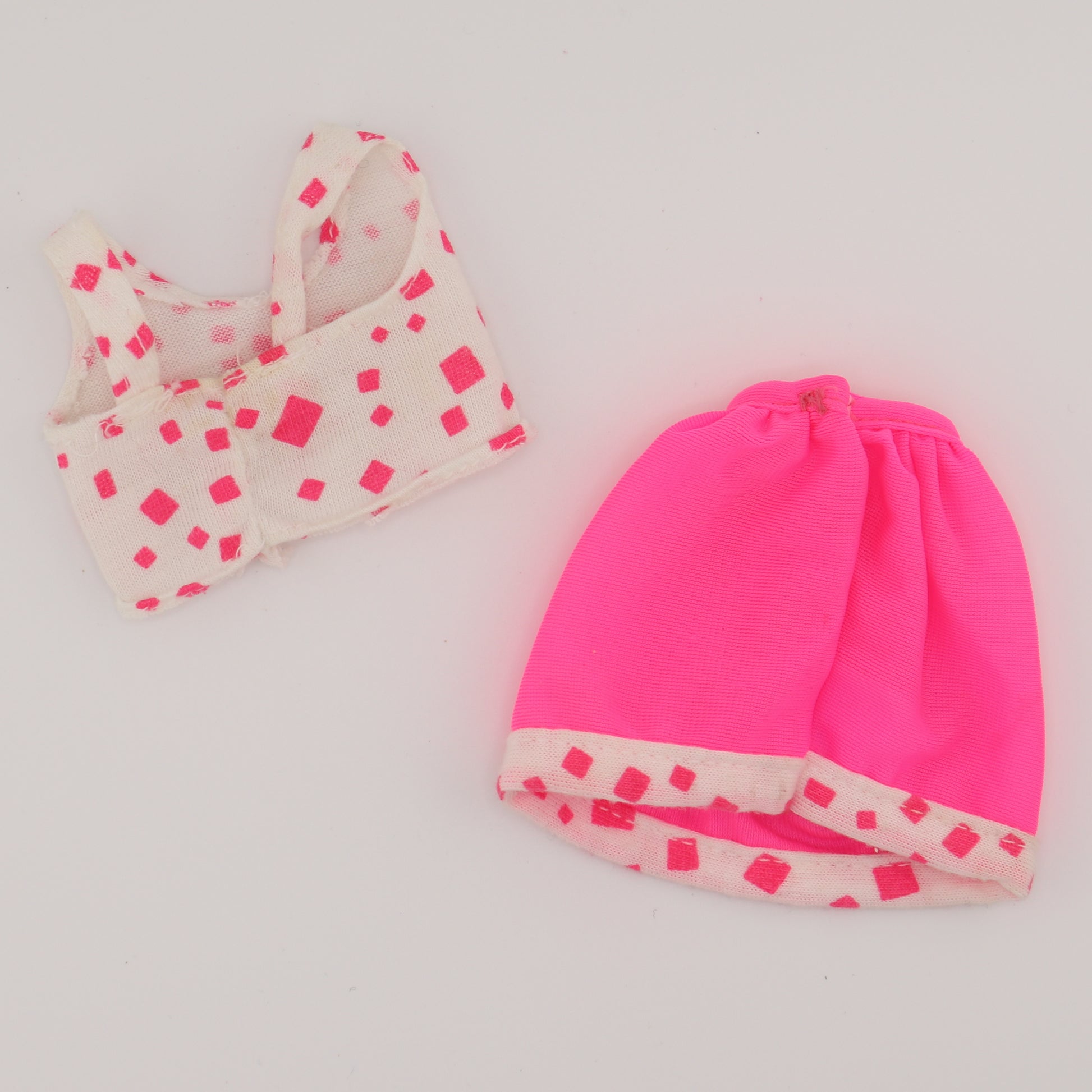 Oh how I love the 90s. This fashion pack is a staple in my personal collection. Cropped top and mini, hot-pink skirt is just the vibe I'm looking for in a pink box babe. Originally sold in a fashion pack from the early 90s. Best fit for Twist N Turn Barbie.