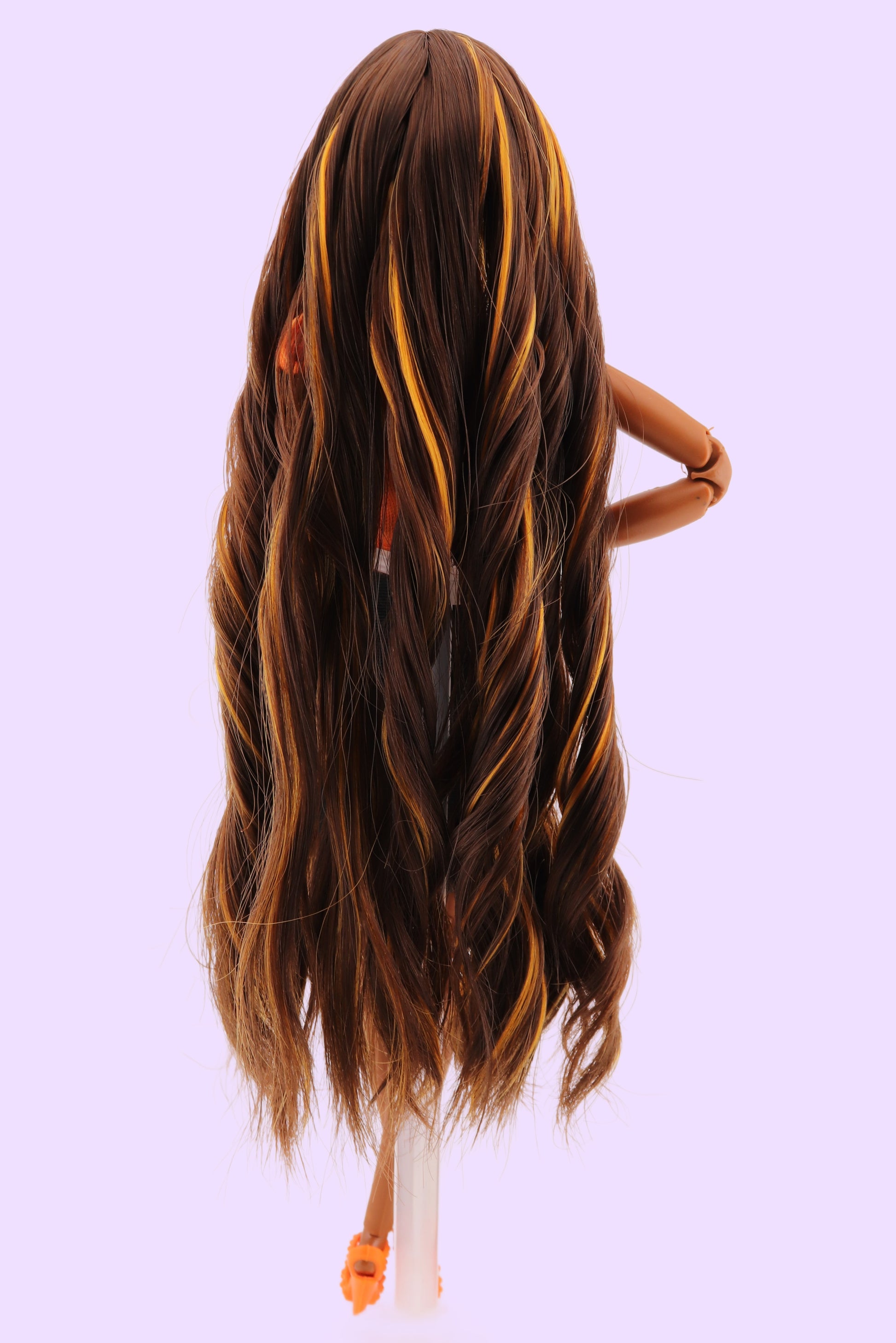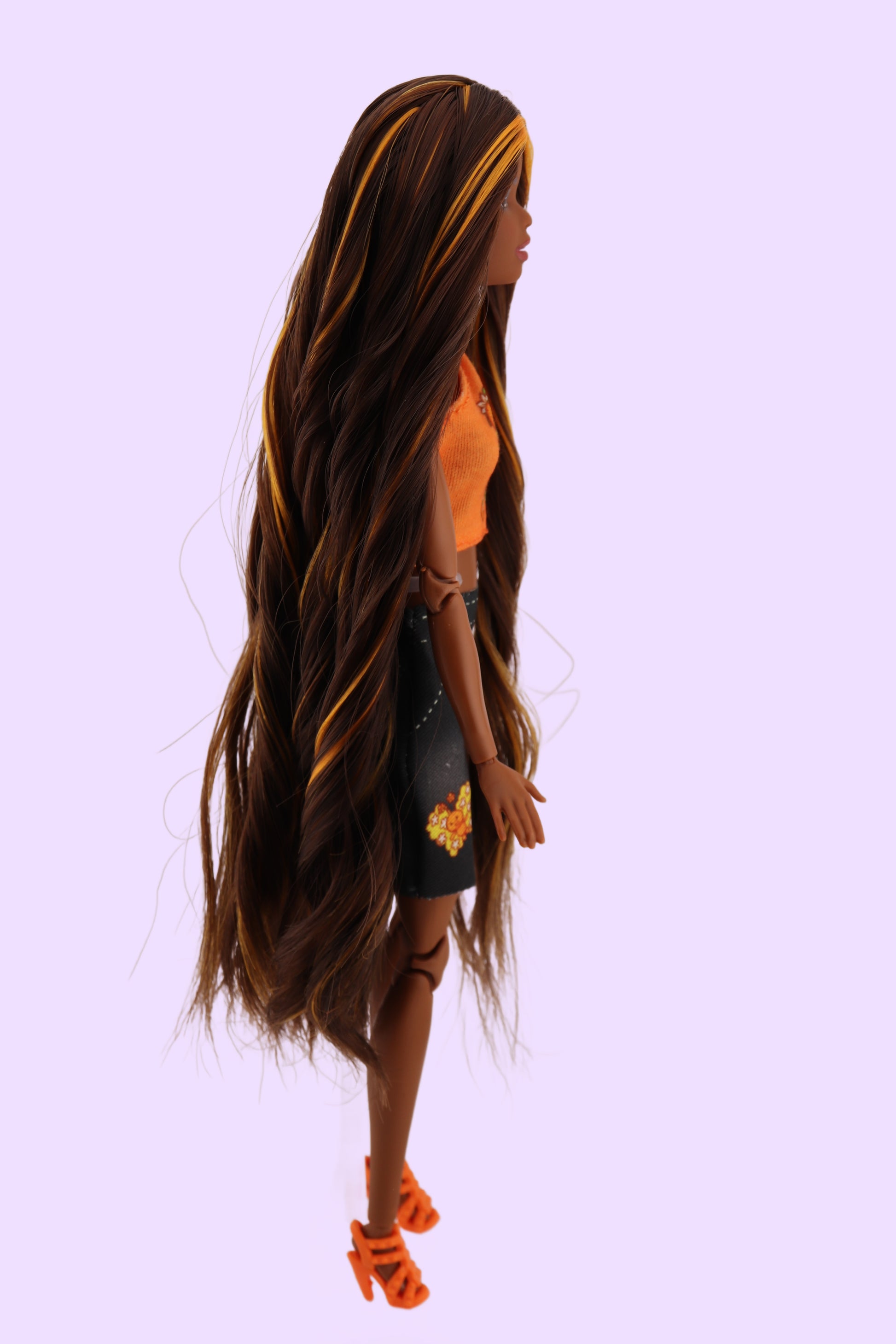 This custom Barbie has been rerooted with chocolate brown hair with orange highlights! She's wearing a fashion pack that was released in collaboration with Strawberry Shortcake, representing Orange Blossom! She comes with a second outfit as well; pictured. On a made to move body so you can pose her any way you'd like!