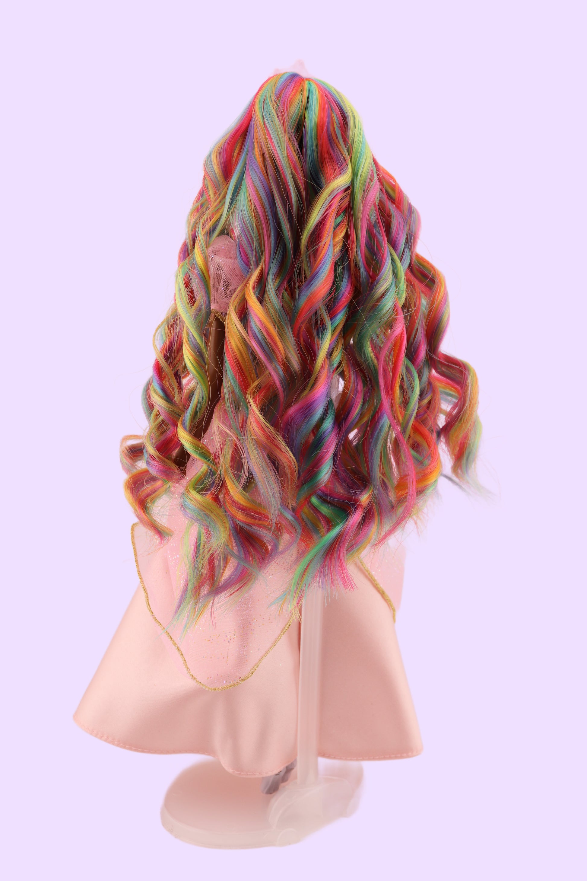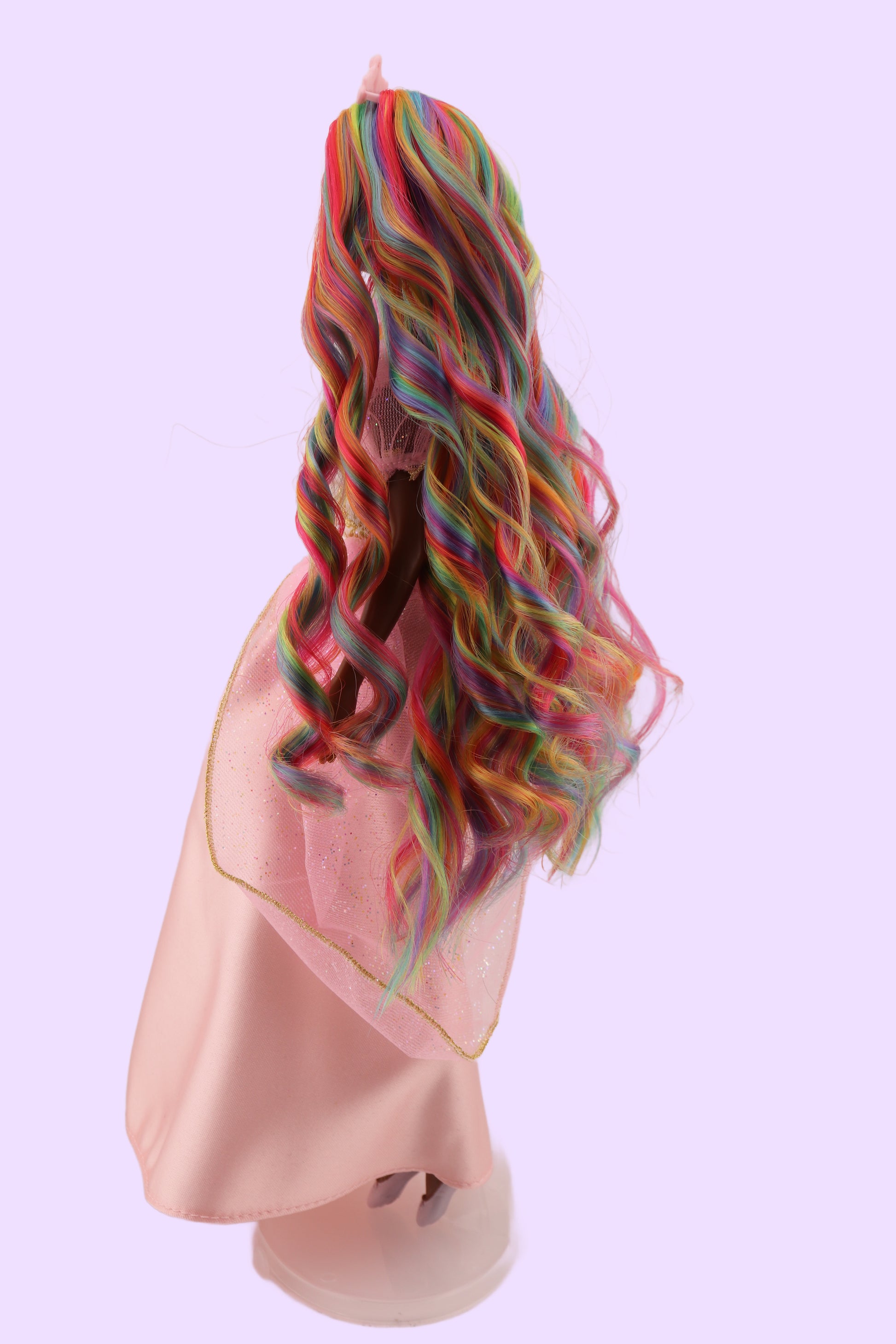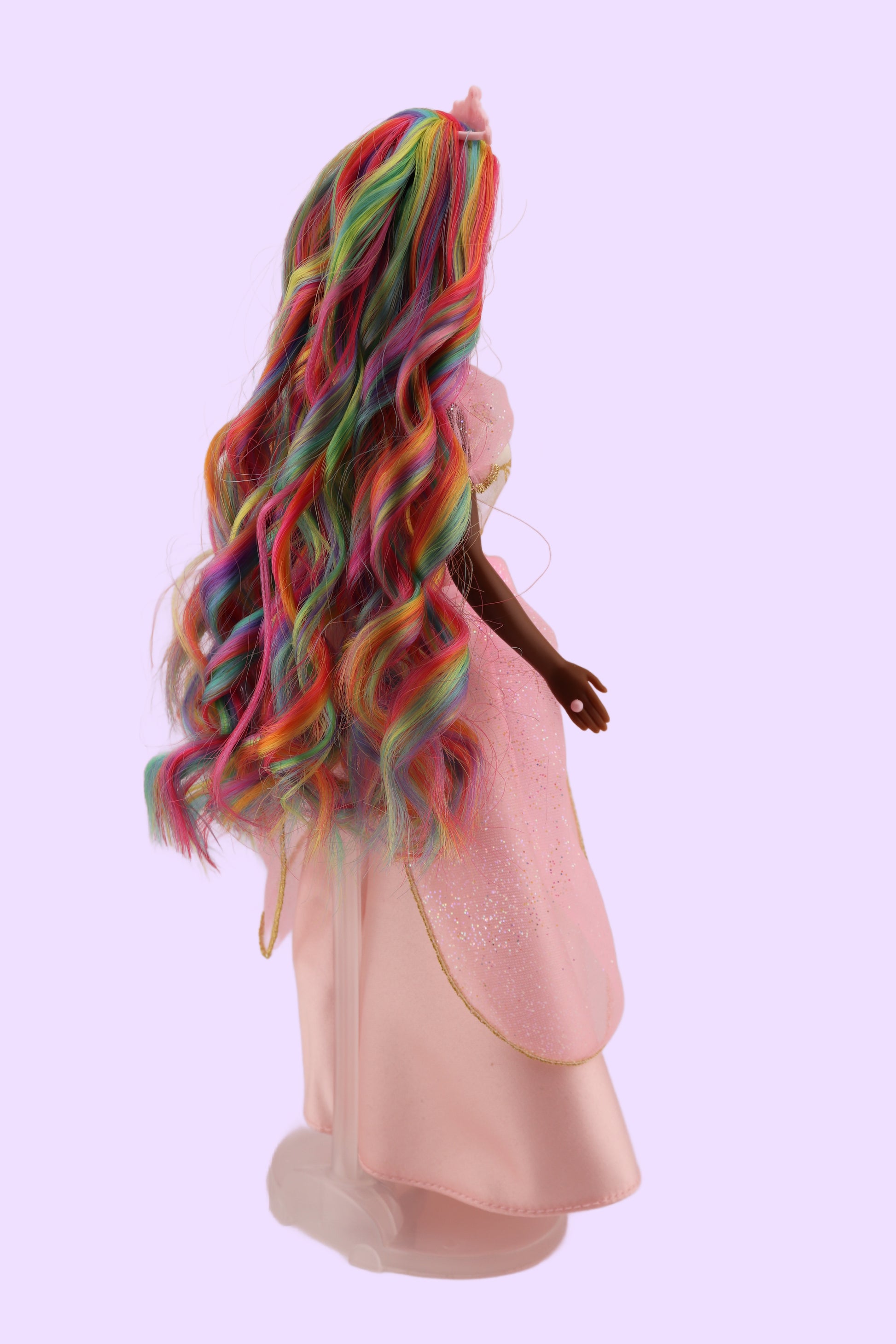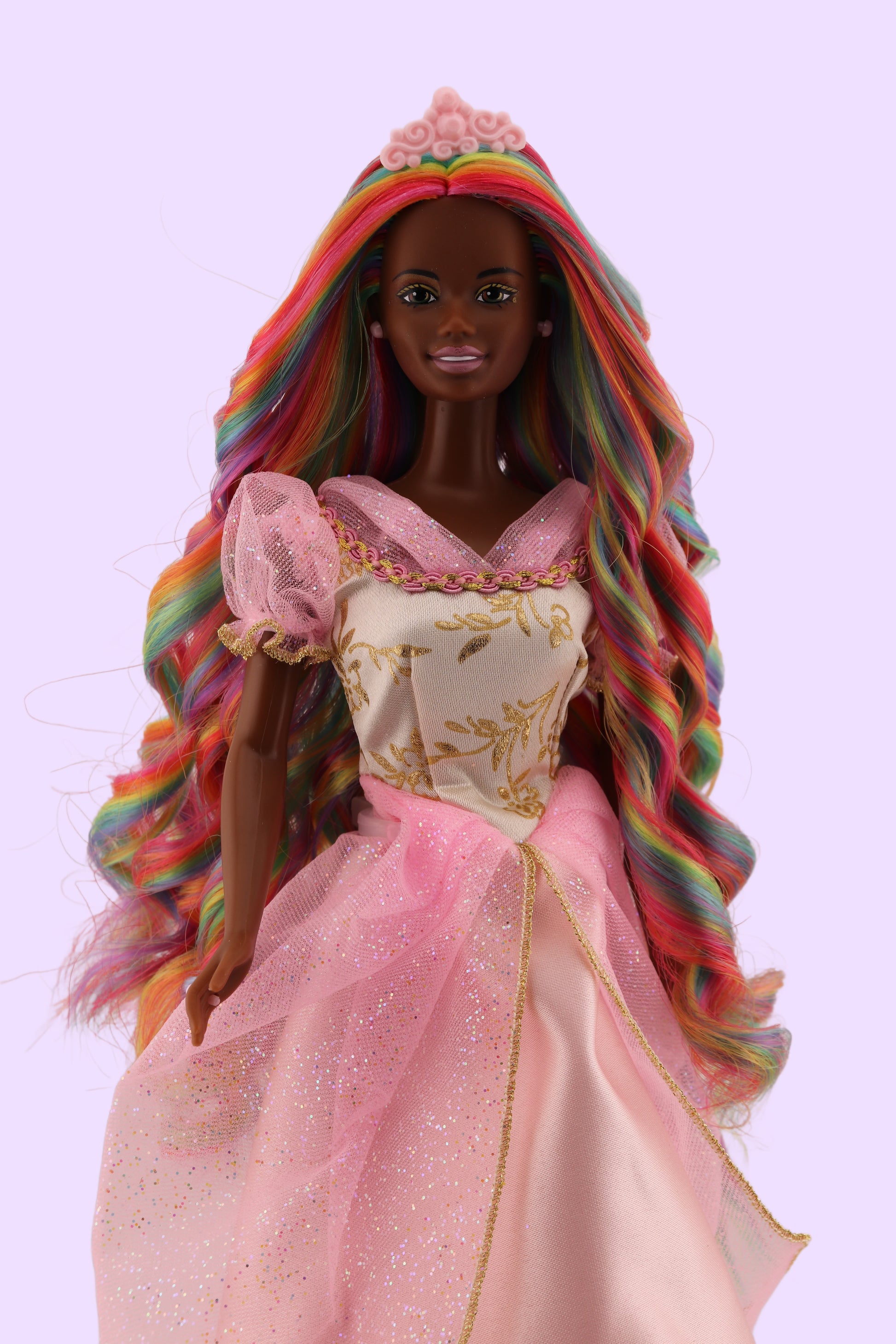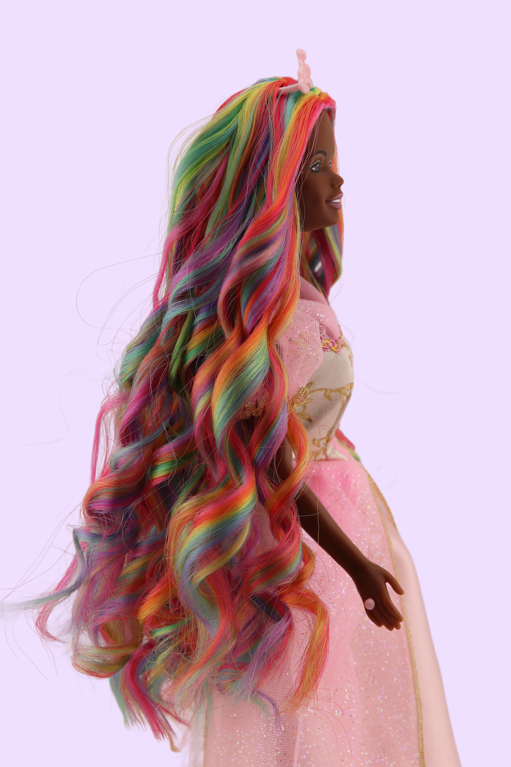 This was originally a brand new 2000 Princess Barbie. She has been fully rerooted with 100% Nylon hair that is the softest you've ever felt. She has the beautiful Christie face that is a personal favorite of mine. Her shoes are permanently attached to her so you will never lose them! Hair curls will stay as long as you keep them preserved but can be easily styled with boiling water.