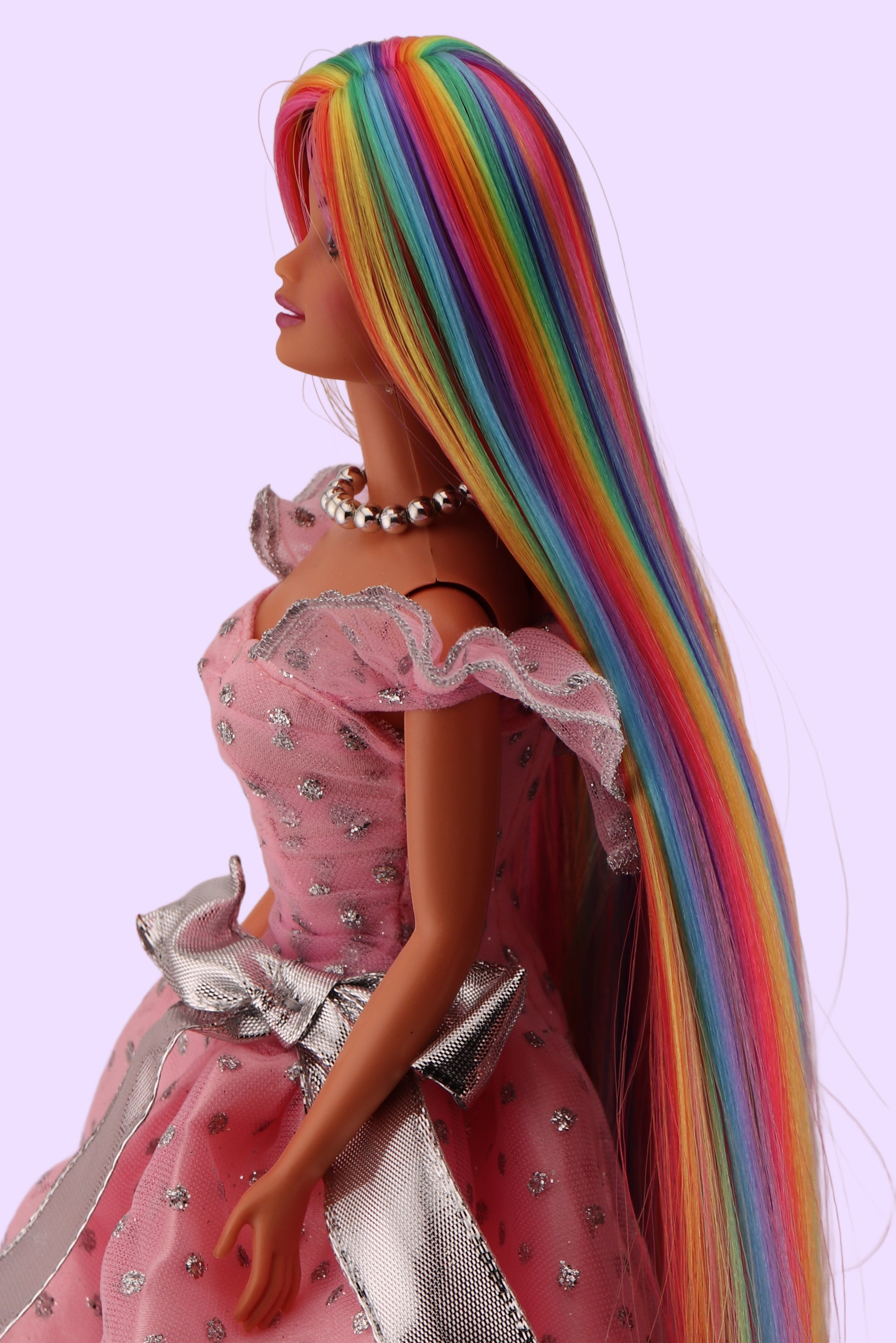 This was originally a new 35th Anniversary Barbie sold in 1997. Her light makeup inspired me to give her a truly beautiful pastel rainbow for hair. She's been rerooted with 100% nylon hair that is the softest you can find. Comes with all original accessories.