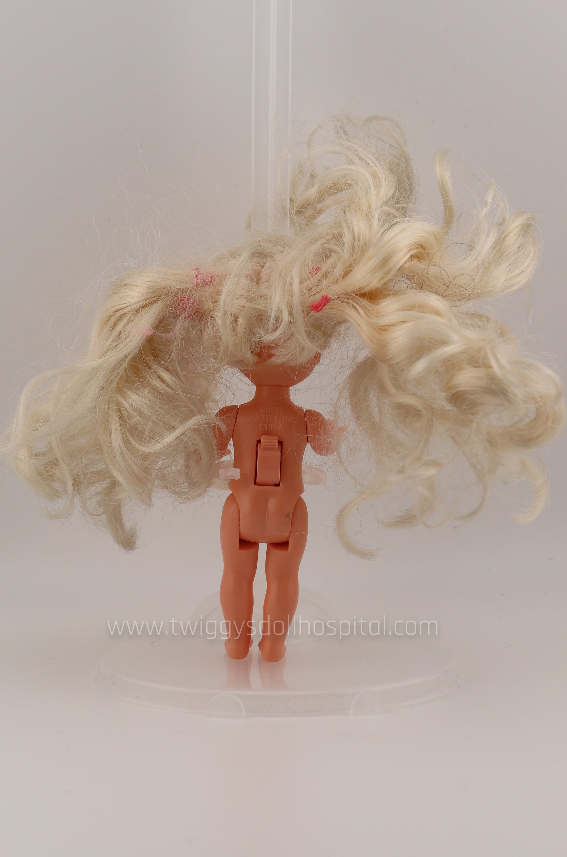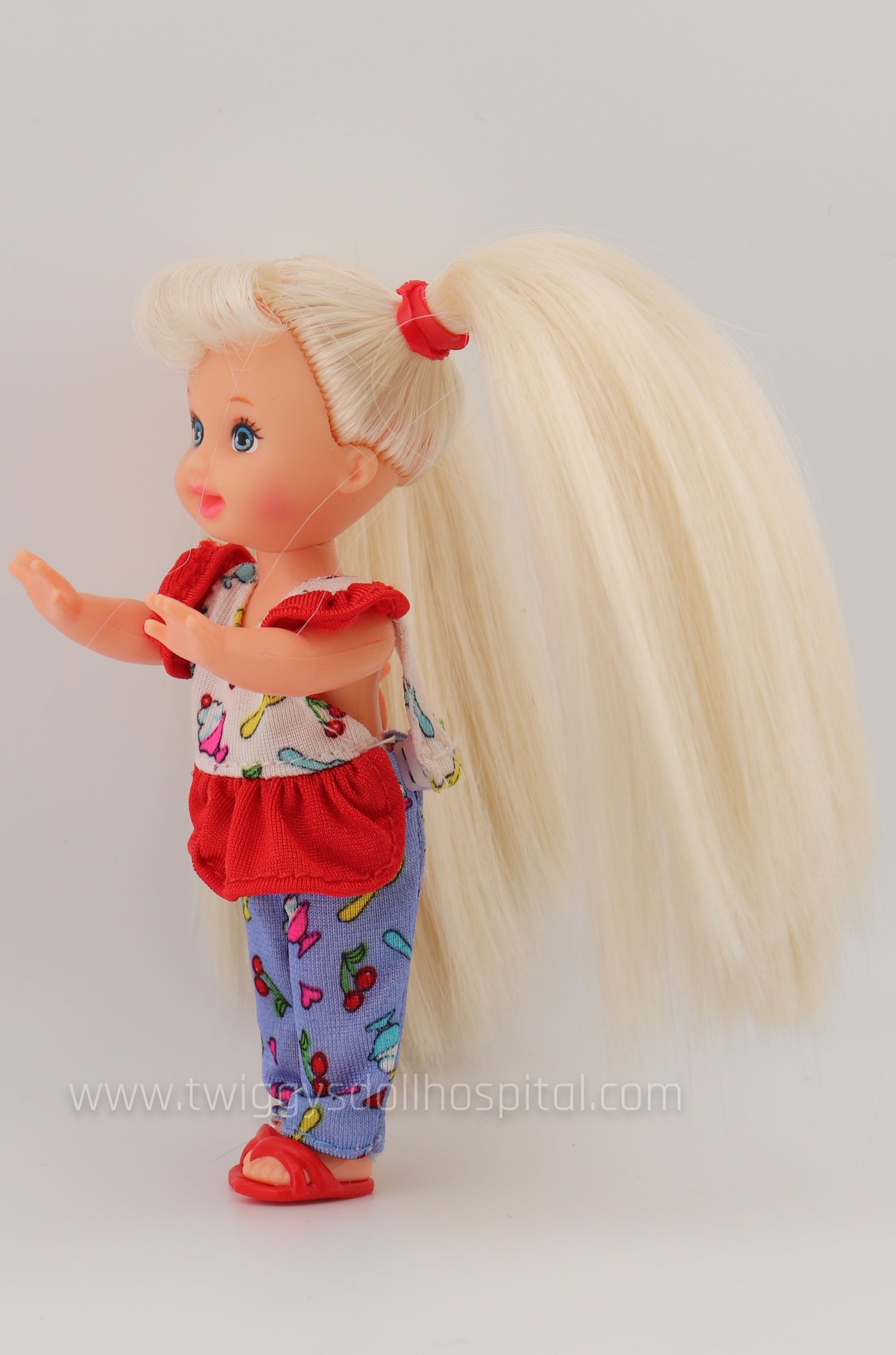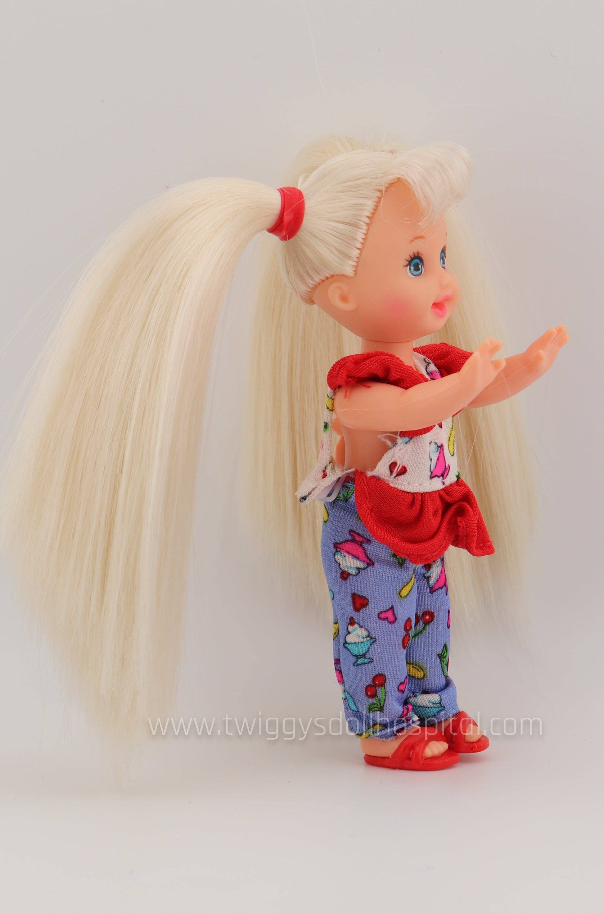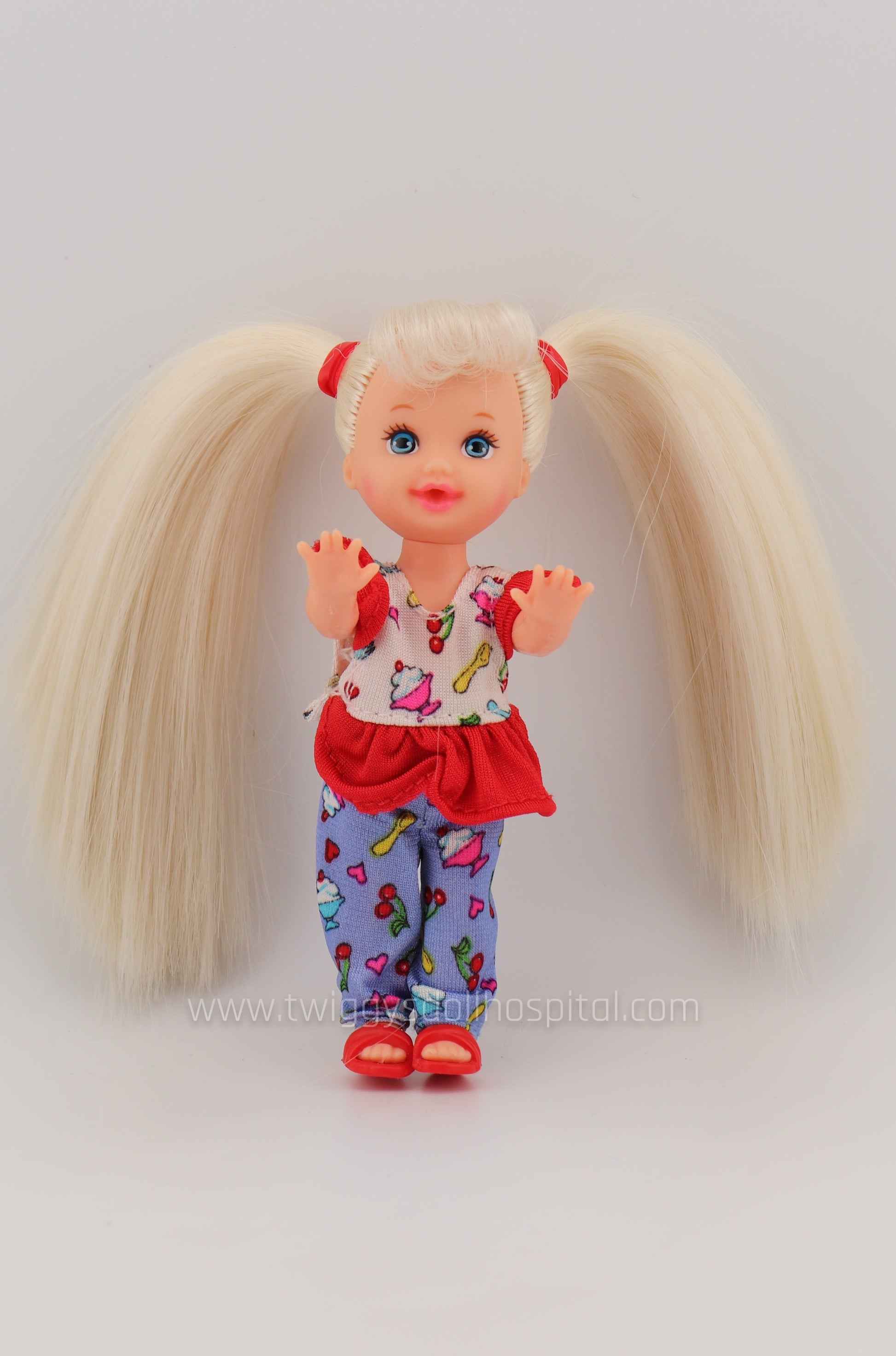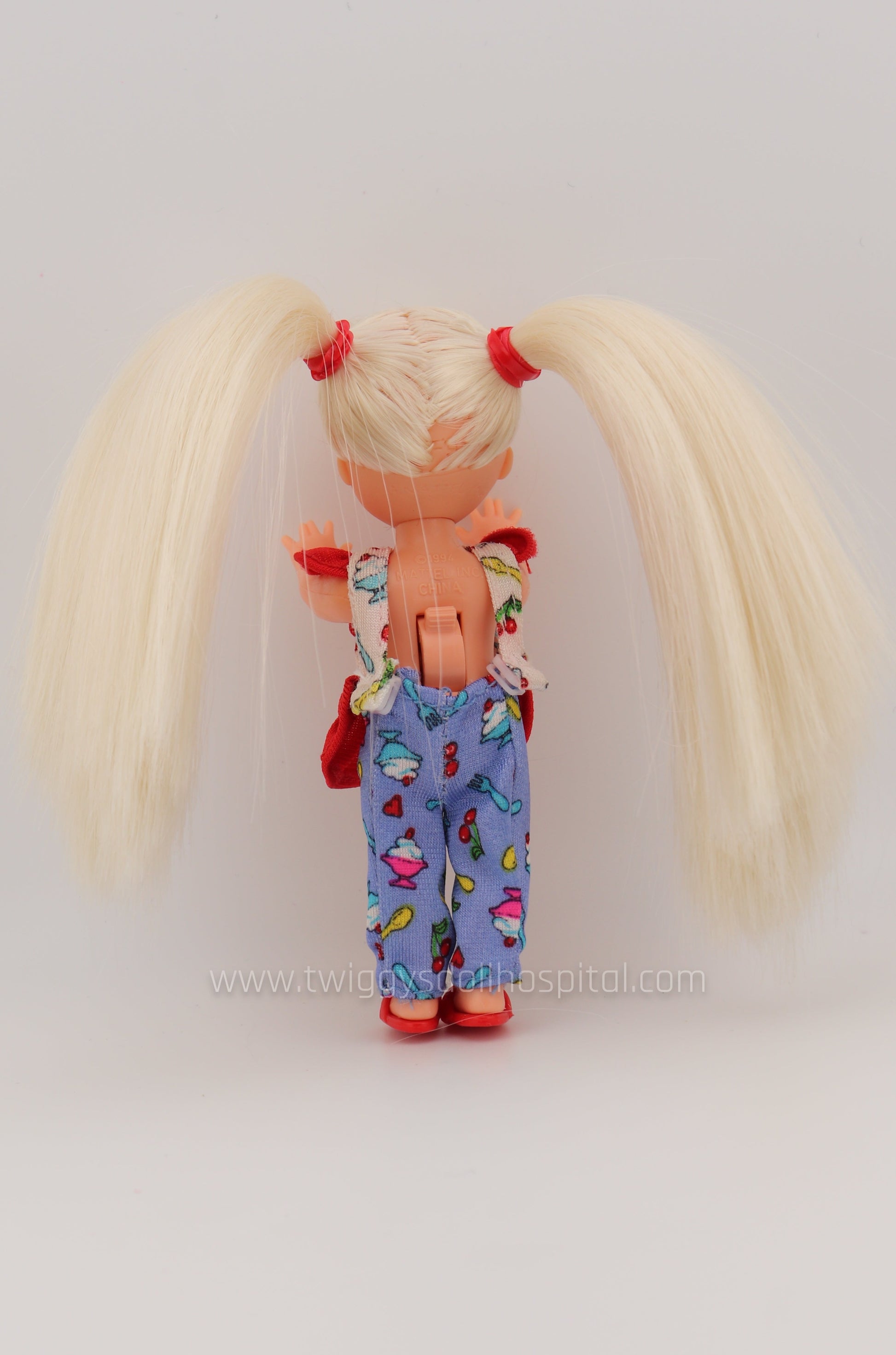 This adorable Kelly had long blonde pigtails that are so soft. Her arms are attached to a lever in her back that moves them up and down for her so she can do a lot of motions! She's dressed in the Eatin' Fun Kelly's original outfit.