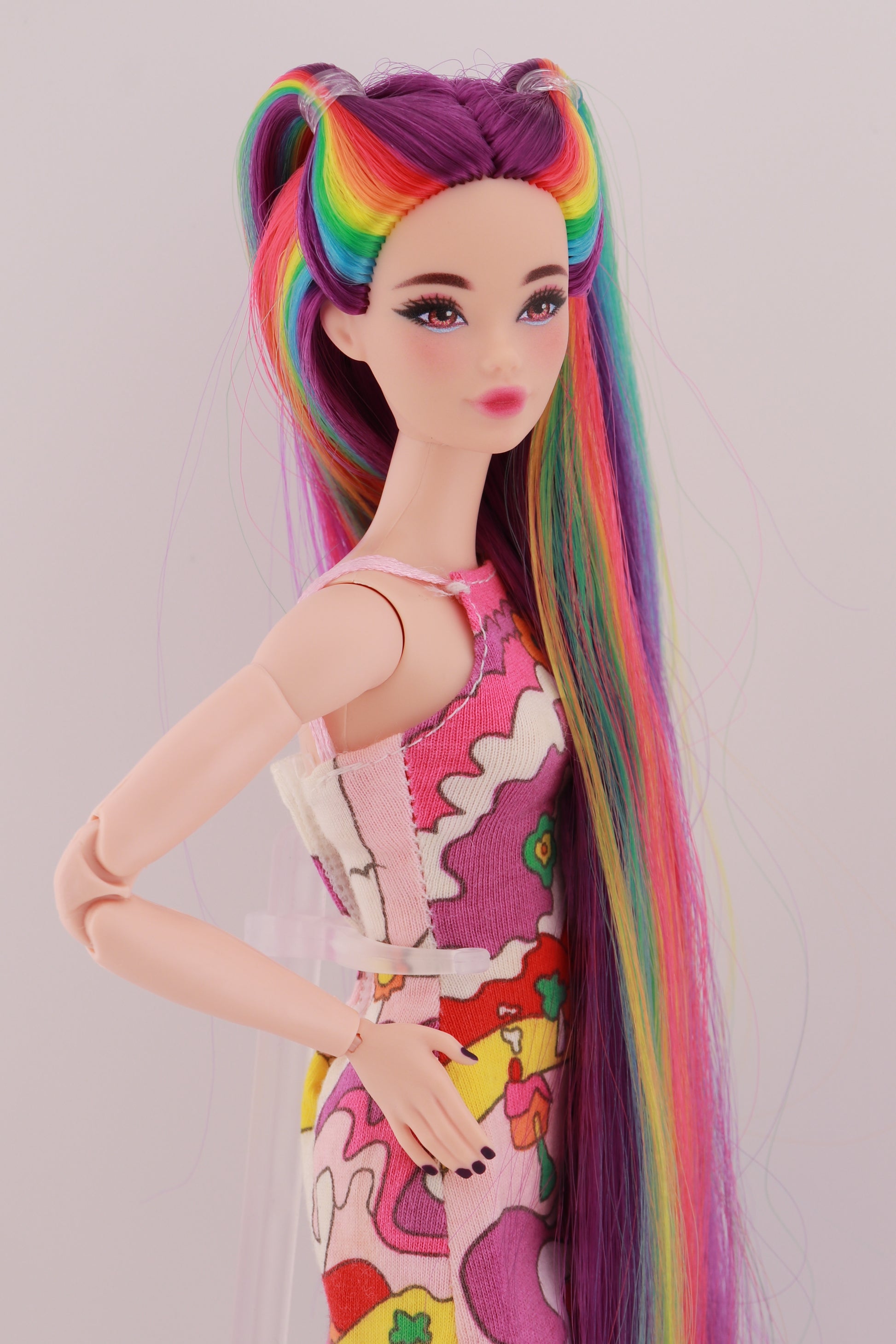This Odile has had a total makeover at the doll hospital! She's traded her fin in once again for a made to move body. Her hair has been rerooted with 100% nylon in a warm purple with a peek-a-boo rainbow! This doll makes me so happy when I see her. I had a blast making her and hope you like her too. She's wearing a 2001 Sunshine Day Barbie dress.
