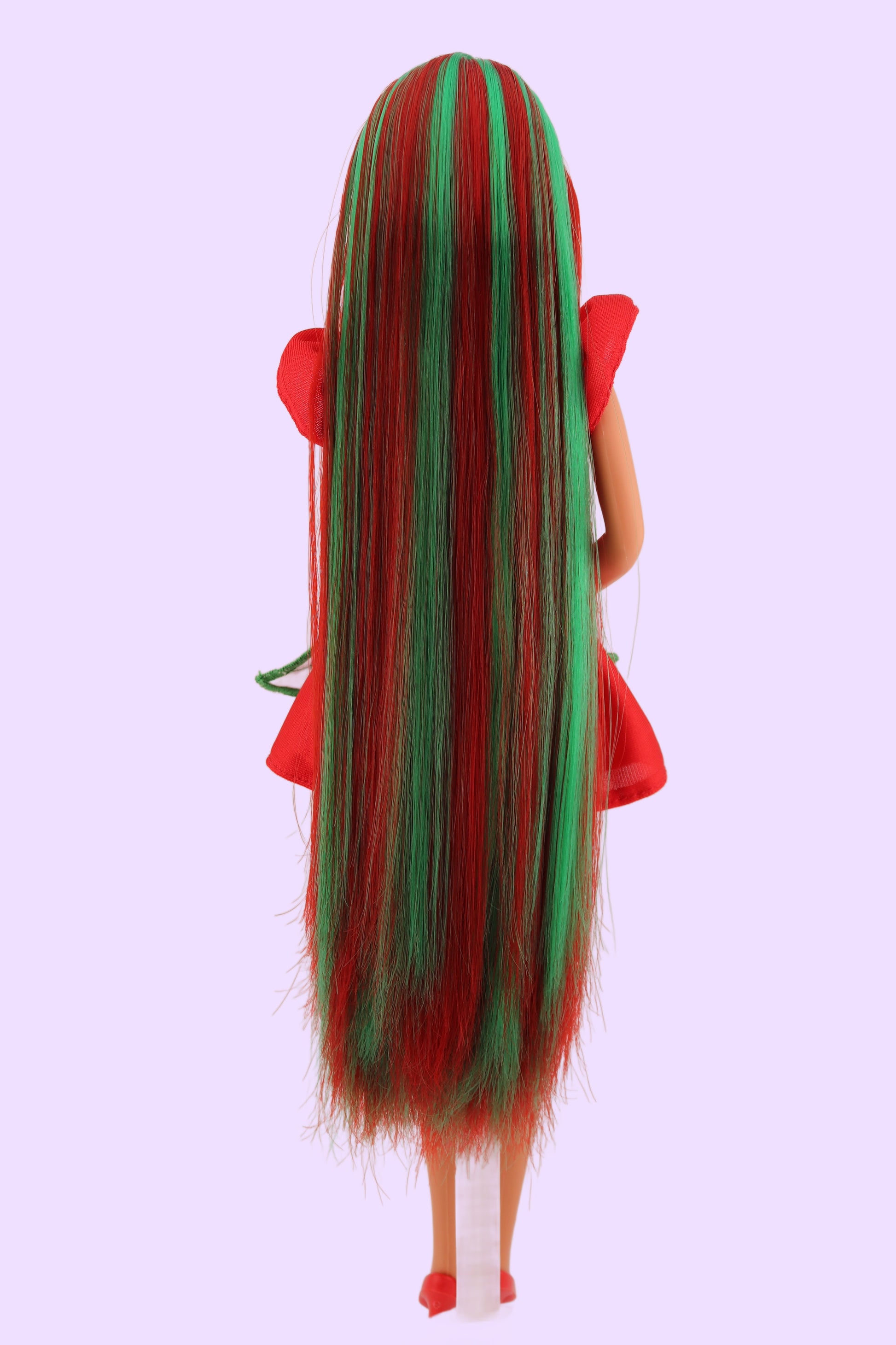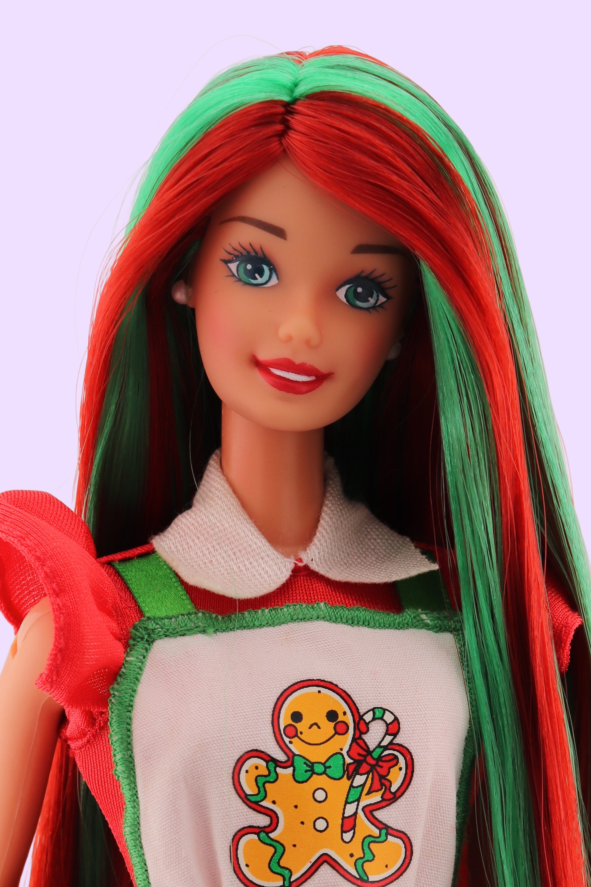 This was a brand new Holiday Treats Barbie that needed to stretch her limbs after being in the box since 1997! I knew I had to give her Christmas hair when I saw her outfit. She's adorable and has stripes of green and red nylon hair rerooted all throughout. Custom rerooted Barbie that no one else will have!