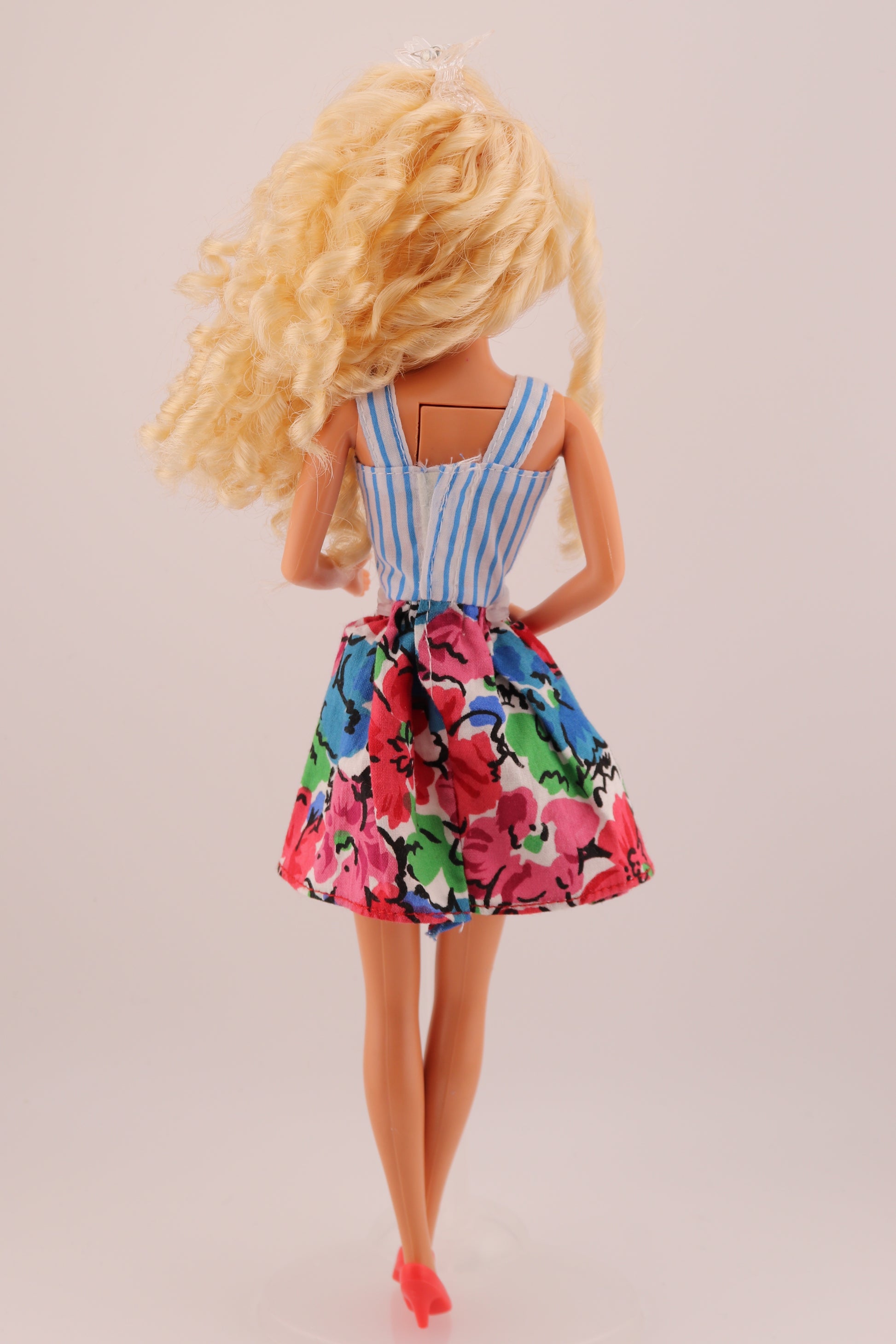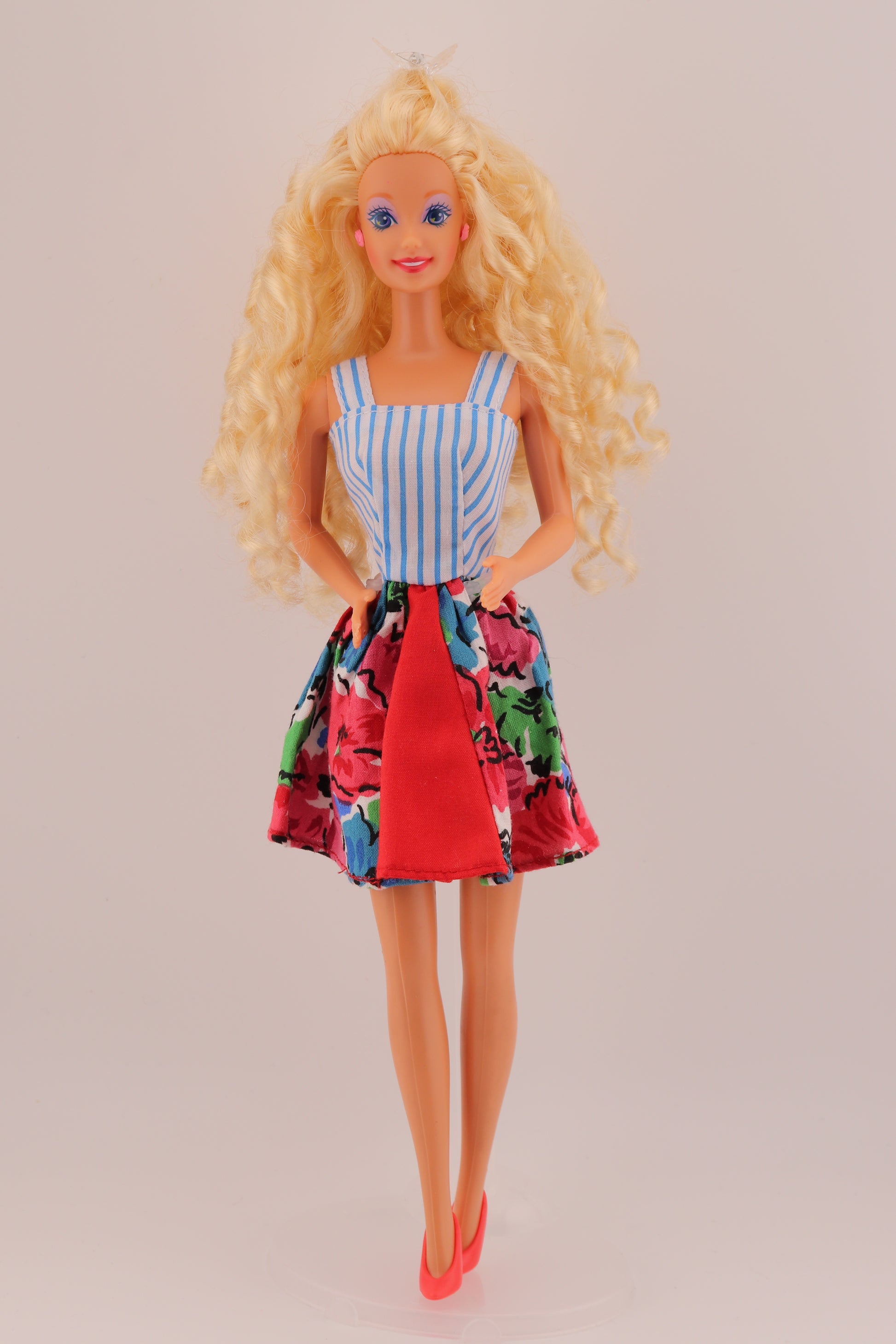 This Teen Talk Barbie has had a much needed stay at the doll hospital. She received a full hair treatment to restore her shine. Her curls have been set meaning they won't budge unless they're exposed to heat or humidity. She's dressed in authentic Barbie Teen Talk fashions.