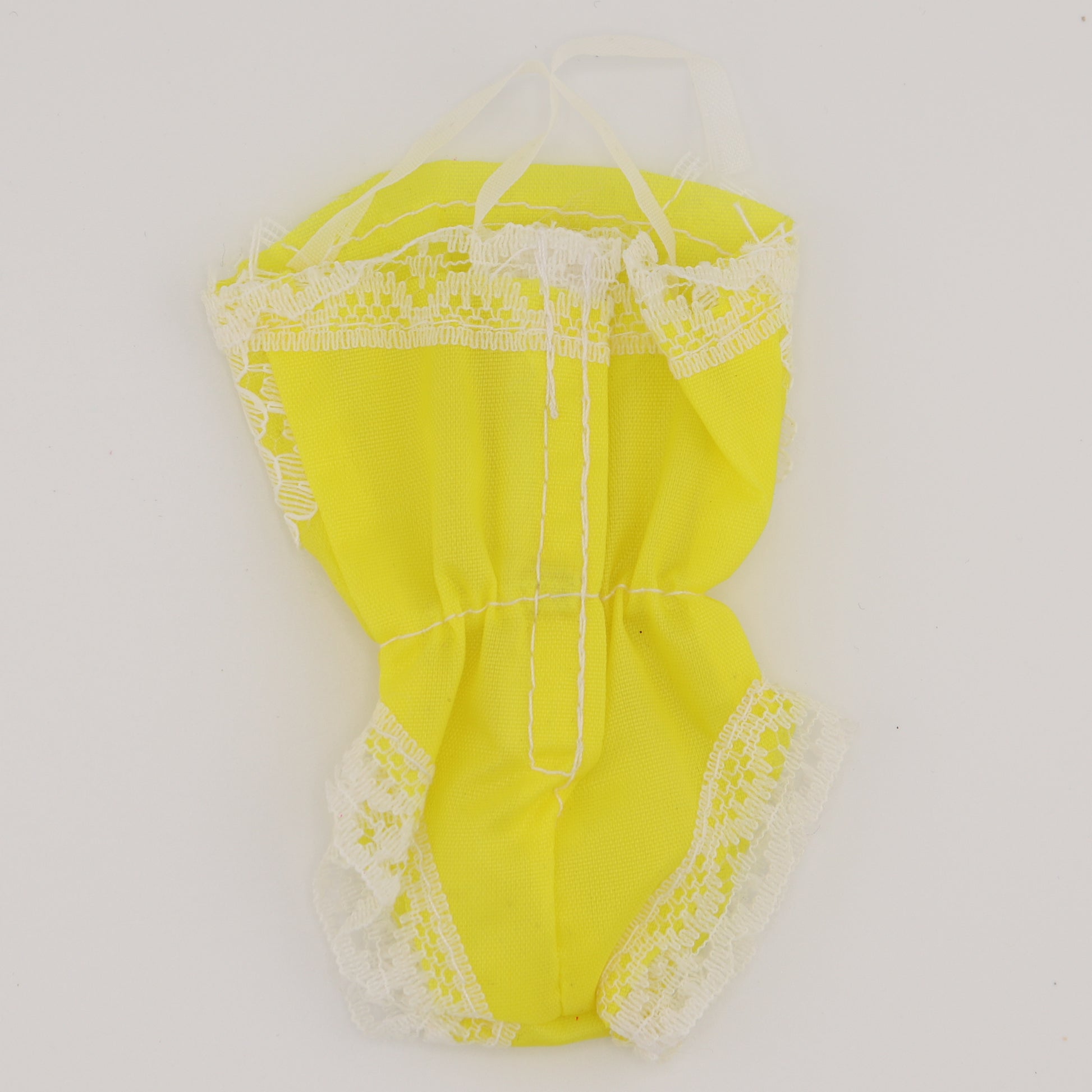 This is yellow and white Barbie lingerie sleep set. I'm not 100% sure that it is official Barbie but I can't quite imagine who else would have left it around the doll hospital.
